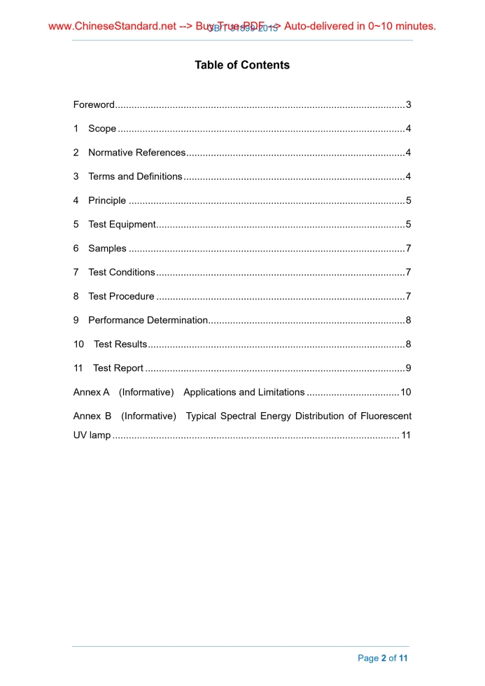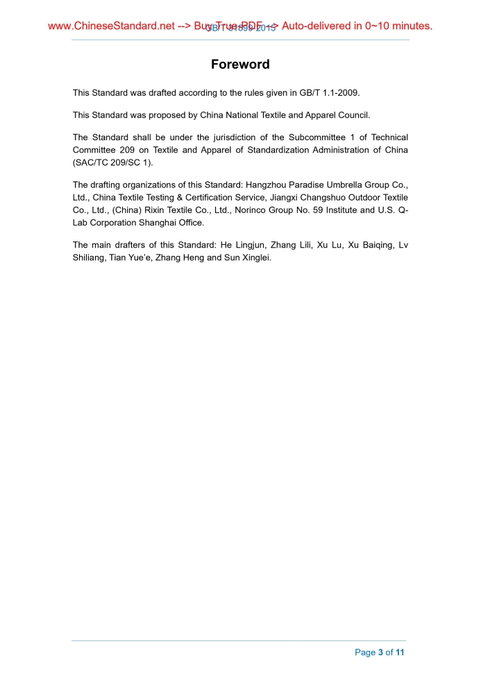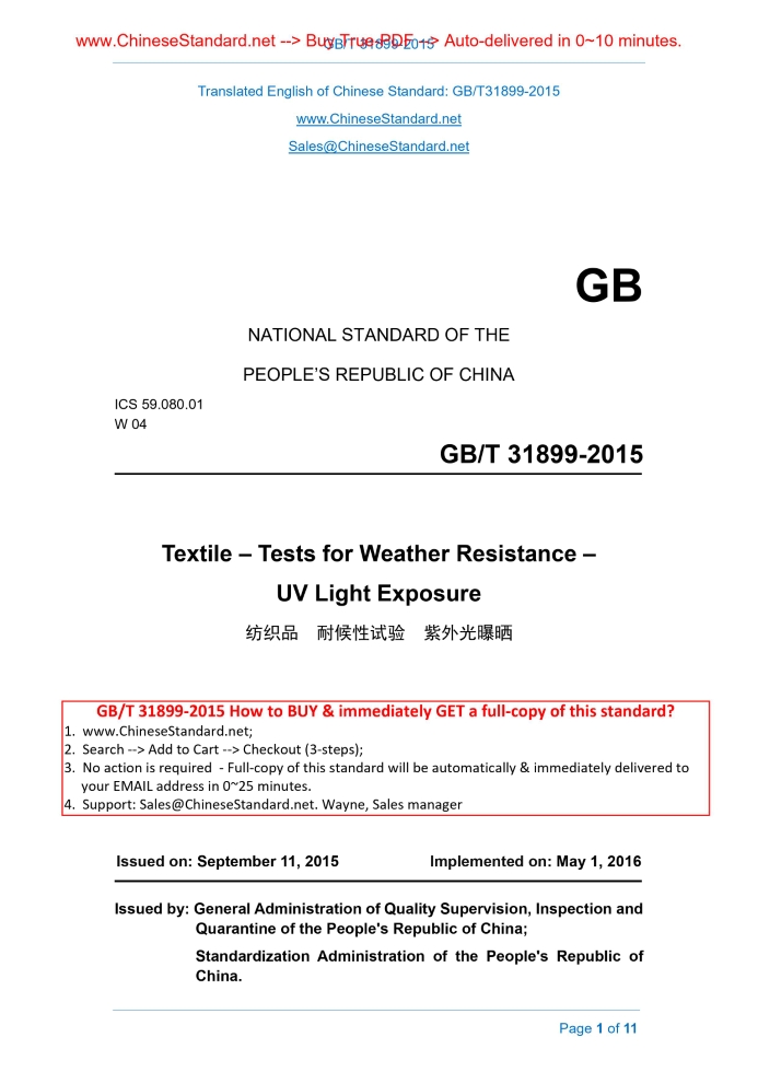Similar standardsGB/T 31899-2015: Textile - Tests for Weather Resistance - UV Light Exposure---This is an excerpt. Full copy of true-PDF in English version (including equations, symbols, images, flow-chart, tables, and figures etc.), auto-downloaded/delivered in 9 seconds, can be purchased online: https://www.ChineseStandard.net/PDF.aspx/GBT31899-2015GB NATIONAL STANDARD OF THE PEOPLE’S REPUBLIC OF CHINA ICS 59.080.01 W 04 Textile – Tests for Weather Resistance – UV Light Exposure Issued on: SEPTEMBER 11, 2015 Implemented on: MAY 1, 2016 Issued by. General Administration of Quality Supervision, Inspection and Quarantine of the People's Republic of China; Standardization Administration of the People's Republic of China. Table of ContentsForeword ... 3 1 Scope ... 4 2 Normative References ... 4 3 Terms and Definitions ... 4 4 Principle ... 5 5 Test Equipment ... 5 6 Samples ... 7 7 Test Conditions ... 7 8 Test Procedure ... 7 9 Performance Determination... 8 10 Test Results ... 8 11 Test Report ... 9 Annex A (Informative) Applications and Limitations ... 10 Annex B (Informative) Typical Spectral Energy Distribution of Fluorescent UV lamp ... 11ForewordThis Standard was drafted according to the rules given in GB/T 1.1-2009. This Standard was proposed by China National Textile and Apparel Council. The Standard shall be under the jurisdiction of the Subcommittee 1 of Technical Committee 209 on Textile and Apparel of Standardization Administration of China (SAC/TC 209/SC 1). The drafting organizations of this Standard. Hangzhou Paradise Umbrella Group Co., Ltd., China Textile Testing & Certification Service, Jiangxi Changshuo Outdoor Textile Co., Ltd., (China) Rixin Textile Co., Ltd., Norinco Group No. 59 Institute and U.S. Q- Lab Corporation Shanghai Office. The main drafters of this Standard. He Lingjun, Zhang Lili, Xu Lu, Xu Baiqing, Lv Shiliang, Tian Yue’e, Zhang Heng and Sun Xinglei. Textile – Tests for Weather Resistance – UV Light Exposure1 ScopeThis Standard specifies the test method for UV light exposure ageing and the determination of changes in performance before and after ageing of the textiles for outdoor use. This Standard is applicable to all kinds of textile materials and products for outdoor use. Note. See Annex A for the applications and limitations of this method.2 Normative ReferencesThe following documents are essential to the application of this Standard. For the dated references, only the dated editions are applicable to this Standard. For the undated references, their latest editions (including all amendments) are applicable to this Standard. GB/T 250 Textiles - Tests for Colour Fastness - Grey Scale for Colour3 Terms and DefinitionsFor the purpose of this Standard, the following terms and definitions apply. 3.1 Fluorescent UV lamp The fluorescent lamp which produces radiation energy in the ultraviolet region of the spectrum (e.g. below 400 nm) more than 80% of the total light energy output at least. 3.2 Irradiance The irradiance flux per unit area in the specified wavelength range, in watt(s) per square meter (W/m2). 3.3 Radiant energy The time integral of the irradiance, in joule(s) per square meter (J/m2). 3.4 Spectral energy distributionAnnex A(Informative) Applications and Limitations A.1 In this Standard, it simulates the performance degradation of the materials caused by the UV light and humidity conditions in the natural world, other than simulates all weather conditions, such as air pollution, biological erosion and salt water erosion. A.2 Different test conditions can result in different test results. Therefore, the test conditions shall be described in the test report; otherwise, the test results can’t be used as reference. A.3 The test results obtained from this Standard are used to compare the weather resistances of the materials after exposure of a certain test method. A.4 The correlation between the laboratory light source acceleration test and the actual outdoor exposure is subject to a number of factors. The spectral distributions of laboratory light source and sunlight are different. In a laboratory acceleration test, a wavelength shorter than normal wavelength is used frequently to obtain a faster ageing speed. For an outdoor exposure, cutoff wavelength of its short-wave UV radiation is generally believed to be 300 nm. Under the exposure to the UV radiation of less than 300 nm, degradation reaction may be caused, but this reaction will not occur in outdoor conditions. If the wavelength of the UV radiation contained in the laboratory light source used in the acceleration test is less than the wavelength of the actual operating conditions, then the degradation mechanism and the material stability level in the acceleration test can be different significantly. A.5 If the radiation of a certain area can cause the degradation of the material tested, it is not necessary to simulate all spectrums of sunlight if the stability level of the material is not changed. However, for the UV light or the laboratory light source with visible light spectrum, there is usually strong emission spectrum within a narrow wavelength range. It may cause some unexpected results. This type of light source may not cause the changes of sunlight exposure. The exposure to the only light source of UV radiation may not cause the same colour fading as that caused by visible light; or it may cause greater polymer yellowing changes than that caused by sunlight exposure. ......Source: Above contents are excerpted from the full-copy PDF -- translated/reviewed by: www.ChineseStandard.net / Wayne Zheng et al. Tips & Frequently Asked Questions:Question 1: How long will the true-PDF of English version of GB/T 31899-2015 be delivered?Answer: The full copy PDF of English version of GB/T 31899-2015 can be downloaded in 9 seconds, and it will also be emailed to you in 9 seconds (double mechanisms to ensure the delivery reliably), with PDF-invoice.Question 2: Can I share the purchased P