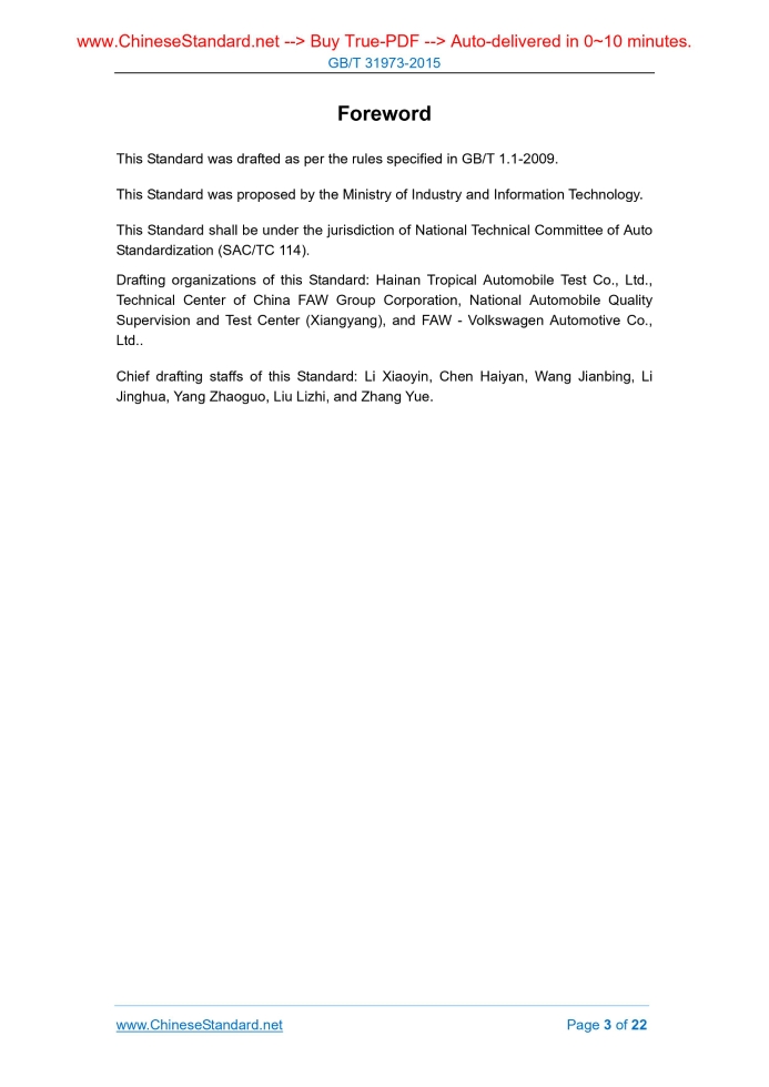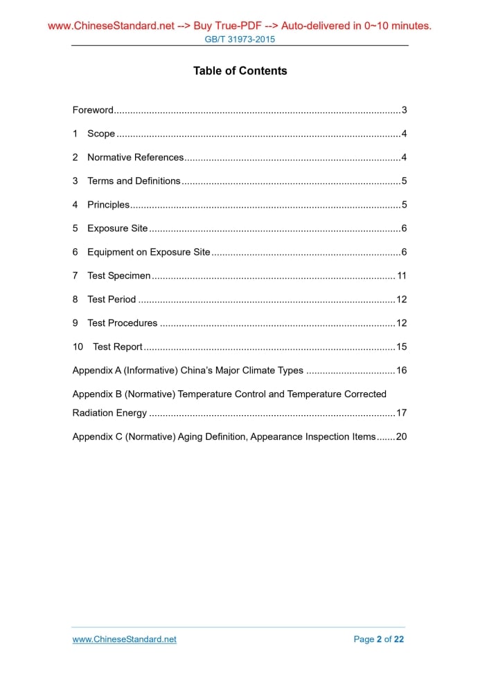 Similar standardsGB/T 31973-2015: Natural Weathering Exposure Tests for Automotive Non-Metallic Materials and Parts---This is an excerpt. Full copy of true-PDF in English version (including equations, symbols, images, flow-chart, tables, and figures etc.), auto-downloaded/delivered in 9 seconds, can be purchased online: https://www.ChineseStandard.net/PDF.aspx/GBT31973-2015 GB NATIONAL STANDARD OF THE PEOPLE’S REPUBLIC OF CHINA ICS 43.020 T 40 Natural Weathering Exposure Tests for Automotive Non-Metallic Materials and Parts Issued on: SEPTEMBER 11, 2015 Implemented on: JANUARY 1, 2016 Issued by. General Administration of Quality Supervision, Inspection and Quarantine; Standardization Administration of PRC. Table of ContentsForeword ... 3 1 Scope ... 4 2 Normative References ... 4 3 Terms and Definitions ... 5 4 Principles ... 5 5 Exposure Site ... 6 6 Equipment on Exposure Site ... 6 7 Test Specimen ... 11 8 Test Period ... 12 9 Test Procedures ... 12 10 Test Report ... 15 Appendix A (Informative) China’s Major Climate Types ... 16 Appendix B (Normative) Temperature Control and Temperature Corrected Radiation Energy ... 17 Appendix C (Normative) Aging Definition, Appearance Inspection Items ... 20ForewordThis Standard was drafted as per the rules specified in GB/T 1.1-2009. This Standard was proposed by the Ministry of Industry and Information Technology. This Standard shall be under the jurisdiction of National Technical Committee of Auto Standardization (SAC/TC 114). Drafting organizations of this Standard. Hainan Tropical Automobile Test Co., Ltd., Technical Center of China FAW Group Corporation, National Automobile Quality Supervision and Test Center (Xiangyang), and FAW - Volkswagen Automotive Co., Ltd.. Chief drafting staffs of this Standard. Li Xiaoyin, Chen Haiyan, Wang Jianbing, Li Jinghua, Yang Zhaoguo, Liu Lizhi, and Zhang Yue. Natural Weathering Exposure Tests for Automotive Non-Metallic Materials and Parts1 ScopeThis Standard specifies the principle, exposure site, equipment on exposure site, test sample, test duration, test procedure, and test report of the natural weathering exposure tests for automotive non-metallic materials and parts. This Standard is applicable to the natural weathering exposure tests for automotive non-metallic materials and parts.2 Normative ReferencesThe following documents are essential to the application of this document. For the dated documents, only the versions with the dates indicated are applicable to this document; for the undated documents, only the latest version (including all the amendments) are applicable to this standard. GB/T 3511 Rubber Vulcanized or Thermoplastic - Resistance to Weathering GB/T 3681 Plastics - Methods of Exposure to Direct Weathering, to Weathering Using Glass-Filtered Daylight, and to Intensified Weathering by Daylight Using Fresnel Mirrors GB/T 6739 Paints and Varnishes - Determination of Film Hardness by Pencil Test GB/T 8807 Test Method for Specular Gloss of Plastics GB/T 9286 Paints and Varnishes-Cross Cut Test for Films GB/T 9754 Paints and Varnishes - Determination of Specular Gloss of Non-Metallic Paint Films at 20° 60°and 85° GB/T 11186 Methods for Measuring the Color of Paint Films (All Parts) GB/T 15596 Plastics - Determination of Changes in Color and Variations in Properties after Exposure to Daylight under Glass, Natural Weathering or Laboratory Light Sources The exposure direction of exposure frame shall face the equator, namely, from south to north. In the northern hemisphere, the front side of specimen shall face the due south direction; in the southern hemisphere, the front side of specimen shall face the due north direction. However, to adapt to the special test purpose, the specimen can be placed facing any direction. The tilted angle between specimen’s exposure surface and the horizontal surface can be realized through adjusting the tilted position of the exposure frame. The typical exposure angle includes exposure site’s geographic latitude angle, 90°, 45°, and 5°. If it is specially required, the exposure frame can adopt any one angle. Exposure with back plate and black box exposure generally adopt 5° angle. The exposure frames shall be set at the intervals that ensure sufficient space for placing the specimen, smooth natural ventilation, and without mutual sunlight shielding. Generally, the interval shall be no less than 1m. Automotive exterior materials and part exposure test equipment shall be arranged at the place where the specimen shall be avoided sunlight shielding by other objects. The lowest position of specimen on the frame or black box against the ground shall be 0.45m, so as to avoid touch the objects on the ground, and prevent the unexpected damage of the specimen during the exposure period. 6.2.2 Direct exposure device 6.2.2.1 Open exposure frame (general method) Open exposure frame is applicable to the exposure test for exterior materials, and various shapes and dimensions of specimens. Generally, it is made of aluminum alloy. Aluminum alloy exposure frame is suitable for different climatic regions; iron and steel materials through proper painting treatment and wood materials without any treatment are suitable for desert region; copper-nickel alloy material is suitable for high corrosive regions. Exposure frame shall have sufficient length and width to install and fix the specimens, which are ensured not to influence each other. When installing the specimen, generally use porcelain insulation folder, plastic stopper pin, wooden frame, wire and lining plate through corrosion-resistant treatment, fastening screws and etc. 6.2.2.2 Exposure frame with backplane (coating system) Backplane can be made of metal sheet and wooden plywood. When the fixed holder is made of plywood for directly installing the specimen, if the plywood occurs obvious layering or significant fiber releasing, then it shall be replaced timely. The plywood with medium and high density covering layer