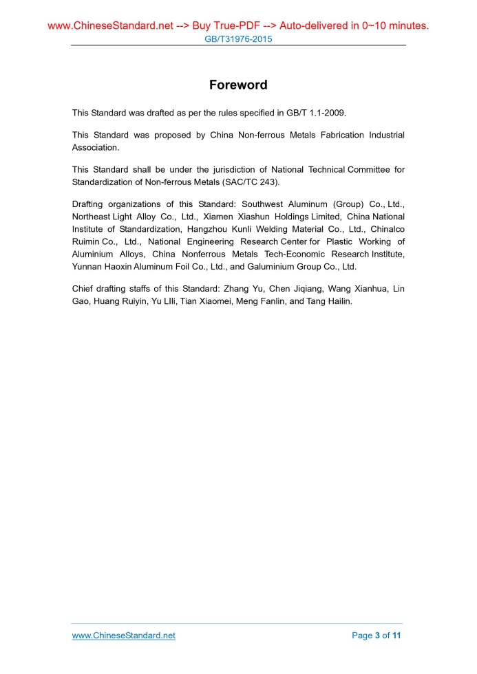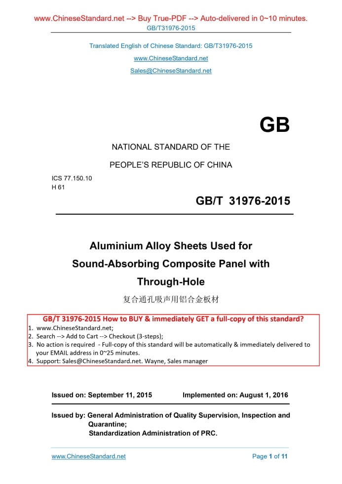 Similar standardsGB/T 31976-2015: Aluminium Alloy Sheets Used for Sound-Absorbing Composite Panel with Through-Hole---This is an excerpt. Full copy of true-PDF in English version (including equations, symbols, images, flow-chart, tables, and figures etc.), auto-downloaded/delivered in 9 seconds, can be purchased online: https://www.ChineseStandard.net/PDF.aspx/GBT31976-2015 GB NATIONAL STANDARD OF THE PEOPLE’S REPUBLIC OF CHINA ICS 77.150.10 H 61 Aluminium Alloy Sheets Used for Sound-Absorbing Composite Panel with Through-Hole Issued on: SEPTEMBER 11, 2015 Implemented on: AUGUST 1, 2016 Issued by. General Administration of Quality Supervision, Inspection and Quarantine; Standardization Administration of PRC. Table of ContentsForeword ... 3 1 Scope ... 4 2 Normative References ... 4 3 Requirements ... 5 4 Test Methods ... 7 5 Inspection Rules ... 8 6 Marks, Package, Transportation, Storage, and Quality Certificate ... 10 7 Order (or Contract) Contents ... 11ForewordThis Standard was drafted as per the rules specified in GB/T 1.1-2009. This Standard was proposed by China Non-ferrous Metals Fabrication Industrial Association. This Standard shall be under the jurisdiction of National Technical Committee for Standardization of Non-ferrous Metals (SAC/TC 243). Drafting organizations of this Standard. Southwest Aluminum (Group) Co., Ltd., Northeast Light Alloy Co., Ltd., Xiamen Xiashun Holdings Limited, China National Institute of Standardization, Hangzhou Kunli Welding Material Co., Ltd., Chinalco Ruimin Co., Ltd., National Engineering Research Center for Plastic Working of Aluminium Alloys, China Nonferrous Metals Tech-Economic Research Institute, Yunnan Haoxin Aluminum Foil Co., Ltd., and Galuminium Group Co., Ltd. Chief drafting staffs of this Standard. Zhang Yu, Chen Jiqiang, Wang Xianhua, Lin Gao, Huang Ruiyin, Yu LIli, Tian Xiaomei, Meng Fanlin, and Tang Hailin. Aluminium Alloy Sheets Used for Sound-Absorbing Composite Panel with Through-Hole1 ScopeThis Standard specifies the requirements, test methods, inspection rules and marks, package, transportation, storage, quality certificate, and order (or contract) of the aluminium alloy sheets used for sound-absorbing composite panel with through-hole. This Standard is applicable to the aluminium alloy sheets (hereinafter referred to as sheets) used for the sound barrier in t he railway and highway.2 Normative ReferencesThe following documents are essential to the application of this document. For the dated documents, only the versions with the dates indicated are applicable to this document; for the undated documents, only the latest version (including all the amendments) are applicable to this document. GB/T 232 Metallic Materials - Bend Test GB/T 3190 Wrought Aluminium and Aluminium Alloy - Chemical Composition GB/T 3199 Wrought Aluminium and Aluminium Alloy Products - Packing, Marking, Transporting and Storing GB/T 3880.3 Wrought Aluminium and Aluminium Alloy Plates, Sheets and Strips for General Engineering - Part 3. Tolerances on Forms and Dimensions GB/T 7999 Optical Emission Spectrometric Analysis Method of Aluminum and Aluminum Alloys GB/T 16865 Test Pieces and Method for Tensile Test for Wrought Aluminium and Magnesium Alloys Products GB/T 17432 Methods for Sampling for Analyzing the Chemical Composition of Wrought Aluminum and Aluminum Alloys GB/T 20975 (All parts) Methods for Chemical Analysis of Aluminium and Aluminium Alloys5 Inspection Rules5.1 Inspection and acceptance 5.1.1 The sheets shall be inspected by the supplier, ensure the sheet quality to conform to the provisions of this Standard and order (or contract), and fill in the quality certificate. 5.1.2 The purchaser shall re-inspect the sheets according to this Standard after receiving the sheets. If the inspection results don’t comply with the requirements of this Standard and order (or contract), it shall be submitted to the supplier in written form, and be settled through the consultation between the supplier and purchaser. The objection on the appearance quality and dimension tolerance shall be submitted within 1 month since the date of receipt of the sheets; while the objection on other performances shall be submitted within 3 months since the date of receipt of the sheets. If arbitration is required, it can be entrusted to the organization approved by the supplier and purchaser to conduct, and carry out common sampling against the purchaser. 5.2 Batch The sheets shall be submitted in batches; each batch shall consist of the same state and specification of the sheets. 5.3 Weighing The sheet shall be weighed by weight-check. 5.4 Inspection items Each batch of sheets shall be inspected the chemical compositions, dimension tolerance, mechanical properties, bending properties, and appearance quality before they leave the factory. 5.5 Sampling The sampling of the sheets shall conform to the provisions of Table 8. such batch of sheets shall be judged as disqualified. The supplier is allowed to inspect the sheets piece by piece through the consultation between the supplier and purchaser, and the qualified sheets can be delivered. The supplier is also allowed to repeat the heat treatment, and conduct the re-sampling inspection. 5.6.5 If the appearance quality of any sheet is disqualified, then such piece of sheet can be judged as disqualified.6 Marks, Package, Transportation, Storage, andQuality Certificate 6.1 Marks The marks of the sheets shall conform to the provisions of GB/T 3199. 6.2 Package, transportation, and storage The sheets are required to coat no oil, and cushion paper package between them. The requirements for other package, transportation, and storage shall conform to the provisions of GB/T 3199. 6.3 Quality certificate Each batch of sheets shall be accompanied by a product quality certificate, which shall indicate the following contents. a) Name, address, telephone, and fax of the supplier; b) Product name; c) Grade, state, and specification; d) Batch num