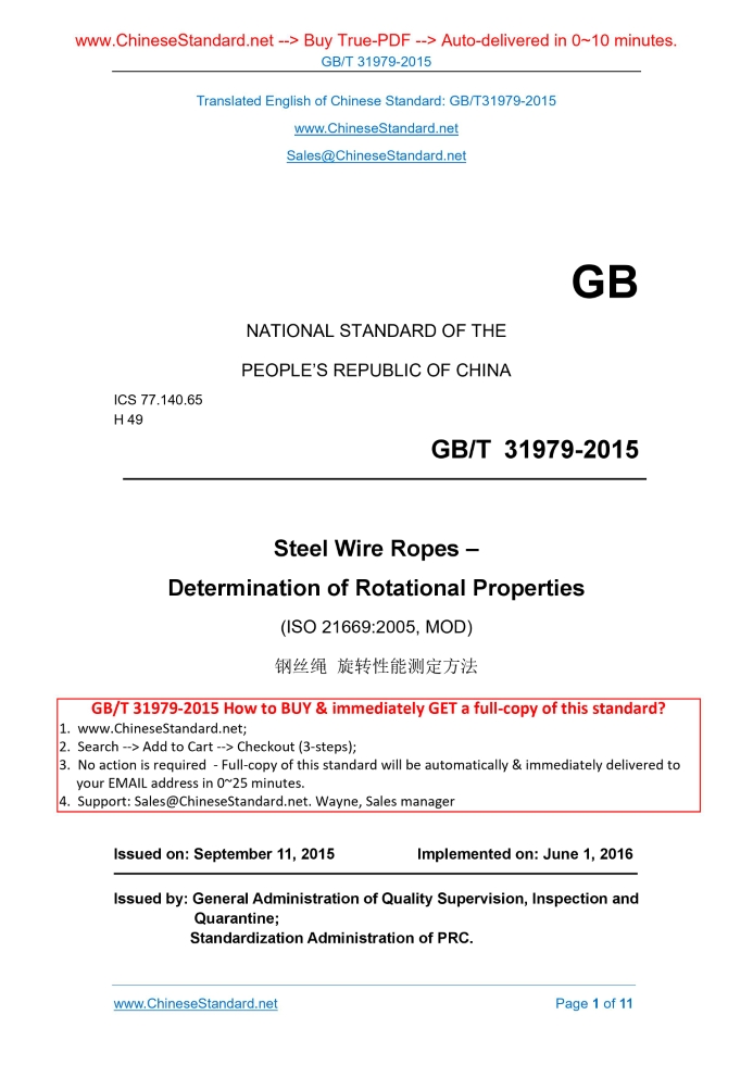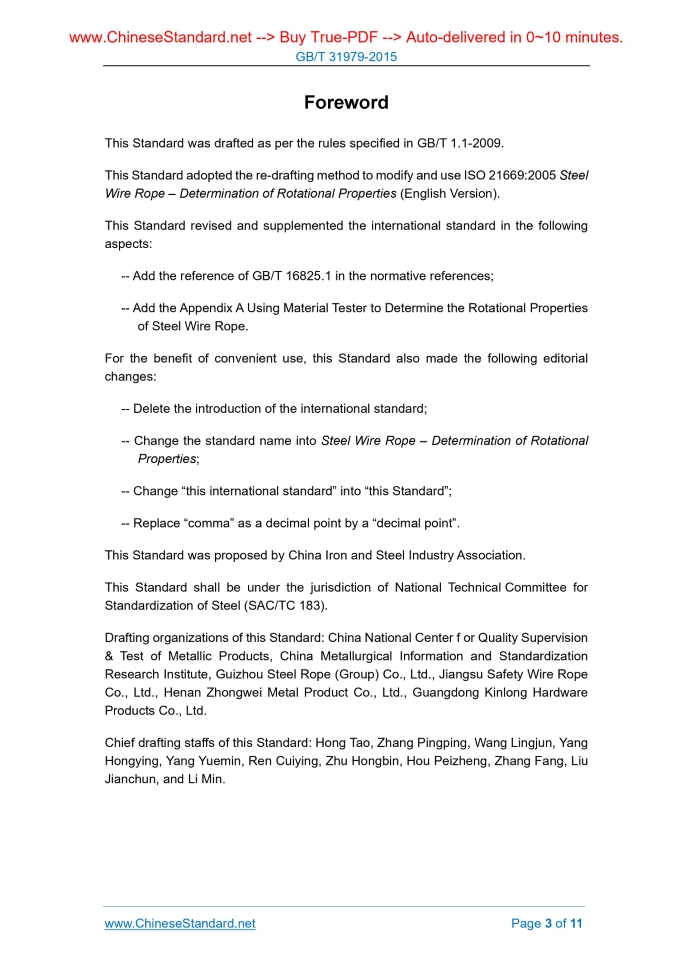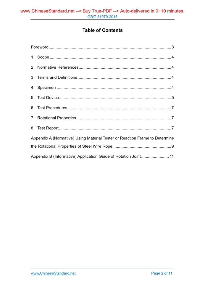 Similar standardsGB/T 31979-2015: Steel wire ropes -- Determination of rotational properties---This is an excerpt. Full copy of true-PDF in English version (including equations, symbols, images, flow-chart, tables, and figures etc.), auto-downloaded/delivered in 9 seconds, can be purchased online: https://www.ChineseStandard.net/PDF.aspx/GBT31979-2015GB NATIONAL STANDARD OF THE PEOPLE’S REPUBLIC OF CHINA ICS 77.140.65 H 49 Steel Wire Ropes – Determination of Rotational Properties (ISO 21669.2005, MOD) Issued on: SEPTEMBER 11, 2015 Implemented on: JUNE 1, 2016 Issued by. General Administration of Quality Supervision, Inspection and Quarantine; Standardization Administration of PRC. Table of ContentsForeword ... 3 1 Scope ... 4 2 Normative References ... 4 3 Terms and Definitions ... 4 4 Specimen ... 4 5 Test Device ... 5 6 Test Procedures ... 7 7 Rotational Properties ... 7 8 Test Report ... 7 Appendix A (Normative) Using Material Tester or Reaction Frame to Determine the Rotational Properties of Steel Wire Rope ... 9 Appendix B (Informative) Application Guide of Rotation Joint ... 11ForewordThis Standard was drafted as per the rules specified in GB/T 1.1-2009. This Standard adopted the re-drafting method to modify and use ISO 21669.2005 Steel Wire Rope – Determination of Rotational Properties (English Version). This Standard revised and supplemented the international standard in the following aspects. -- Add the reference of GB/T 16825.1 in the normative references; -- Add the Appendix A Using Material Tester to Determine the Rotational Properties of Steel Wire Rope. For the benefit of convenient use, this Standard also made the following editorial changes. -- Delete the introduction of the international standard; -- Change the standard name into Steel Wire Rope – Determination of Rotational Properties; -- Change “this international standard” into “this Standard”; -- Replace “comma” as a decimal point by a “decimal point”. This Standard was proposed by China Iron and Steel Industry Association. This Standard shall be under the jurisdiction of National Technical Committee for Standardization of Steel (SAC/TC 183). Drafting organizations of this Standard. China National Center f or Quality Supervision & Test of Metallic Products, China Metallurgical Information and Standardization Research Institute, Guizhou Steel Rope (Group) Co., Ltd., Jiangsu Safety Wire Rope Co., Ltd., Henan Zhongwei Metal Product Co., Ltd., Guangdong Kinlong Hardware Products Co., Ltd. Chief drafting staffs of this Standard. Hong Tao, Zhang Pingping, Wang Lingjun, Yang Hongying, Yang Yuemin, Ren Cuiying, Zhu Hongbin, Hou Peizheng, Zhang Fang, Liu Jianchun, and Li Min. Steel Wire Ropes – Determination of Rotational Properties1 ScopeThis Standard specifies the determination range of rotational properties of steel wire rope, terms and definitions, specimen test device, test procedures, rotational properties, test report etc. This Standard is applicable to determine the rotational property of steel wire rope.2 Normative ReferencesThe following documents are essential to the application of this document. For the dated documents, only the versions with the dates indicated are applicable to this document; for the undated documents, only the latest version (including all the amendments) are applicable to this document. GB/T 8706 Steel Wire Rope – Vocabulary, Designation and Classification (GB/T 8706-2006, ISO 17893.2004, IDT) GB/T 16825.1 Verification of Static Uniaxial Testing Machines – Part 1. Tension/Compression Testing Machines – Verification and Calibration of the Force-Measuring System (GB/T 16825.1-2008, ISO 700-1.2004, IDT)3 Terms and DefinitionsThe terms and definitions stipulated in GB/T 8706 are applicable to this document.4 SpecimenThe specimen shall be sufficient to represent the properties of the entire steel wire rope, free from defects, and the steel wire rope shall be used independently for the lifting load. The free length between the specimen ends of steel wire rope shall be at least 100d, d is the nominal diameter of steel wire rope in millimeter.6 Test ProceduresMeasure the free length of the steel wire rope specimen. Exert the load to the tested steel wire rope specimen, and determine the benchmark of pointer. Lift the load from the ground, and ensure that the load and the ground to maintain a certain distance. Avoid the rotational inertia of the load from the rise to the balance position. During the load exerting period, observe the full rotation number of the pointer, and measure the angle that the pointer is deflected relatively from the benchmark. Record the total angle that the point is deflected.7 Rotational PropertiesThe rotational properties shall be determined by the rotation angle and specimen actually-measured length, which are observed in the test. The rotation angle observed in the test shall be converted into a value of steel wire rope length of1000d. When the measured free length of specimen is not 1000d, the rotation angle (the number of rotation) observed at the free length between specimen ends shall be converted to the rotation angle at the length of 1000d in the directly proportional relationship. For instance, if the rotation angle observed at the free length of 250d is 1-turn rotation, the rotation angle per 1000d length is 4-turn rotation. The rotational properties shall be expressed by the number of rotations per unit length of 1000d, thereof 1-turn rotation is 360°.8 Test ReportThe test report shall include minimum the following contents. a) Specimen number; b) This Standard number; c) Steel wire rope mark and minimum breaking force, in kN;Appendix B(Informative) Application Guide of Rotation Joint To limit the damage caused by the rotating load during the lifting operation, and guarantee the personal safety of the staff on the operation site, it’s better to select the rotation-resisting steel wire rope with small rotation angle during the load