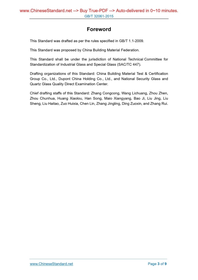 Similar standardsGB/T 32061-2015: Testing method of laminated glass interlayer shear modulus---This is an excerpt. Full copy of true-PDF in English version (including equations, symbols, images, flow-chart, tables, and figures etc.), auto-downloaded/delivered in 9 seconds, can be purchased online: https://www.ChineseStandard.net/PDF.aspx/GBT32061-2015GB NATIONAL STANDARD OF THE PEOPLE’S REPUBLIC OF CHINA ICS 81.040.01 Q 30 Testing Method of Laminated Glass Interlayer Shear Modulus Issued on: OCTOBER 9, 2015 Implemented on: SEPTEMBER 1, 2016 Issued by. General Administration of Quality Supervision, Inspection and Quarantine; Standardization Administration of PRC. Table of ContentsForeword ... 3 1 Scope ... 4 2 Terms and Definitions ... 4 3 Test Device ... 5 4 Specimen ... 6 5 Test Procedures ... 6 6 Data Analysis ... 7 7 Test Report ... 7 Appendix A (Informative) Table Example ... 9ForewordThis Standard was drafted as per the rules specified in GB/T 1.1-2009. This Standard was proposed by China Building Material Federation. This Standard shall be under the jurisdiction of National Technical Committee for Standardization of Industrial Glass and Special Glass (SAC/TC 447). Drafting organizations of this Standard. China Building Material Test & Certification Group Co., Ltd., Dupont China Holding Co., Ltd., and National Security Glass and Quartz Glass Quality Direct Examination Center. Chief drafting staffs of this Standard. Zhang Congcong, Wang Lichuang, Zhou Zhen, Zhou Chunhua, Huang Xiaolou, Han Song, Maio Xiangyang, Bao Ji, Liu Jing, Liu Sheng, Liu Haitao, Zuo Huixia, Chen Lin, Zhang Jingling, Ding Zuoxin, and Zhang Rui. Testing Method of Laminated Glass Interlayer Shear Modulus1 ScopeThis Standard specifies the terms and definitions, test device, specimen, test procedures, data analysis and test report of laminated glass interlayer shear modulus (G). This Standard is applicable to the measurement of Polybutylene Butyral (PVB), Ethylene Vinyl Acetate Copolymer (EVA), laminated glass interlayer shear modulus including ionic interlayer film, and the measurement of other visoelastic material shear modulus can refer to this Standard.2 Terms and DefinitionsThe following terms and definitions are applicable to this document. 2.1 Young’s complex modulus When material is in the elastic limit, the ratio between normal stress and normal strain, which is expressed by E* in MPa. NOTE. Young’s complex modulus consists of real Young’s storage modulus (expressed by E’ in MPa) and imaginary Young’s storage modulus (expressed by E’’ in MPa); i.e.. E*= E’ + iE’’, thereof i is the imaginary unit. The Yong’s storage modulus indicates the energy stored by visoelastic material during the deformation due to elastic deformation. The Young’s loss modulus indicates the energy loss of the visoelastic material during the deformation due to plastic deformation (irreversible). 2.2 Shear modulus When material is in the elastic limit, the ratio between shear stress and shear strain, which is expressed by G in MPa. 2.3 Poisson’s ratio When material is dragged or compressed in one direction, the ratio between the absolute value of transverse positive strain and absolute value of axial positive strain, which is expressed by µ. 5.4 According to the tensile mode shown in Figure 1, measure it from the low to high temperature; obtain the original data. the Young’s storage modulus E’ and Young’s loss modulus E’’ of specimen under different temperature and different loading period. 5.5 Open the liquid nitrogen supply device for cooling till reach the lower limit of the set temperature.6 Data Analysis6.1 Analyze the original data obtained from 5.4, then draw the time-temperature equivalent principal curve for the interlayer material at different temperature. 6.2 According to the different temperature and time principal curve data, adopt linear interpolation method to select, on the principal curve, the Young’s complex modulus value with corresponding temperature and load cycle. Prepare the table of Young’s complex modulus corresponding to time and temperature, see Table A.1. 6.3 Use the mathematical relationship formula (1) among Shear Modulus G, Young’s Complex Modulus E*, and Poisson’s Ratio µ, and calculate the Shear Modulus G of interlayer material. Obtain the table of shear modulus corresponding to time and temperature, see Table A.2. NOTE. in the range of -40°C~80°C, the Value-µ of PVB, EVA and ionic interlayer film can be regarded as Constant 0.5.7 Test ReportThe test report shall contain the following contents at least. a) Specimen situation. name, type and source; b) Description of test device; c) Specimen dimension and thickness; d) Before test, the storage temperature, humidity and storage time of sample; e) Temperature- rise procedures include initial and final temperature and temperature-rise step length; f) Original test data; ......Source: Above contents are excerpted from the full-copy PDF -- translated/reviewed by: www.ChineseStandard.net / Wayne Zheng et al. Tips & Frequently Asked Questions:Question 1: How long will the true-PDF of English version of GB/T 32061-2015 be delivered?Answer: The full copy PDF of English version of GB/T 32061-2015 can be downloaded in 9 seconds, and it will also be emailed to you in 9 seconds (double mechanisms to ensure the delivery reliably), with PDF-invoice.Question 2: Can I share the purchased PDF of GB/T 32061-2015_English with my colleagues?Answer: Yes. The purchased PDF of GB/T 32061-2015_English will be deemed to be sold to your employer/organization who actually paid for it, including your colleagues and your employer's intranet.Question 3: Does the price include tax/VAT?Answer: Yes. Our tax invoice, downloaded/delivered in 9 seconds, includes all tax/VAT and complies with 100+ countries' tax regulations (tax exempted in 100+ countries) -- See Avoidance of Double Taxation Agreements (DTAs): List of DTAs signed between Singa
