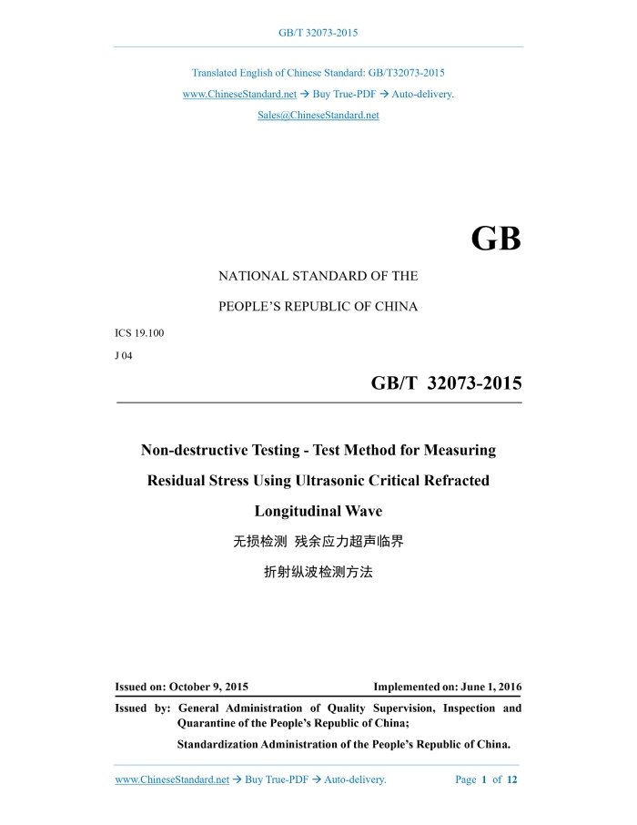GB/T 32073-2015: Non-destructive testing - Test method for measuring residual stress using ultrasonic critical refracted longitudinal wave Delivery: 9 seconds. True-PDF full-copy in English & invoice will be downloaded + auto-delivered via email. See step-by-step procedure Status: Valid