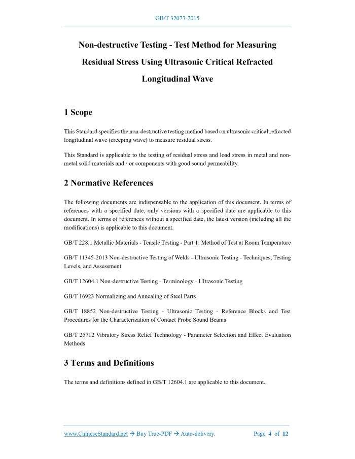 Similar standardsGB/T 32073-2015: Non-destructive testing - Test method for measuring residual stress using ultrasonic critical refracted longitudinal wave---This is an excerpt. Full copy of true-PDF in English version (including equations, symbols, images, flow-chart, tables, and figures etc.), auto-downloaded/delivered in 9 seconds, can be purchased online: https://www.ChineseStandard.net/PDF.aspx/GBT32073-2015 GB NATIONAL STANDARD OF THE PEOPLE’S REPUBLIC OF CHINA ICS 19.100 J 04 Non-destructive Testing - Test Method for Measuring Residual Stress Using Ultrasonic Critical Refracted Longitudinal Wave ISSUED ON: OCTOBER 9, 2015 IMPLEMENTED ON: JUNE 1, 2016 Issued by: General Administration of Quality Supervision, Inspection and Quarantine of the People’s Republic of China; Standardization Administration of the People’s Republic of China. Table of ContentsForeword ... 3 1 Scope ... 4 2 Normative References ... 4 3 Terms and Definitions ... 4 4 Personnel Requirements ... 5 5 Method Summary ... 5 6 Testing System ... 6 7 Testing ... 8 8 Temperature Compensation and Correction ... 10 9 Test Report ... 11 Bibliography ... 12 Non-destructive Testing - Test Method for Measuring Residual Stress Using Ultrasonic Critical Refracted Longitudinal Wave1 ScopeThis Standard specifies the non-destructive testing method based on ultrasonic critical refracted longitudinal wave (creeping wave) to measure residual stress. This Standard is applicable to the testing of residual stress and load stress in metal and non- metal solid materials and / or components with good sound permeability.2 Normative ReferencesThe following documents are indispensable to the application of this document. In terms of references with a specified date, only versions with a specified date are applicable to this document. In terms of references without a specified date, the latest version (including all the modifications) is applicable to this document. GB/T 228.1 Metallic Materials - Tensile Testing - Part 1: Method of Test at Room Temperature GB/T 11345-2013 Non-destructive Testing of Welds - Ultrasonic Testing - Techniques, Testing Levels, and Assessment GB/T 12604.1 Non-destructive Testing - Terminology - Ultrasonic Testing GB/T 16923 Normalizing and Annealing of Steel Parts GB/T 18852 Non-destructive Testing - Ultrasonic Testing - Reference Blocks and Test Procedures for the Characterization of Contact Probe Sound Beams GB/T 25712 Vibratory Stress Relief Technology - Parameter Selection and Effect Evaluation Methods3 Terms and DefinitionsThe terms and definitions defined in GB/T 12604.1 are applicable to this document.4 Personnel RequirementsPersonnel performing testing in accordance with this Standard shall pass special training in the non-destructive testing of residual stress using ultrasonic critical refracted longitudinal wave.5 Method SummaryWhen the ultrasonic longitudinal wave excited by the transmitting transducer is obliquely incident on the surface of the object being tested at the first critical angle, in accordance with the Snell law, the ultrasonic critical refracted longitudinal wave can be generated inside the material of the object being tested, and can be received by the receiving transducer, as it is shown in Figure 1. In accordance with the principle of acoustic elasticity, the residual stress in the material will affect the propagation speed of ultrasonic longitudinal wave. When the direction of residual stress is consistent with the direction of the longitudinal wave, the tensile stress will slow down the propagation of ultrasonic longitudinal wave or prolong the propagation time t, and the compressive stress will accelerate the propagation of ultrasonic longitudinal wave or shorten the propagation time t. Therefore, under the condition that the distance between the excitation and receiving transducers (probe spacing) remains unchanged, if the ultrasonic propagation time t0 corresponding to zero stress σ0 and the ultrasonic propagation time t corresponding to the stress σ of the object being tested are measured, in accordance with the time difference, Formula (1) or Formula (2), the absolute value of residual stress σ in the object being tested can be obtained, namely: Or Where, σ---the variation (stress difference) of the residual stress, σ = σ σ0; t---the variation (acoustic time difference) of the propagation time, t = t t0; K---the stress coefficient, which is related to the material of the object being tested and the probe spacing, can be obtained through tensile test calibration (see 7.3). confirm the accuracy of its detection value. Calibration intervals shall not exceed a maximum of one year. 6.2 Probes 6.2.1 They shall be able to realize the emission and reception of ultrasonic critical refracted longitudinal waves. 6.2.2 The probe used for testing (including at least two transducers) shall be tested in accordance with the method specified in GB/T 18852, and its performance parameters shall be the same. 6.2.3 The probe used for testing shall be the probe used for stress coefficient calibration and zero stress calibration. 6.2.4 The contact surface of the probe and the surface of the object being tested shall be well coupled. If the surface of the object being tested is curved, the coupling state shall comply with the stipulations of 6.3.4 in GB/T 11345-2013. 6.3 Coupling Agent Appropriate coupling agent shall be used to ensure stable and reliable ultrasonic coupling between the probe and the surface of the object being tested within the operating temperature range. The same coupling agent shall be used in the process of stress coefficient acquisition, zero stress calibration and testing, and the same coupling state shall be maintained. 6.4 Zero Stress Test Block 6.4.1 Material The material with the same metallographic structure and surface roughness as the material of the object being tested shall be used. 6.4.2 Shape and dimensions The shape of the test block is shown in Figure 2. 
