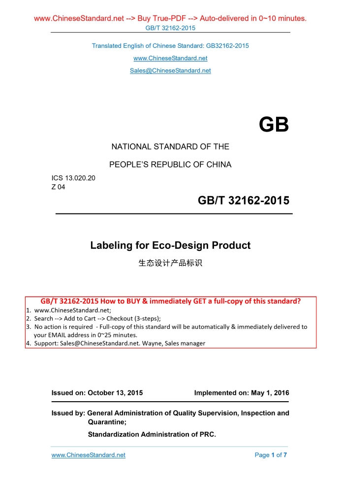 GB/T 32162-2015: Labeling for eco-design product Delivery: 9 seconds. True-PDF full-copy in English & invoice will be downloaded + auto-delivered via email. See step-by-step procedure Status: Valid
