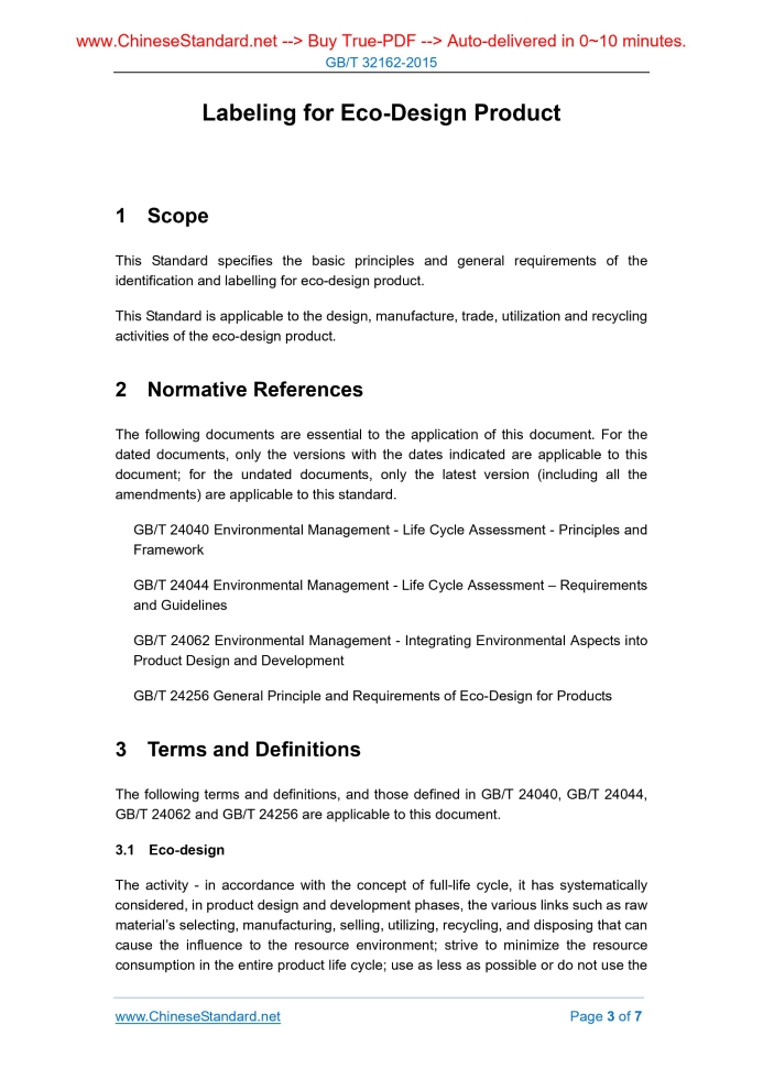 Similar standardsGB/T 32162-2015: Labeling for eco-design product---This is an excerpt. Full copy of true-PDF in English version (including equations, symbols, images, flow-chart, tables, and figures etc.), auto-downloaded/delivered in 9 seconds, can be purchased online: https://www.ChineseStandard.net/PDF.aspx/GBT32162-2015GB NATIONAL STANDARD OF THE PEOPLE’S REPUBLIC OF CHINA ICS 13.020.20 Z 04 Labeling for Eco-Design Product Issued on: OCTOBER 13, 2015 Implemented on: MAY 1, 2016 Issued by. General Administration of Quality Supervision, Inspection and Quarantine; Standardization Administration of PRC. Table of Contents1 Scope ... 3 2 Normative References ... 3 3 Terms and Definitions ... 3 4 Labeling for Eco-Design Product ... 4 Appendix A ... 6 Labeling for Eco-Design Product1 ScopeThis Standard specifies the basic principles and general requirements of the identification and labelling for eco-design product. This Standard is applicable to the design, manufacture, trade, utilization and recycling activities of the eco-design product.2 Normative ReferencesThe following documents are essential to the application of this document. For the dated documents, only the versions with the dates indicated are applicable to this document; for the undated documents, only the latest version (including all the amendments) are applicable to this standard. GB/T 24040 Environmental Management - Life Cycle Assessment - Principles and Framework GB/T 24044 Environmental Management - Life Cycle Assessment – Requirements and Guidelines GB/T 24062 Environmental Management - Integrating Environmental Aspects into Product Design and Development GB/T 24256 General Principle and Requirements of Eco-Design for Products3 Terms and DefinitionsThe following terms and definitions, and those defined in GB/T 24040, GB/T 24044, GB/T 24062 and GB/T 24256 are applicable to this document. 3.1 Eco-design The activity - in accordance with the concept of full-life cycle, it has systematically considered, in product design and development phases, the various links such as raw material’s selecting, manufacturing, selling, utilizing, recycling, and disposing that can cause the influence to the resource environment; strive to minimize the resource consumption in the entire product life cycle; use as less as possible or do not use the ......Source: Above contents are excerpted from the full-copy PDF -- translated/reviewed by: www.ChineseStandard.net / Wayne Zheng et al. Tips & Frequently Asked Questions:Question 1: How long will the true-PDF of English version of GB/T 32162-2015 be delivered?Answer: The full copy PDF of English version of GB/T 32162-2015 can be downloaded in 9 seconds, and it will also be emailed to you in 9 seconds (double mechanisms to ensure the delivery reliably), with PDF-invoice.Question 2: Can I share the purchased PDF of GB/T 32162-2015_English with my colleagues?Answer: Yes. The purchased PDF of GB/T 32162-2015_English will be deemed to be sold to your employer/organization who actually paid for it, including your colleagues and your employer's intranet.Question 3: Does the price include tax/VAT?Answer: Yes. Our tax invoice, downloaded/delivered in 9 seconds, includes all tax/VAT and complies with 100+ countries' tax regulations (tax exempted in 100+ countries) -- See Avoidance of Double Taxation Agreements (DTAs): List of DTAs signed between Singapore and 100+ countriesQuestion 4: Do you accept my currency other than USD?Answer: Yes. www.ChineseStandard.us -- GB/T 32162-2015 -- Click this link and select your country/currency to pay, the exact amount in your currency will be printed on the invoice. Full PDF will also be downloaded/emailed in 9 seconds.How to buy and download a true PDF of English version of GB/T 32162-2015?A step-by-step guide to download PDF of GB/T 32162-2015_EnglishStep 1: Visit website https://www.ChineseStandard.net (Pay in USD), or https://www.ChineseStandard.us (Pay in any currencies such as Euro, KRW, JPY, AUD).Step 2: Search keyword "GB/T 32162-2015". Step 3: Click "Add to Cart". If multiple PDFs are required, repeat steps 2 and 3 to add up to 12 PDFs to cart. Step 4: Select payment option (Via payment agents Stripe or PayPal). Step 5: Customize Tax Invoice -- Fill up your email etc. Step 6: Click "Checkout". Step 7: Make payment by credit card, PayPal, Google Pay etc. After the payment is completed and in 9 seconds, you will receive 2 emails attached with the purchased PDFs and PDF-invoice, respectively. Step 8: Optional -- Go to download PDF. Step 9: Optional -- Click Open/Download PDF to download PDFs and invoice. See screenshots for above steps: Steps 1~3 Steps 4~6 Step 7 Step 8 Step 9 |