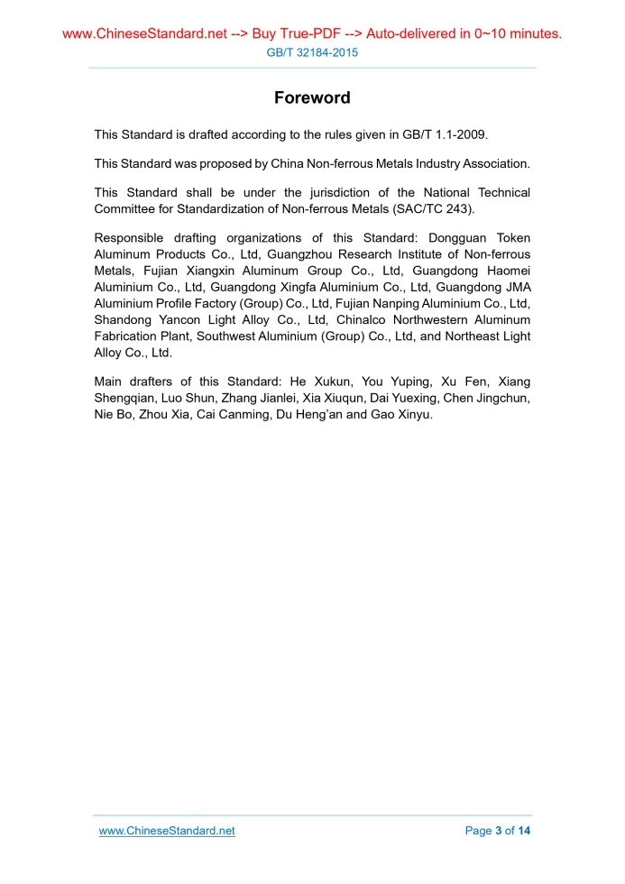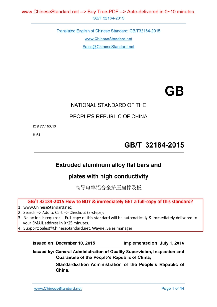 Similar standardsGB/T 32184-2015: Extruded aluminum alloy flat bars and plates with high conductivity---This is an excerpt. Full copy of true-PDF in English version (including equations, symbols, images, flow-chart, tables, and figures etc.), auto-downloaded/delivered in 9 seconds, can be purchased online: https://www.ChineseStandard.net/PDF.aspx/GBT32184-2015GB NATIONAL STANDARD OF THE PEOPLE’S REPUBLIC OF CHINA ICS 77.150.10 H 61 Extruded aluminum alloy flat bars and plates with high conductivity Issued on: DECEMBER 10, 2015 Implemented on: JULY 1, 2016 Issued by. General Administration of Quality Supervision, Inspection and Quarantine of the People’s Republic of China; Standardization Administration of the People’s Republic of China. Table of ContentsForeword ... 3 1 Scope ... 4 2 Normative references ... 4 3 Requirements ... 5 4 Test methods ... 9 5 Inspection rules ... 10 6 Symbols, packaging, transportation, storage and quality certificate ... 12 7 Contents of the order form (or contract) ... 14ForewordThis Standard is drafted according to the rules given in GB/T 1.1-2009. This Standard was proposed by China Non-ferrous Metals Industry Association. This Standard shall be under the jurisdiction of the National Technical Committee for Standardization of Non-ferrous Metals (SAC/TC 243). Responsible drafting organizations of this Standard. Dongguan Token Aluminum Products Co., Ltd, Guangzhou Research Institute of Non-ferrous Metals, Fujian Xiangxin Aluminum Group Co., Ltd, Guangdong Haomei Aluminium Co., Ltd, Guangdong Xingfa Aluminium Co., Ltd, Guangdong JMA Aluminium Profile Factory (Group) Co., Ltd, Fujian Nanping Aluminium Co., Ltd, Shandong Yancon Light Alloy Co., Ltd, Chinalco Northwestern Aluminum Fabrication Plant, Southwest Aluminium (Group) Co., Ltd, and Northeast Light Alloy Co., Ltd. Main drafters of this Standard. He Xukun, You Yuping, Xu Fen, Xiang Shengqian, Luo Shun, Zhang Jianlei, Xia Xiuqun, Dai Yuexing, Chen Jingchun, Nie Bo, Zhou Xia, Cai Canming, Du Heng’an and Gao Xinyu. Extruded aluminum alloy flat bars and plates with high conductivity1 ScopeThis Standard specifies the requirements, test methods, inspection rules, symbols, packaging, transportation, storage, and contents of the quality certificate and order form (or contract) of the extruded aluminum alloy flat bars and plates with high conductivity. This Standard is applicable to the extruded aluminum alloy flat bars and plates used in transmission, substation, distribution and other sectors (hereinafter referred to as “flat bars and plates”).2 Normative referencesThe following documents are essential to the application of this document. For dated references, only the editions with the dates indicated are applicable to this document. For undated references, only the latest editions (including all the amendments) are applicable to this document. GB/T 232 Metallic materials - Bend test GB/T 3048.2 Test methods for electrical properties of electric cables and wires - Part 2. Test of electrical resistivity of metallic materials GB/T 3190 Wrought aluminium and aluminium alloy - Chemical composition GB/T 3199 Wrought aluminium and aluminium alloy products - Packing, marking, transporting and storing GB/T 3246.1 Inspection method for structure of wrought aluminum and aluminum alloy products - Part 1. Inspection method for microstructure GB/T 4909.3 Test methods for bare wires - Part 3. Tensile test GB/T 7999 Optical emission spectrometric analysis method of aluminum and aluminum alloys GB/T 8170 Rules of rounding off for numerical values & expression and judgement of limiting values 3.6 Bending property For the extruded aluminum alloy flat bars and plates with the grade of 6101, BEND the wide surfaces at an angle of 90° with the nominal thickness as bending radius. There shall be no cracks on the wide surfaces. Other requirements shall be agreed upon by the supplier and demander, and shall be indicated in the order forms (or contracts) as well. 3.7 Microstructure There shall be no over-burnt microstructures on the flat bars and plates. 3.8 Appearance quality The surfaces of the flat bars and plates shall be flat and smooth. There shall be no cracks, bubbles and corrosion spots. There shall be no fins, burrs or rips on the rounded corners.4 Test methods4.1 Chemical composition 4.1.1 The analytical method of chemical compositions shall conform to the provisions of GB/T 20975 or GB/T 7999. USE the method specified in GB/T 20975 for referee analysis. During the calculation of “Al” content, TAKE the sum of the numerical values for analysis of the conventional analytic elements and the unconventional analytic elements suspected to be excessive as the “sum of element contents”. 4.1.2 USE the comparison method of rounding values to determine the numerical values for analysis. The rules of rounding off for numerical values shall conform to the relevant provisions of GB/T 8170. The round-off digits shall be the same with the limit digits specified in GB/T 3190. 4.2 Dimensional tolerances The dimensional rounding off and measurement shall conform to the provisions of YS/T 439-2012. 4.3 Tensile mechanical properties at room temperature The method for testing the tensile mechanical properties at room temperature shall conform to the provisions of GB/T 4909.3. 4.4 Resistivity > 280 ~ 500 13 > 500 ~ 1,200 20 5.6 Determination of the inspection results 5.6.1 When the chemical compositions of any test piece are unqualified, for the product whose melting sequence can be distinguished, DETERMINE the melting sequence represented by this test piece as non-conforming. INSPECT other melting sequences in succession. DELIVER the conforming products afterwards. If the products whose melting sequences cannot be distinguished, DETERMINE this batch of products as non-conforming. 5.6.2 When the dimensional tolerance of any test piece is unqualified, DETERMINE this batch of products as non-conforming. However, it is allowed to 