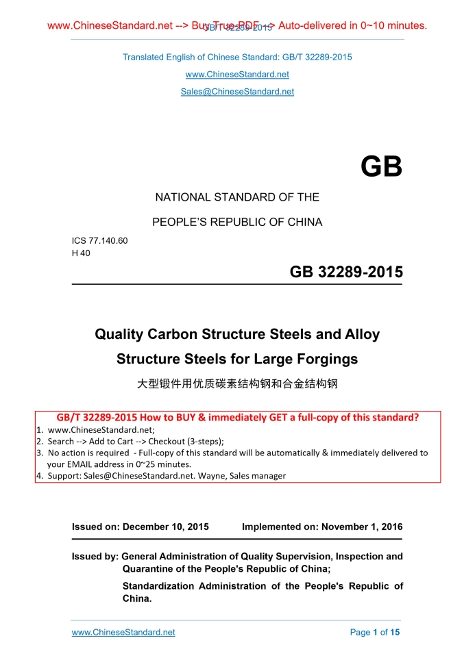 GB/T 32289-2015: Quality Carbon Structure Steels and Alloy Structure Steels for Large Forgings Delivery: 9 seconds. True-PDF full-copy in English & invoice will be downloaded + auto-delivered via email. See step-by-step procedure Status: Valid