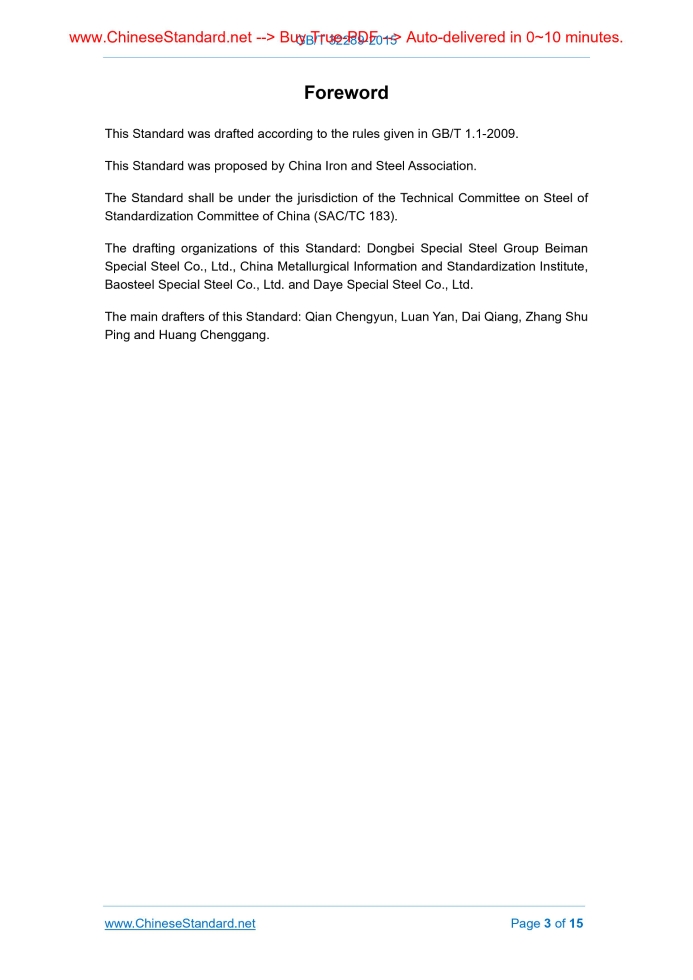 Similar standardsGB/T 32289-2015: Quality Carbon Structure Steels and Alloy Structure Steels for Large Forgings---This is an excerpt. Full copy of true-PDF in English version (including equations, symbols, images, flow-chart, tables, and figures etc.), auto-downloaded/delivered in 9 seconds, can be purchased online: https://www.ChineseStandard.net/PDF.aspx/GBT32289-2015GB NATIONAL STANDARD OF THE PEOPLE’S REPUBLIC OF CHINA ICS 77.140.60 H 40 GB 32289-2015 Quality Carbon Structure Steels and Alloy Structure Steels for Large Forgings Issued on: DECEMBER 10, 2015 Implemented on: NOVEMBER 1, 2016 Issued by. General Administration of Quality Supervision, Inspection and Quarantine of the People's Republic of China; Standardization Administration of the People's Republic of China. Table of ContentsForeword ... 3 1 Scope ... 4 2 Normative References ... 4 3 Classification and Codes ... 6 4 Order Content ... 6 5 Dimensions, Shape, Weight and Allowable Deviations ... 7 6 Technical Requirements ... 8 7 Test Methods ... 13 8 Inspection Rules ... 14 9 Packaging, Marking and Quality Certification ... 15ForewordThis Standard was drafted according to the rules given in GB/T 1.1-2009. This Standard was proposed by China Iron and Steel Association. The Standard shall be under the jurisdiction of the Technical Committee on Steel of Standardization Committee of China (SAC/TC 183). The drafting organizations of this Standard. Dongbei Special Steel Group Beiman Special Steel Co., Ltd., China Metallurgical Information and Standardization Institute, Baosteel Special Steel Co., Ltd. and Daye Special Steel Co., Ltd. The main drafters of this Standard. Qian Chengyun, Luan Yan, Dai Qiang, Zhang Shu Ping and Huang Chenggang. Quality Carbon Structure Steels and Alloy Structure Steels for Large Forgings1 ScopeThis Standard specifies the classification and codes, order content, dimensions, shape, weight and allowable deviations, technical requirements, test methods, inspection rules, packaging, marking and quality certificates of high quality carbon structure steels and alloy structure steels for large forgings. This Standard is applicable to forged round steels with nominal diameter greater than 250 mm ~ 1500 mm, forged square steels with side length greater than 250 mm ~ 1300 mm, and forged flat steels with thickness greater than 250 mm ~ 1000 mm and width greater than 250 mm ~ 1700 mm for normal use (hereinafter referred to as forged steels).2 Normative ReferencesThe following documents are essential to the application of this Standard. For the dated references, only the dated editions are applicable to this Standard. For the undated references, their latest editions (including all amendments) are applicable to this Standard. GB/T 223 Methods for Chemical Analysis of Iron, Steel and Alloy GB/T 225 Steel - Hardenability Test by End Quenching (Jominy Test) GB/T 226 Test Method for Macrostructure and Defect of steel by etching GB/T 228.1 Metallic Materials - Tensile Testing - Part 1. Method of Test at Room Temperature GB/T 229 Metallic Materials - Charpy Notch Impact Test GB/T 231.1 Metallic Materials - Brinell Hardness Test - Part 1. Test Method GB/T 699 Quality Carbon Structural Steels GB/T 908 Forged Bars - Dimensions, Shape, Weight and Tolerances GB/T 1979 Standard Diagrams for Macrostructure and Defect of Structural Steels GB/T 2101 General Provisions on Acceptance, Package, Marking and Quality Certificate for Profile Steel GB/T 2975 Steel and Steel Products - Location and Preparation of Test Pieces for Mechanical Testing GB/T 3077 Alloy Structure Steels GB/T 4162 Forged and Rolled Steel Bars — Method for Ultrasonic Testing GB/T 4336 Carbon and Low-Alloy Steel―Determination of Multi-Element Contents -Spark Discharge Atomic Emission Spectrometric Method (Routine Method) GB/T 6394 Metal - Methods for Estimating the Average Grain Size GB/T 6402-2008 Steel Forgings - Method for Ultrasonic Testing GB/T 7736 Ultrasonic Inspecting Method for Macro-structure and Imperfection of Steel GB/T 8170-2008 Rules of Rounding off for Numerical Values & Expression and Judgement of Limiting Values GB/T 10561 Steel - Determination of Content of Nonmetallic Inclusions - Micrographic Method Using Standards Diagrams GB/T 11261 Steel and Iron - Determination of Oxygen Content - The Pulse Heating Inert Gas Fusion - Infra-Red Absorption Method GB/T 13298 Inspection Methods of Microstructure for Metals GB/T 13299 Steel - Determination of Microstructure GB/T 15711 Steel Products - Method for Etch Test of Tower Sample GB/T 17505 Steel and Steel Products - General Technical Delivery Requirements GB/T 20066 Steel and Iron - Sampling and Preparation of Samples for the Determination of Chemical Composition GB/T 20123 Steel and Iron—Determination of Total Carbon and Sulphur Content Infrared Absorption Method after Combustion in an Induction Furnace (Routine Method) GB/T 20124 Steel and Iron - Determination of Nitrogen Content - Thermal Conductimetric Method after Fusion in a Current of Inert Gas 6.3 Delivery state 6.3.1 The forgings are normally delivered in the state of annealing treatment. 6.3.2 If the purchaser requires and it is indicated in the contract, they can also be delivered in the state of high temperature tempering, normalizing and tempering + normalizing treatment. 6.3.3 If the purchaser requires and it is indicated in the contract, they can also be delivered in the state of special surface treatment (polishing or skinning). 6.4 Manufacturing process The forgings shall be forged and formed with a forging press with sufficient capacity. Their forging ratio shall meet the following requirements. a) For the forgings for thermal pressure processing or the forgings made of electroslag steel ingot, their forging ratio shall not be less than 2.0; b) For the forgings upset in the middle, their forging ratio shall not be less than 2.5; c) For the forgings used in cutting processing, their forging ratio shall not be less than 3.0. 6.5 M