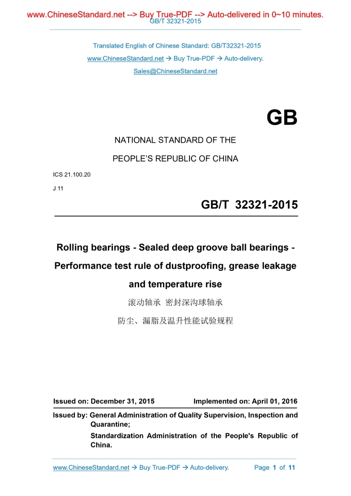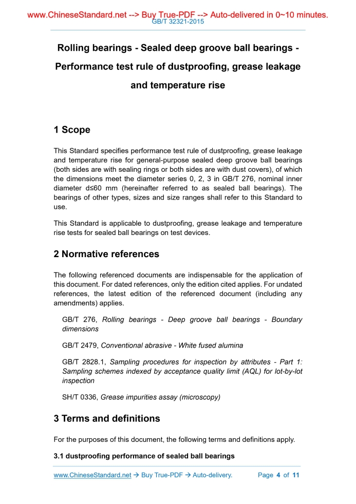 Similar standardsGB/T 32321-2015: Rolling bearings - Sealed deep groove ball bearings - Performance test rule of dustproofing, grease leakage and temperature rise---This is an excerpt. Full copy of true-PDF in English version (including equations, symbols, images, flow-chart, tables, and figures etc.), auto-downloaded/delivered in 9 seconds, can be purchased online: https://www.ChineseStandard.net/PDF.aspx/GBT32321-2015 NATIONAL STANDARD OF THE PEOPLE’S REPUBLIC OF CHINA ICS 21.100.20 J 11 Rolling bearings - Sealed deep groove ball bearings - Performance test rule of dustproofing, grease leakage and temperature rise 滚动轴承 密封深沟球轴承 ISSUED ON: DECEMBER 31, 2015 IMPLEMENTED ON: APRIL 01, 2016 Issued by: General Administration of Quality Supervision, Inspection and Quarantine; Standardization Administration of the People's Republic of China. Table of ContentsForeword ... 3 1 Scope ... 4 2 Normative references ... 4 3 Terms and definitions ... 4 4 Symbols ... 5 5 Test preparations ... 6 6 Test conditions ... 7 7 Test processes ... 8 8 Test results ... 9ForewordThis Standard was drafted in accordance with the rules given in GB/T 1.1-2009. This Standard was proposed by China Machinery Industry Federation. This Standard shall be under the jurisdiction of National Technical Committee on Rolling Bearings of Standardization Administration of China (SAC/TC 98). The drafting organizations of this Standard: Luoyang Bearing Research Institute Co., Ltd. Main drafters of this Standard: Zhang Wei, Zheng Zhigong, Zhang Zhenchao. Rolling bearings - Sealed deep groove ball bearings - Performance test rule of dustproofing, grease leakage and temperature rise1 ScopeThis Standard specifies performance test rule of dustproofing, grease leakage and temperature rise for general-purpose sealed deep groove ball bearings (both sides are with sealing rings or both sides are with dust covers), of which the dimensions meet the diameter series 0, 2, 3 in GB/T 276, nominal inner diameter d≤60 mm (hereinafter referred to as sealed ball bearings). The bearings of other types, sizes and size ranges shall refer to this Standard to use. This Standard is applicable to dustproofing, grease leakage and temperature rise tests for sealed ball bearings on test devices.2 Normative referencesThe following referenced documents are indispensable for the application of this document. For dated references, only the edition cited applies. For undated references, the latest edition of the referenced document (including any amendments) applies. GB/T 276, Rolling bearings - Deep groove ball bearings - Boundary dimensions GB/T 2479, Conventional abrasive - White fused alumina GB/T 2828.1, Sampling procedures for inspection by attributes - Part 1: Sampling schemes indexed by acceptance quality limit (AQL) for lot-by-lot inspection SH/T 0336, Grease impurities assay (microscopy)3 Terms and definitionsFor the purposes of this document, the following terms and definitions apply. 3.1 dustproofing performance of sealed ball bearings the ability of sealed ball bearings to prevent external dust from entering the interior of the bearing chamber during bearing operation 3.2 dustproofing performance test the test that when the sealed ball bearing is placed in a specific dust environment, when it is running under the specified test conditions, determine its dustproofing performance according to the invasion of external dust into the interior of bearing chamber 3.3 grease leakage performance of sealed ball bearings the performance of sealed ball bearings to prevent the grease in the bearing chamber from leaking to the outside of the bearing during bearing operation 3.4 grease leakage performance test the test that when sealed ball bearing is running under the specified test conditions, determine its grease leakage resistance performance according to the grease leakage in the bearing chamber 3.5 temperature rise performance of sealed ball bearings the degree of the maximum TEMPERATURE of outer surface of outer ring of sealed ball bearings THAT IS higher than ambient temperature during bearing operation 3.6 temperature rise performance test the test that when sealed ball bearing is running under the specified test conditions, determine its temperature rise performance according to the difference BETWEEN the actual measured temperature of outer surface of outer ring AND ambient temperature4 SymbolsThe symbols given in GB/T 2828.1 as well as the followings apply to this document. N: Sample size n0: Limit speed of contact sealed ball bearings, r/min V: Effective space volume of dust medium box of dustproofing performance test, mL5 Test preparations5.1 Bearing sample 5.1.1 Randomly extract sample from the finished sealed ball bearings of same model, same batch that are inspected as accepted. 5.1.2 Extract 12 sets of samples for each test. The test sample size N=8. The rest 4 sets are for analysis and use. 5.1.3 At the end face of the bearing sample, write item number and serial number separately and set by set. 5.1.4 Before each test, wipe the surface of bearing sample clean. There shall be no oil stains and dusts. 5.2 Dust medium 5.2.1 The dust medium used for dustproofing performance test is white corundum that the granularity meets the provisions of GB/T 2479, that is marked as F240 (micro-powder). 5.2.2 Bake the dust medium in a drying oven at 110°C ± 10°C for 1 h. Place in a dryer to cool. 5.2.3 Use a clean measuring cup to measure the cooled dust medium. 5.3 Mass weighing 5.3.1 The balance used for grease leakage performance test shall be regularly verified as qualified. Its weighing range and accuracy shall meet the test requirements. 5.3.2 Weigh the pre-test bearing sample mass before test for grease leakage performance. 5.4 Temperature measuring apparatus The temperature measuring apparatus for temperature rise performance test shall be regularly verified as qualified. Its temperature measuring range and accuracy shall meet th
