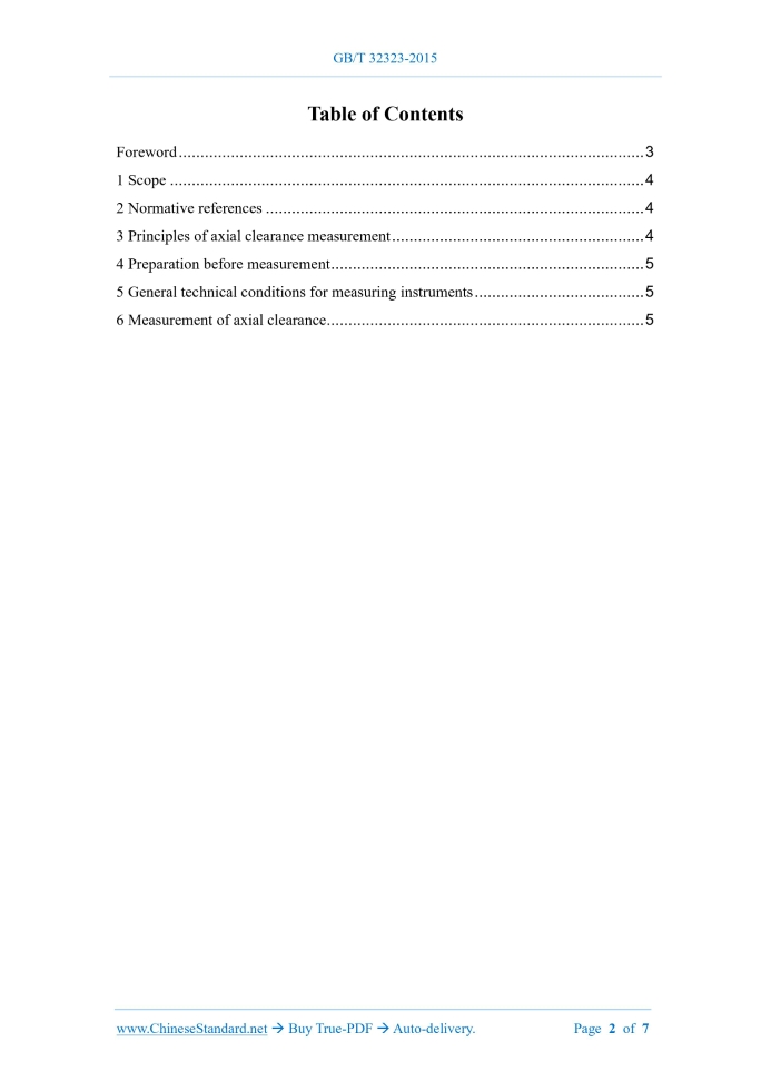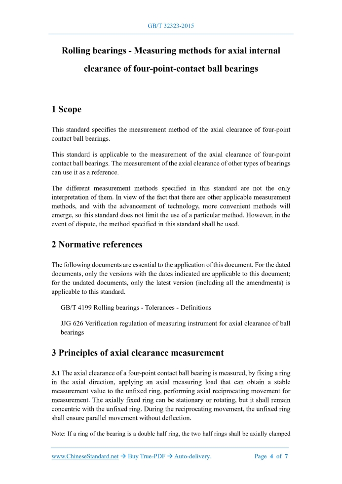 Similar standardsGB/T 32323-2015: Rolling bearings - Measuring methods for axial internal clearance of four-point-contact ball bearings---This is an excerpt. Full copy of true-PDF in English version (including equations, symbols, images, flow-chart, tables, and figures etc.), auto-downloaded/delivered in 9 seconds, can be purchased online: https://www.ChineseStandard.net/PDF.aspx/GBT32323-2015 GB NATIONAL STANDARD OF THE PEOPLE’S REPUBLIC OF CHINA ICS 21.100.20 J 11 Rolling bearings - Measuring methods for axial internal clearance of four-point-contact ball bearings Issued on: DECEMBER 31, 2015 Implemented on: APRIL 01, 2016 Issued by. General Administration of Quality Supervision, Inspection and Quarantine of PRC; National Standardization Administration. Table of ContentsForeword... 3 1 Scope... 4 2 Normative references... 4 3 Principles of axial clearance measurement... 4 4 Preparation before measurement... 5 5 General technical conditions for measuring instruments... 5 6 Measurement of axial clearance... 5 Rolling bearings - Measuring methods for axial internal clearance of four-point-contact ball bearings1 ScopeThis standard specifies the measurement method of the axial clearance of four-point contact ball bearings. This standard is applicable to the measurement of the axial clearance of four-point contact ball bearings. The measurement of the axial clearance of other types of bearings can use it as a reference. The different measurement methods specified in this standard are not the only interpretation of them. In view of the fact that there are other applicable measurement methods, and with the advancement of technology, more convenient methods will emerge, so this standard does not limit the use of a particular method. However, in the event of dispute, the method specified in this standard shall be used.2 Normative referencesThe following documents are essential to the application of this document. For the dated documents, only the versions with the dates indicated are applicable to this document; for the undated documents, only the latest version (including all the amendments) is applicable to this standard. GB/T 4199 Rolling bearings - Tolerances - Definitions JJG 626 Verification regulation of measuring instrument for axial clearance of ball bearings3 Principles of axial clearance measurement3.1 The axial clearance of a four-point contact ball bearing is measured, by fixing a ring in the axial direction, applying an axial measuring load that can obtain a stable measurement value to the unfixed ring, performing axial reciprocating movement for measurement. The axially fixed ring can be stationary or rotating, but it shall remain concentric with the unfixed ring. During the reciprocating movement, the unfixed ring shall ensure parallel movement without deflection. Note. If a ring of the bearing is a double half ring, the two half rings shall be axially clamped tightly during measurement, to achieve a state that can be regarded as one ring. 3.2 Read the movement of the non-fixed ring along the axial direction from one extreme position to another at each angular position (roughly evenly distributed, at least 3); the arithmetic mean value (minus the increase in axial clearance caused by the measuring load) is the measured value of the bearing axial clearance. If it is a dynamic measurement, the average value is automatically calculated; more than 50 points are sampled per cycle.4 Preparation before measurementBefore measurement, the grease and/or rust inhibitor adhering to the bearing that may affect the measurement results shall be removed; low-viscosity oil lubrication shall be used. For closed bearings, the measurement shall be made before closing. Note. After the measurement is completed, the bearing shall be immediately rust-proofed.5 General technical conditions for measuring instrumentsThe design and use conditions of the axial clearance measuring instrument shall comply with the definition of bearing axial clearance in GB/T 4199; the technical requirements shall comply with JJG 626 or other relevant provisions.6 Measurement of axial clearance6.1 Instrument measurement method This method is applicable to four-point contact ball bearings with d ≤ 260 mm. 6.1.1 Fix the outer ring (or inner ring) of the bearing in the axial direction. Keep it stationary or rotate in the circumferential direction (for dynamic measurement). Evenly and alternately apply the axial measurement load shown in Table 1 to the inner ring (or outer ring), so that the inner ring (or outer ring) of the bearing moves axially. The bearing clearance measurement value can be read from the indicator (see Figure 1 and Figure 2). Note. During dynamic measurement, the measured ring shall have a guide mechanism or deflection elimination mechanism during the reciprocating movement, to eliminate the error caused by the ring deflection. 6.1.2 Since the axial clearance specified for the bearing is the value under no-load state, the result of the load measurement shall indicate the measured load value; the measured ......Source: Above contents are excerpted from the full-copy PDF -- translated/reviewed by: www.ChineseStandard.net / Wayne Zheng et al. Tips & Frequently Asked Questions:Question 1: How long will the true-PDF of English version of GB/T 32323-2015 be delivered?Answer: The full copy PDF of English version of GB/T 32323-2015 can be downloaded in 9 seconds, and it will also be emailed to you in 9 seconds (double mechanisms to ensure the delivery reliably), with PDF-invoice.Question 2: Can I share the purchased PDF of GB/T 32323-2015_English with my colleagues?Answer: Yes. The purchased PDF of GB/T 32323-2015_English will be deemed to be sold to your employer/organization who actually paid for it, including your colleagues and your employer's intranet.Question 3: Does the price include tax/VAT?Answer: Yes. Our tax invoice, downloaded/delivered in 9 seconds, includes all tax/VAT and complies with 100+ countries