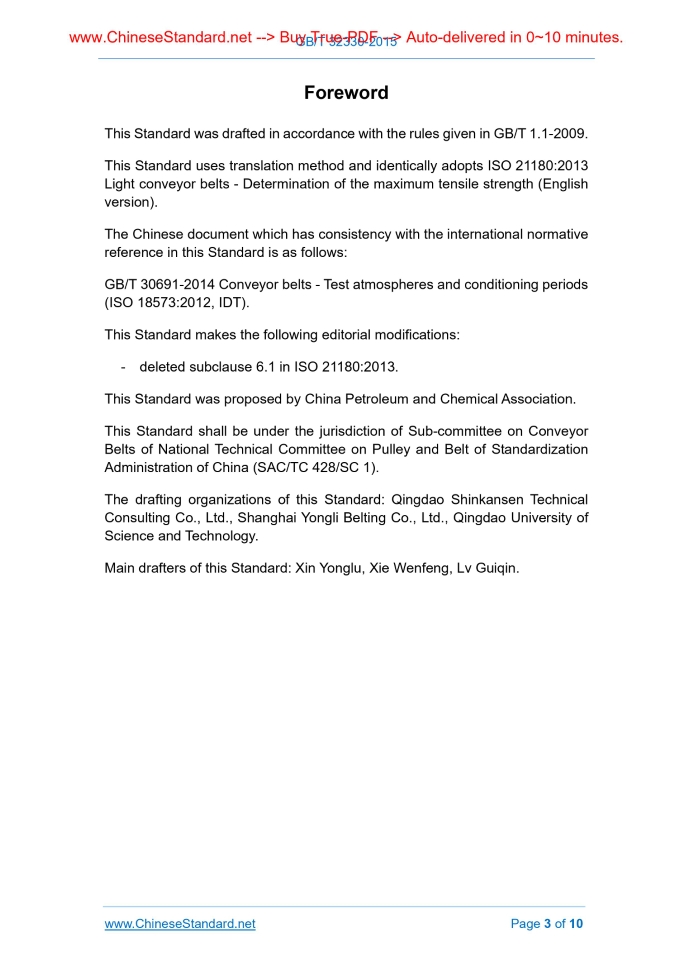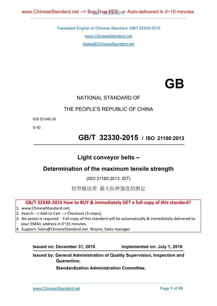 GB/T 32330-2015: Light conveyor belts -- Determination of the maximum tensile strength Delivery: 9 seconds. True-PDF full-copy in English & invoice will be downloaded + auto-delivered via email. See step-by-step procedure Status: Valid