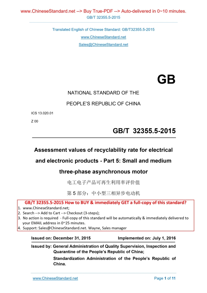 GB NATIONAL STANDARD OF THE PEOPLE’S REPUBLIC OF CHINA ICS 13.020.01 Z 00 Assessment values of recyclability rate for electrical and electronic products - Part 5. Small and medium three-phase asynchronous motor Issued on: DECEMBER 31, 2015 Implemented on: JULY 1, 2016 Issued by. General Administration of Quality Supervision, Inspection and Quarantine of the People’s Republic of China; Standardization Administration of the People’s Republic of China.