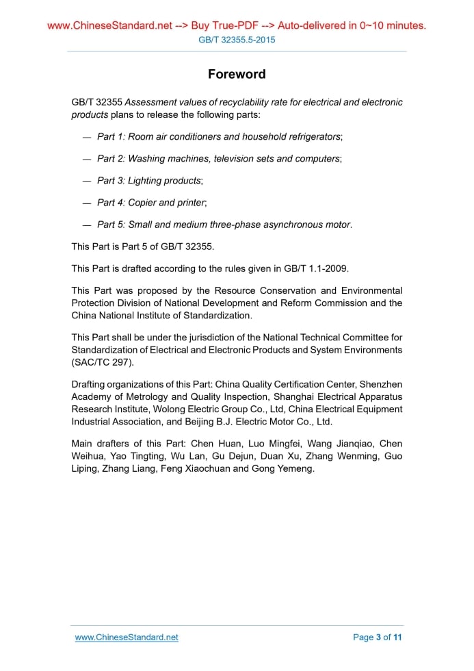 GB/T 32355 Assessment values of recyclability rate for electrical and electronic products plans to release the following parts. — Part 1. Room air conditioners and household refrigerators; — Part 2. Washing machines, television sets and computers; — Part 3. Lighting products; — Part 4. Copier and printer; — Part 5. Small and medium three-phase asynchronous motor. This Part is Part 5 of GB/T 32355. This Part is drafted according to the rules given in GB/T 1.1-2009. This Part was proposed by the Resource Conservation and Environmental Protection Division of National Development and Reform Commission and the China National Institute of Standardization. This Part shall be under the jurisdiction of the National Technical Committee for Standardization of Electrical and Electronic Products and System Environments (SAC/TC 297). Drafting organizations of this Part. China Quality Certification Center, Shenzhen Academy of Metrology and Quality Inspection, Shanghai Electrical Apparatus Research Institute, Wolong Electric Group Co., Ltd, China Electrical Equipment Industrial Association, and Beijing B.J. Electric Motor Co., Ltd. Main drafters of this Part. Chen Huan, Luo Mingfei, Wang Jianqiao, Chen Weihua, Yao Tingting, Wu Lan, Gu Dejun, Duan Xu, Zhang Wenming, Guo Liping, Zhang Liang, Feng Xiaochuan and Gong Yemeng. Assessment values of recyclability rate for electrical and electronic products - Part 5. Small and medium three-phase asynchronous motor