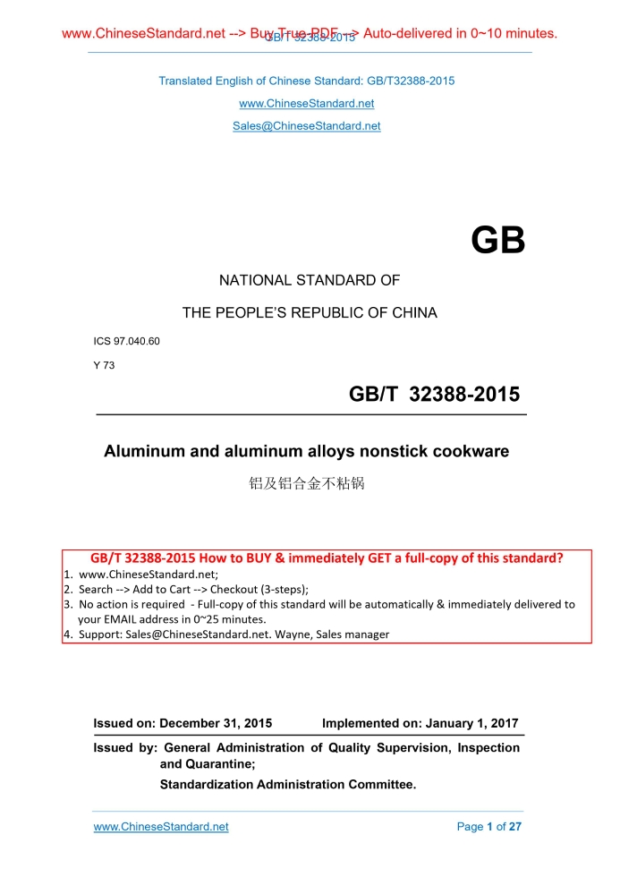 GB/T 32388-2015: Aluminum and aluminum alloys nonstick cookware Delivery: 9 seconds. True-PDF full-copy in English & invoice will be downloaded + auto-delivered via email. See step-by-step procedure Status: Valid