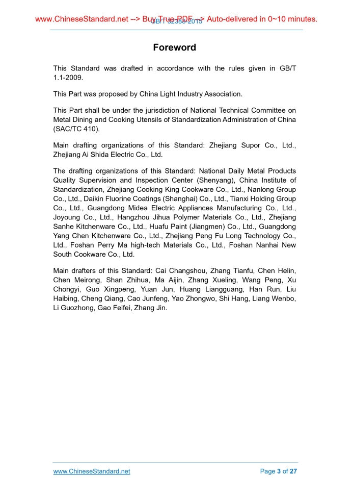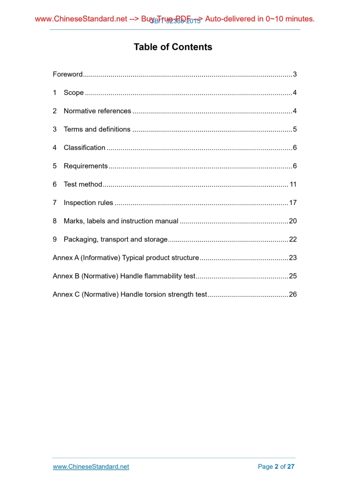 Similar standardsGB/T 32388-2015: Aluminum and aluminum alloys nonstick cookware---This is an excerpt. Full copy of true-PDF in English version (including equations, symbols, images, flow-chart, tables, and figures etc.), auto-downloaded/delivered in 9 seconds, can be purchased online: https://www.ChineseStandard.net/PDF.aspx/GBT32388-2015GB NATIONAL STANDARD OF THE PEOPLE’S REPUBLIC OF CHINA ICS 97.040.60 Y 73 Aluminum and aluminum alloys nonstick cookware Issued on: DECEMBER 31, 2015 Implemented on: JANUARY 1, 2017 Issued by. General Administration of Quality Supervision, Inspection and Quarantine; Standardization Administration Committee. Table of ContentsForeword ... 3 1 Scope ... 4 2 Normative references ... 4 3 Terms and definitions ... 5 4 Classification ... 6 5 Requirements ... 6 6 Test method ... 11 7 Inspection rules ... 17 8 Marks, labels and instruction manual ... 20 9 Packaging, transport and storage ... 22 Annex A (Informative) Typical product structure ... 23 Annex B (Normative) Handle flammability test ... 25 Annex C (Normative) Handle torsion strength test ... 26ForewordThis Standard was drafted in accordance with the rules given in GB/T 1.1-2009. This Part was proposed by China Light Industry Association. This Part shall be under the jurisdiction of National Technical Committee on Metal Dining and Cooking Utensils of Standardization Administration of China (SAC/TC 410). Main drafting organizations of this Standard. Zhejiang Supor Co., Ltd., Zhejiang Ai Shida Electric Co., Ltd. The drafting organizations of this Standard. National Daily Metal Products Quality Supervision and Inspection Center (Shenyang), China Institute of Standardization, Zhejiang Cooking King Cookware Co., Ltd., Nanlong Group Co., Ltd., Daikin Fluorine Coatings (Shanghai) Co., Ltd., Tianxi Holding Group Co., Ltd., Guangdong Midea Electric Appliances Manufacturing Co., Ltd., Joyoung Co., Ltd., Hangzhou Jihua Polymer Materials Co., Ltd., Zhejiang Sanhe Kitchenware Co., Ltd., Huafu Paint (Jiangmen) Co., Ltd., Guangdong Yang Chen Kitchenware Co., Ltd., Zhejiang Peng Fu Long Technology Co., Ltd., Foshan Perry Ma high-tech Materials Co., Ltd., Foshan Nanhai New South Cookware Co., Ltd. Main drafters of this Standard. Cai Changshou, Zhang Tianfu, Chen Helin, Chen Meirong, Shan Zhihua, Ma Aijin, Zhang Xueling, Wang Peng, Xu Chongyi, Guo Xingpeng, Yuan Jun, Huang Liangguang, Han Run, Liu Haibing, Cheng Qiang, Cao Junfeng, Yao Zhongwo, Shi Hang, Liang Wenbo, Li Guozhong, Gao Feifei, Zhang Jin. Aluminum and aluminum alloys nonstick cookware1 ScopeThis Standard specifies the terms and definitions, product classification, requirements, test method, inspection rules, marks, labels, instruction manual as well as packaging, transport, storage of aluminum and aluminum alloys nonstick cookware (hereinafter referred to as nonstick cookware). This Standard applies to household cooking utensils of which aluminum and aluminum alloy are used as the substrate (including the inner surface of aluminum or aluminum alloy composite), the surface contacting with food uses non-stick coating treatment, including frying cookware, cooking utensils, rice cookers, etc. This Standard is not applicable to baking utensils.2 Normative referencesThe following referenced documents are indispensable for the application of this document. For dated references, only the edition cited applies. For undated references, the latest edition of the referenced document (including any amendments) applies. GB/T 191, Packaging and storage marks GB/T 2828.1, Sampling procedures for inspection by attributea-Part1. Sampling schemes indexed by acceptance quality limit(AQL) for lot-by-lot inspection GB/T 2829, Sampling procedures and tables for periodic inspection by attributes (Apply to inspection of process stability) GB/T 5009.72, Method for Analysis of Hygienic Standard of Aluminum-wares for Food Use GB/T 5009.80, Method for analysis of hygienic standard of polytetrafluorethylene coating for inner wall of food cookware GB/T 6388, Transport package shipping mark GB/T 6543, Single and double corrugated boxes for transport packages GB/T 6544, Corrugated fiberboard GB/T 6739, Paints and varnishes - Determination of film hardness by pencil test GB 11333, Hygienic Standard for Aluminum-wares for Food Use GB 11678, Hygienic standard for polytetrafluorethylene used as inner coating of food containers GB/T 32095.1-2015, Performance and test methods of non-stick surface of domestic metal cooking utensils for household food - Part 1. General requirement of performance GB/T 32095.2-2015, Performance and test methods of non-stick surface of domestic metal cooking utensils for household food - Part 2. Test specification of non-stick performance and abrasion resistance GB/T 32095.3-2015, Performance and test methods of non-stick surface of domestic metal utensils for household food - Part 3. Test specification of corrosion resistance3 Terms and definitionsFor the purposes of this document, the following terms and definitions apply. 3.1 non-stick coating the inner surface of the cookware is coated with a coating to form a coating having a non-sticking property 3.2 heat resistance coating a special paint that is able to withstand more than 200°C 3.3 aluminium porcelain enamel a special enamel that can be applied to aluminum 3.4 continuing non-stick performance the non-stickiness of non-stick coating after non-sticking test 3.5 adhesion the degree of adhesion of the coating and the substrate 3.6 peeling resistance 5.5.3 Handle firmness Carry out the test according to 6.2.7. The handle and its components should not be loose, no deformation, no cracks in the handle, no water at the junction. 5.5.4 Handle (containing pot button) surface temperature When carrying out the test according to 6.2.8, the maximum temperature of the following materials shall not exceed. a) plastic 70°C; b) metal 55°C; c) wood 89°C; d) ceramics, glass, stone 66°C. 5.5.5 Flame resistance of handle C