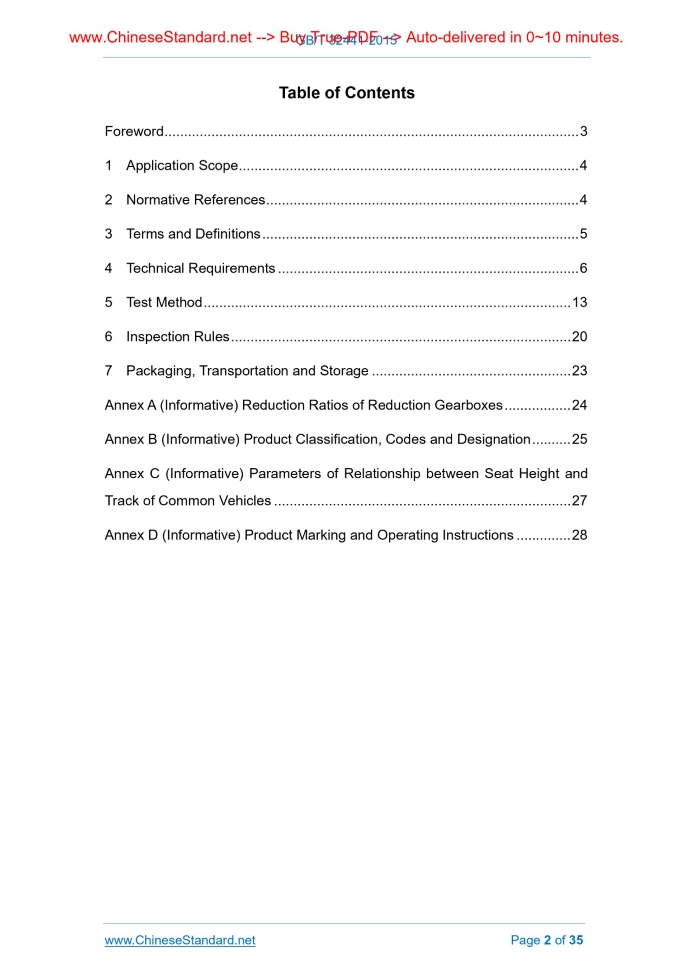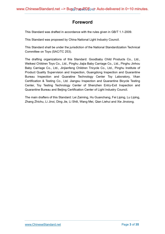 Similar standardsGB/T 32441-2015: General Technical Requirements of Electrically Driven Vehicles for Children---This is an excerpt. Full copy of true-PDF in English version (including equations, symbols, images, flow-chart, tables, and figures etc.), auto-downloaded/delivered in 9 seconds, can be purchased online: https://www.ChineseStandard.net/PDF.aspx/GBT32441-2015GB NATIONAL STANDARD OF THE PEOPLE’S REPUBLIC OF CHINA ICS 97.200.50 Y 57 General Technical Requirements of Electrically Driven Vehicles for Children Issued on: DECEMBER 31, 2015 Implemented on: JANUARY 1, 2017 Issued by. State Administration of Quality Supervision, Inspection and Quarantine of the People’s Republic of China; Standardization Administration of the People's Republic of China. Table of ContentsForeword ... 3 1 Application Scope ... 4 2 Normative References ... 4 3 Terms and Definitions ... 5 4 Technical Requirements ... 6 5 Test Method ... 13 6 Inspection Rules ... 20 7 Packaging, Transportation and Storage ... 23 Annex A (Informative) Reduction Ratios of Reduction Gearboxes ... 24 Annex B (Informative) Product Classification, Codes and Designation ... 25 Annex C (Informative) Parameters of Relationship between Seat Height and Track of Common Vehicles ... 27 Annex D (Informative) Product Marking and Operating Instructions ... 28ForewordThis Standard was drafted in accordance with the rules given in GB/T 1.1-2009. This Standard was proposed by China National Light Industry Council. This Standard shall be under the jurisdiction of the National Standardization Technical Committee on Toys (SAC/TC 253). The drafting organizations of this Standard. Goodbaby Child Products Co., Ltd., Weikesi Children Toys Co., Ltd., Pinghu Jiajia Baby Carriage Co., Ltd., Pinghu Jinhou Baby Carriage Co., Ltd., Jinjianfeng Children Tricycle Co., Ltd., Pinghu Institute of Product Quality Supervision and Inspection, Guangdong Inspection and Quarantine Bureau Inspection and Quaratine Technology Center Toy Laboratory, Vkan Certification & Testing Co., Ltd. Jiangsu Inspection and Quarantine Bicycle Testing Center, Toy Testing Technology Center of Shenzhen Entry-Exit Inspection and Quarantine Bureau and Beijing Certification Center of Light Industry Council. The main drafters of this Standard. Lei Zaiming, Hu Guanchang, Fei Liping, Lu Liping, Zhang Zhichu, Li Jinxi, Ding Jie, Li Shili, Wang Mei, Qian Liehui and Xie Jinxiong. General Technical Requirements of Electrically Driven Vehicles for Children1 Application ScopeThis Standard specifies the general technical requirements and test methods for electrically driven vehicles for children. NOTE The safety requirements for electrically driven vehicles for children are specified in GB 6675.1 to GB 6675.4 and GB 19865. This Standard applies to electrically driven vehicles for children under 14 years old. This Standard does not apply to electrically driven vehicles for children for the following intended applications. -- special-purpose electrically driven ride-on vehicle for children, such as electrically driven vehicles for children for beach and electrically driven vehicles for children for racing; and -- electrically driven vehicles for children for public places and commercial purposes.2 Normative ReferencesThe following referenced documents are indispensable for the application of this document. For dated references, only the edition dated applies to this document. For undated references, the latest edition of the referenced documents (including all amendments) applies to this Standard. GB 5296.5, Instructions for use of products of consumer interest – Part 5. toys GB 6675.1, Toys safety – Part 1. Basic code GB 6675.2, Safety of toys – Part 2. Mechanical and physical properties GB 6675.3, Safety of toys – Part 3. Flammability GB 6675.4, Safety of toys – Part 4. Migration of certain elements GB 19865, Electric toys – Safety GB/T 22753, Technical requirements of surface coatings on toys GB/T 29777, Toy coating technology condition3 Terms and DefinitionsFor the purpose of this document, the following terms and definitions apply. NOTE The term “month” used in this Standard indicates a complete number of months (e.g. 18 months indicates 18 months old and below). 3.1 Electrically driven vehicles for children the toy vehicles intended to be ridden-on by children under 14 years old, driven by electric battery and not intended for traffic, such as the electrically driven vehicles for children including bicycles (equipped with jockey pulley devices), tricycles and quadricycles. 3.2 track the distance between two wheels sharing the same axle, i.e. the external dimension of two wheels in contact with the ground. If the wheels have a second contact surface with the height difference not greater than 3 mm in the design, they can be deemed as the actual contact points. 3.3 steering gear the mechanism assembly which is used to control the direction of vehicles manually or remotely 3.4 basket box (basket) or similar device on vehicles used for decoration or to carry a small load 3.5 assist-push-rod the mechanism with which a guardian helps riding children go forward and backward or steer through a push rod 3.6 jockey pulley device 4.5.3 Remote-control distance Under regular service conditions, the maximum remote control capacity tested in accordance with 5.6.2 shall not be less than 80% of the nominal remote control distance or range value of the products. 4.5.4 Key configuration Remote control shall not be provided with vehicle automatic driving key or automatic switch or similar key functions. 4.5.5 Drop resistance of remote control After the drop test in accordance with 5.6.3, remote control shall not have any structural or functional damage. 4.6 Control device 4.6.1 Location and operating performance The devices used to control all functions and speeds of electrically driven vehicles for children, including switches, keys, rotary knobs, handles and rotary handles, shall be at the locat