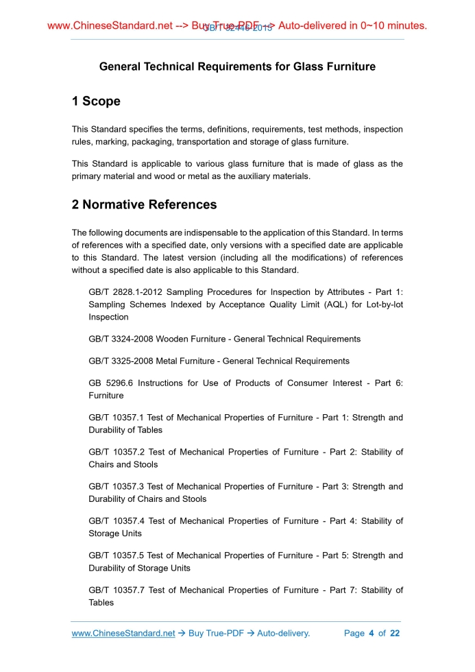 Similar standardsGB/T 32446-2015: General Technical Requirements for Glass Furniture---This is an excerpt. Full copy of true-PDF in English version (including equations, symbols, images, flow-chart, tables, and figures etc.), auto-downloaded/delivered in 9 seconds, can be purchased online: https://www.ChineseStandard.net/PDF.aspx/GBT32446-2015GB NATIONAL STANDARD OF THE PEOPLE’S REPUBLIC OF CHINA ICS 97.140 Y 80 General Technical Requirements for Glass Furniture Issued on: DECEMBER 31, 2015 Implemented on: JULY 1, 2016 Issued by. General Administration of Quality Supervision, Inspection and Quarantine; Standardization Administration Committee of the People’s Republic of China. Table of ContentsForeword... 3 1 Scope... 4 2 Normative References... 4 3 Terms and Definitions... 5 4 Classification... 5 5 Requirements... 6 6 Test Methods... 15 7 Inspection Rules... 19 8 Marking, Instruction for Use, Packaging, Transportation and Storage... 21 General Technical Requirements for Glass Furniture1 ScopeThis Standard specifies the terms, definitions, requirements, test methods, inspection rules, marking, packaging, transportation and storage of glass furniture. This Standard is applicable to various glass furniture that is made of glass as the primary material and wood or metal as the auxiliary materials.2 Normative ReferencesThe following documents are indispensable to the application of this Standard. In terms of references with a specified date, only versions with a specified date are applicable to this Standard. The latest version (including all the modifications) of references without a specified date is also applicable to this Standard. GB/T 2828.1-2012 Sampling Procedures for Inspection by Attributes - Part 1. Sampling Schemes Indexed by Acceptance Quality Limit (AQL) for Lot-by-lot Inspection GB/T 3324-2008 Wooden Furniture - General Technical Requirements GB/T 3325-2008 Metal Furniture - General Technical Requirements GB 5296.6 Instructions for Use of Products of Consumer Interest - Part 6. Furniture GB/T 10357.1 Test of Mechanical Properties of Furniture - Part 1.Strength and Durability of Tables GB/T 10357.2 Test of Mechanical Properties of Furniture - Part 2.Stability of Chairs and Stools GB/T 10357.3 Test of Mechanical Properties of Furniture - Part 3.Strength and Durability of Chairs and Stools GB/T 10357.4 Test of Mechanical Properties of Furniture - Part 4.Stability of Storage Units GB/T 10357.5 Test of Mechanical Properties of Furniture - Part 5.Strength and Durability of Storage Units GB/T 10357.7 Test of Mechanical Properties of Furniture - Part 7.Stability of Tables d) Glass sliding doors.5 Requirements5.1 Main Dimensional Deviation (general items) The limit deviation of the external width, depth and height of glass furniture product is ± 5 mm; the limit deviation of matching products or combined products shall be positive or negative at the same time. 5.2 Tolerance of Shape and Position Tolerance of shape and position shall comply with the stipulation in Table 1 below. Table 1 -- Tolerance of Shape and Position No. Test Item Requirement ClassificationBasic General 1 Warpage Panel, envisaged panel part, diagonal length ≥1400 ≤ 3.0 √ (700, 1400) ≤ 2.0 √ ≤ 700 ≤ 1.0 √ 2 Flatness Panel, envisaged panel part ≤ 0.2 √ 3 Adjacent perpendicularity Panel, framework Diagonal length ≥ 1000 Length difference ≤ 3 √ < 1000 Length difference ≤ 2 √ Length of opposite side ≥ 1000 Opposite length difference ≤ 3 √ < 1000 Opposite length difference ≤ 2 √ 4 Dislocation Distance deviation (not the distance requested in design) between door and framework, door and adjacent door surface, drawer and framework, drawer and door, drawer and 2 adjacent surfaces ≤ 2.0 5 Splitting All the splitting (not requested in design) ≤ 2.0 √ 6 Footing smoothness ≤ 2.0 √ 7 Drawer droop ≤ 20 √ 8 Drawer swinging ≤ 15 √ 5.3 Appearance Requirement Appearance requirement shall comply with the stipulation in Table 2 below. compact; seam of mold splitting shall not affect the appearance Other appearance requirements There shall be no burr, cutting edge or corner angle on parts that are exposed to human body or collectibles The connection of fixed parts shall be firm; there shall be no missing part, missing nail or penetrating nail (apart from reserved hole and optional hole) 52 There shall be no de-coloration or color fading on all the coating surfaces √ Woodworking requirements Non-contacting interface of artificial panel shall be sealed or processed with coating √ Panel or part that contacts human beings or storage area shall manifest no burr, cutting edge or corner angle The appearance of panel or part shall be smooth; chamfered edge, circular bead or thread shall be consistent 56 There shall be no degumming, bubble or crack on the sealed and covered edge √ 57 The veneer shall be tight and flat; there shall be no obvious glue penetration √ 58 The juncture of tenon, block and part shall manifest no breakage √ 59 The juncture of part shall be tight and firm √ There shall be no missing part, missing nail or penetrating nail in the installation of various parts and adapting pieces (other than reserved hole and optional hole) The installation of various parts shall be rigorous, flat and firm; the junctures shall manifest no crack or loosening 62 After installation, switching-on/off part shall be flexible √ Engraved pattern shall be uniform, distinct and well-bedded; symmetric part shall be symmetric; there shall be no unfilled corner on convex and concave, gap bridge, corner angle and arc; shoved bottom shall be flat; there shall be no hammering stamp or burr on each part. The number of defects shall be < 4 64 The linear of wood piece shall be consistent; √ Table 4 -- Safety Requirements No. Test Item Requirement ClassificationBasic General 1 Characteristic dimension Characteristic dimension shall comply with the stipulation in 5.1 in GB 28008-2011 2 