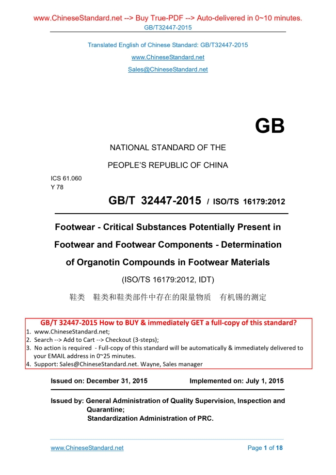 GB/T 32447-2015: Footwear -- Critical substances potentially present in footwear and footwear components -- Determination of organotin compounds in footwear materials Delivery: 9 seconds. True-PDF full-copy in English & invoice will be downloaded + auto-delivered via email. See step-by-step procedure Status: Valid