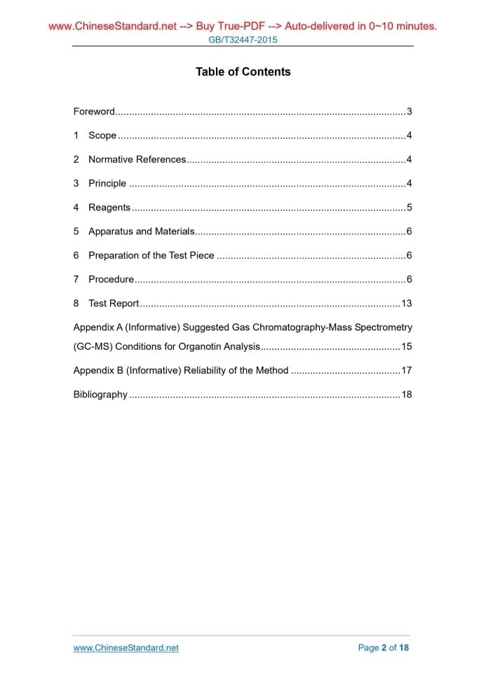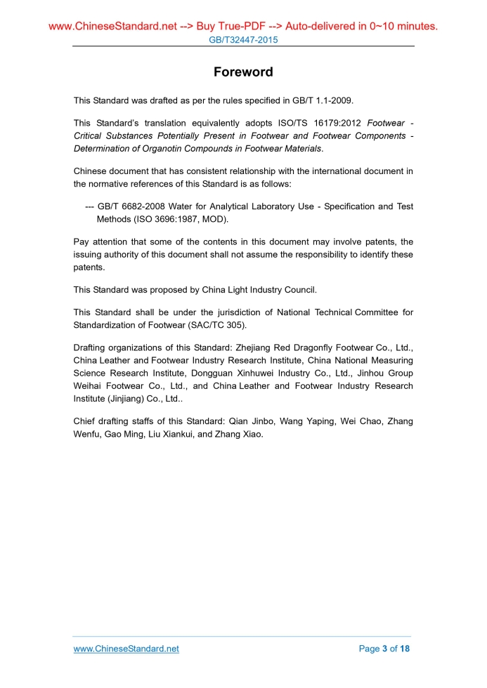 Similar standardsGB/T 32447-2015: Footwear -- Critical substances potentially present in footwear and footwear components -- Determination of organotin compounds in footwear materials---This is an excerpt. Full copy of true-PDF in English version (including equations, symbols, images, flow-chart, tables, and figures etc.), auto-downloaded/delivered in 9 seconds, can be purchased online: https://www.ChineseStandard.net/PDF.aspx/GBT32447-2015 GB NATIONAL STANDARD OF THE PEOPLE’S REPUBLIC OF CHINA ICS 61.060 Y 78 GB/T 32447-2015 / ISO/TS 16179.2012 Footwear - Critical Substances Potentially Present in Footwear and Footwear Components - Determination of Organotin Compounds in Footwear Materials (ISO/TS 16179.2012, IDT) Issued on: DECEMBER 31, 2015 Implemented on: JULY 1, 2015 Issued by. General Administration of Quality Supervision, Inspection and Quarantine; Standardization Administration of PRC. Table of ContentsForeword ... 3 1 Scope ... 4 2 Normative References ... 4 3 Principle ... 4 4 Reagents ... 5 5 Apparatus and Materials... 6 6 Preparation of the Test Piece ... 6 7 Procedure ... 6 8 Test Report ... 13 Appendix A (Informative) Suggested Gas Chromatography-Mass Spectrometry (GC-MS) Conditions for Organotin Analysis ... 15 Appendix B (Informative) Reliability of the Method ... 17 Bibliography ... 18ForewordThis Standard was drafted as per the rules specified in GB/T 1.1-2009. This Standard’s translation equivalently adopts ISO/TS 16179.2012 Footwear - Critical Substances Potentially Present in Footwear and Footwear Components - Determination of Organotin Compounds in Footwear Materials. Chinese document that has consistent relationship with the international document in the normative references of this Standard is as follows. --- GB/T 6682-2008 Water for Analytical Laboratory Use - Specification and Test Methods (ISO 3696.1987, MOD). Pay attention that some of the contents in this document may involve patents, the issuing authority of this document shall not assume the responsibility to identify these patents. This Standard was proposed by China Light Industry Council. This Standard shall be under the jurisdiction of National Technical Committee for Standardization of Footwear (SAC/TC 305). Drafting organizations of this Standard. Zhejiang Red Dragonfly Footwear Co., Ltd., China Leather and Footwear Industry Research Institute, China National Measuring Science Research Institute, Dongguan Xinhuwei Industry Co., Ltd., Jinhou Group Weihai Footwear Co., Ltd., and China Leather and Footwear Industry Research Institute (Jinjiang) Co., Ltd.. Chief drafting staffs of this Standard. Qian Jinbo, Wang Yaping, Wei Chao, Zhang Wenfu, Gao Ming, Liu Xiankui, and Zhang Xiao. Footwear - Critical Substances Potentially Present in Footwear and Footwear Components – Determination of Organotin Compounds in Footwear Materials1 ScopeThis Technical Specification specifies a test method for determining the presence of organotin compounds. This test method is applicable to all types of footwear materials. NOTE. ISO/TR 16178 defines which materials are concerned by this determination.2 Normative ReferencesThe following documents are essential to the application of this document. For the dated documents, only the versions with the dates indicated are applicable to this document; for the undated documents, only the latest version (including all the amendments) are applicable to this standard. ISO 3696 Water for Analytical Laboratory Use - Specification and Test Methods3 PrincipleThe organotin substances are extracted from the footwear material with a methanol-ethanol mixture, in a medium-strength acidic condition, using tropolone as a complexant agent. The polar and high-boiling organotin is then converted to the corresponding volatile tetra-alkyl derivative, by reaction with sodium tetraethylborate, NaB(Et)4. Finally, it is detected by a gas chromatograph fitted with a mass selective detector (GC-MS). Table 1 indicates the list of target compounds which can be analysed with this Technical Specification. ......Source: Above contents are excerpted from the full-copy PDF -- translated/reviewed by: www.ChineseStandard.net / Wayne Zheng et al. Tips & Frequently Asked Questions:Question 1: How long will the true-PDF of English version of GB/T 32447-2015 be delivered?Answer: The full copy PDF of English version of GB/T 32447-2015 can be downloaded in 9 seconds, and it will also be emailed to you in 9 seconds (double mechanisms to ensure the delivery reliably), with PDF-invoice.Question 2: Can I share the purchased PDF of GB/T 32447-2015_English with my colleagues?Answer: Yes. The purchased PDF of GB/T 32447-2015_English will be deemed to be sold to your employer/organization who actually paid for it, including your colleagues and your employer's intranet.Question 3: Does the price include tax/VAT?Answer: Yes. Our tax invoice, downloaded/delivered in 9 seconds, includes all tax/VAT and complies with 100+ countries' tax regulations (tax exempted in 100+ countries) -- See Avoidance of Double Taxation Agreements (DTAs): List of DTAs signed between Singapore and 100+ countriesQuestion 4: Do you accept my currency other than USD?Answer: Yes. www.ChineseStandard.us -- GB/T 32447-2015 -- Click this link and select your country/currency to pay, the exact amount in your currency will be printed on the invoice. Full PDF will also be downloaded/emailed in 9 seconds.How to buy and download a true PDF of English version of GB/T 32447-2015?A step-by-step guide to download PDF of GB/T 32447-2015_EnglishStep 1: Visit website https://www.ChineseStandard.net (Pay in USD), or https://www.ChineseStandard.us (Pay in any currencies such as Euro, KRW, JPY, AUD).Step 2: Search keyword "GB/T 32447-2015". Step 3: Click "Add to Cart". If multiple PDFs are required, repeat steps 2 and 3 to add up to 12 PDFs to cart. Step 4: Select payment option (Via payment agents Stripe or PayPal). Step 5: Customize Tax Invoice -- Fill up your email etc. 