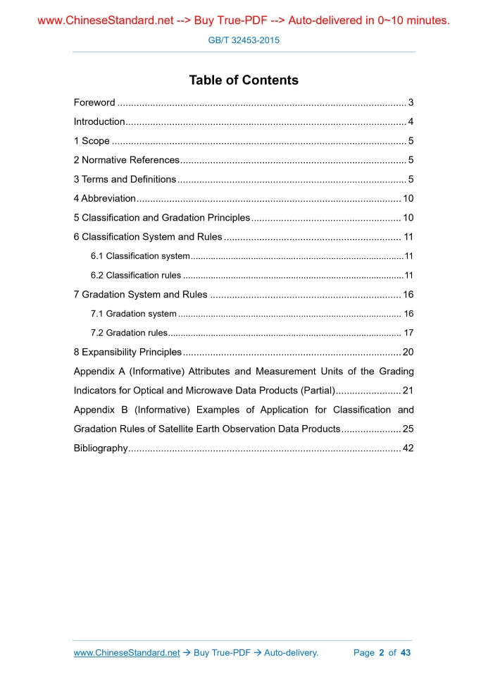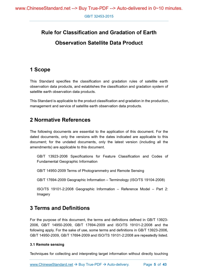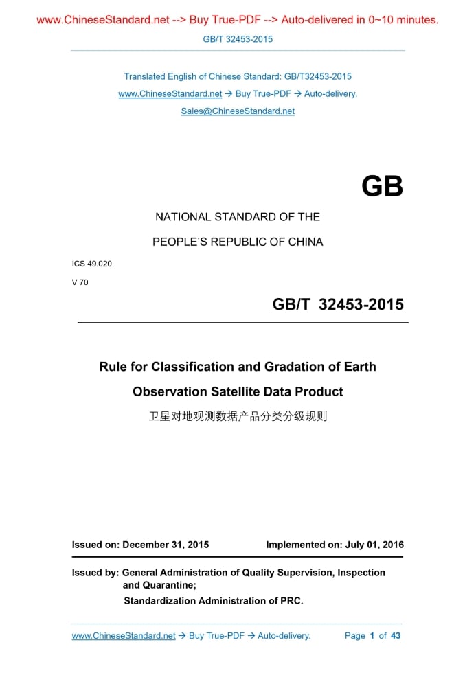 Similar standardsGB/T 32453-2015: Rule for Classification and Gradation of Earth Observation Satellite Data Product---This is an excerpt. Full copy of true-PDF in English version (including equations, symbols, images, flow-chart, tables, and figures etc.), auto-downloaded/delivered in 9 seconds, can be purchased online: https://www.ChineseStandard.net/PDF.aspx/GBT32453-2015 NATIONAL STANDARD OF THE PEOPLE’S REPUBLIC OF CHINA ICS 49.020 V 70 Rule for Classification and Gradation of Earth Observation Satellite Data Product ISSUED ON: DECEMBER 31, 2015 IMPLEMENTED ON: JULY 01, 2016 Issued by: General Administration of Quality Supervision, Inspection and Quarantine; Standardization Administration of PRC. Table of ContentsForeword ... 3 Introduction ... 4 1 Scope ... 5 2 Normative References ... 5 3 Terms and Definitions ... 5 4 Abbreviation ... 10 5 Classification and Gradation Principles ... 10 6 Classification System and Rules ... 11 6.1 Classification system ... 11 6.2 Classification rules ... 11 7 Gradation System and Rules ... 16 7.1 Gradation system ... 16 7.2 Gradation rules ... 17 8 Expansibility Principles ... 20 Appendix A (Informative) Attributes and Measurement Units of the Grading Indicators for Optical and Microwave Data Products (Partial) ... 21 Appendix B (Informative) Examples of Application for Classification and Gradation Rules of Satellite Earth Observation Data Products ... 25 Bibliography ... 42 Rule for Classification and Gradation of Earth Observation Satellite Data Product1 ScopeThis Standard specifies the classification and gradation rules of satellite earth observation data products, and establishes the classification and gradation system of satellite earth observation data products. This Standard is applicable to the product classification and gradation in the production, management and service of satellite earth observation data products.2 Normative ReferencesThe following documents are essential to the application of this document. For the dated documents, only the versions with the dates indicated are applicable to this document; for the undated documents, only the latest version (including all the amendments) are applicable to this document. GB/T 13923-2006 Specifications for Feature Classification and Codes of Fundamental Geographic Information GB/T 14950-2009 Terms of Photogrammetry and Remote Sensing GB/T 17694-2009 Geographic Information – Terminology (ISO/TS 19104-2008) ISO/TS 19101-2:2008 Geographic Information – Reference Model – Part 2: Imagery3 Terms and DefinitionsFor the purpose of this document, the terms and definitions defined in GB/T 13923- 2006, GB/T 14950-2009, GB/T 17694-2009 and ISO/TS 19101-2:2008 and the following apply. For the sake of use, some terms and definitions in GB/T 13923-2006, GB/T 14950-2009, GB/T 17694-2009 and ISO/TS 19101-2:2008 are repeatedly listed. 3.1 Remote sensing Techniques for collecting and interpreting target information without directly touching 3.9 Black body A hypothetical ideal radiator, it can absorb all the external electromagnetic radiation without any reflection and transmission. 3.10 Emissivity The ratio of the radiation emittance of an object at a certain temperature and a certain wavelength to the radiation emittance of a black body at the same temperature and the same wavelength, which is also called the specific emissivity. 3.11 Brightness temperature The temperature of the black body equal to the radiation emittance of the observed object, the value of which is equal to the radiation temperature. 3.12 Backscattering coefficient Radar reflectance per unit cross-sectional area of the target in the direction of incidence. 3.13 Digital elevation model A dataset that assigns two-dimensional coordinate elevation values through an algorithm. [GB/T 17694-2009, definition B.133] 3.14 Fundamental geographic information features Geographical elements described by basic geographic information include water systems, residential areas and facilities, transportation, pipelines, borders and political districts, landforms, vegetation and soil, place names, and the basis for spatial positioning, etc. [GB/T 13923-2006, definition 2.2] 3.15 Radiometric correction Correction of systematic and random radiation distortion or deformation caused by external factors, data acquisition and transmission systems. [GB/T 14950-2009, definition 5.195] 3.16 Relative radiometric correction Normalize the amount of radiation measured between image elements or between sensors, between spectral bands, or at different times. sources, such as edge extraction, classification, etc., and fuse at the feature layer. 3.25 Decision-level fusion Fusion based on image understanding and image recognition, that is, fusion after feature extraction and feature recognition process. 3.26 Parameter inversion Based on the model knowledge, the state parameters of the target are inferred based on the measurable parameter values, which is also known as parameter inversion. 3.27 Validation An independent method is used to evaluate the authenticity and accuracy of satellite earth observation data products. 3.28 Cross validation The use of verified satellite earth observation data products with known accuracy to evaluate the quality of satellite earth observation data products to be inspected is an indirect method of authenticity verification. 3.29 Geoelectric field The electric field that exists naturally on the earth's surface is divided into a geoelectric field and a natural electric field according to the field source. The geoelectric field refers to a geoelectric field that changes globally or regionally, and the natural electric field is a geoelectric field that changes relatively locally. 3.30 Geomagnetic field The Earth's magnetic field exists in a wide space from the Earth's core to hundreds or even thousands of Earth radius. It originates from magnetic rocks inside the Earth and current systems distributed inside and outside the Earth. It consist