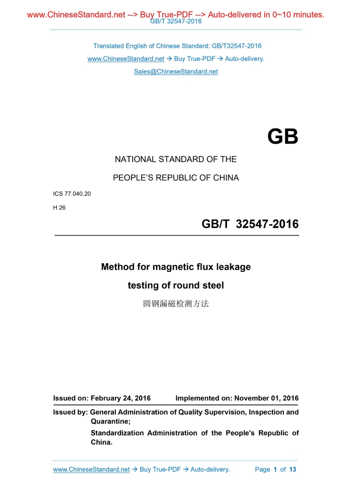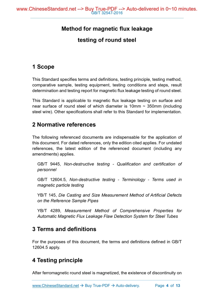 Similar standardsGB/T 32547-2016: Method for magnetic flux leakage testing of round steel---This is an excerpt. Full copy of true-PDF in English version (including equations, symbols, images, flow-chart, tables, and figures etc.), auto-downloaded/delivered in 9 seconds, can be purchased online: https://www.ChineseStandard.net/PDF.aspx/GBT32547-2016NATIONAL STANDARD OF THE PEOPLE’S REPUBLIC OF CHINA ICS 77.040.20 H 26 Method for magnetic flux leakage testing of round steel ISSUED ON: FEBRUARY 24, 2016 IMPLEMENTED ON: NOVEMBER 01, 2016 Issued by: General Administration of Quality Supervision, Inspection and Quarantine; Standardization Administration of the People's Republic of China. Table of ContentsForeword ... 3 1 Scope ... 4 2 Normative references ... 4 3 Terms and definitions ... 4 4 Testing principle ... 4 5 Testing method ... 5 6 Comparative sample ... 6 7 Testing equipment ... 8 8 Testing conditions and steps ... 10 9 Result determination ... 11 10 Testing report ... 12ForewordThis Standard was drafted in accordance with the rules given in GB/T 1.1-2009. This Standard was proposed by China Iron and Steel Association. This Standard shall be under the jurisdiction of National Technical Committee on Steels of Standardization Administration of China (SAC/TC 183). The drafting organizations of this Standard: Iron and Steel Research Institute, Metallurgical Industry Information Standards Institute, Steel Yannak Testing Technology Co., Ltd. Main drafters of this Standard: Fan Hong, Zhang Jianwei, Dong Li, Xu Lei, Zhang Ke, Shen Haihong, Jia Huiming. Method for magnetic flux leakage testing of round steel1 ScopeThis Standard specifies terms and definitions, testing principle, testing method, comparative sample, testing equipment, testing conditions and steps, result determination and testing report for magnetic flux leakage testing of round steel. This Standard is applicable to magnetic flux leakage testing on surface and near surface of round steel of which diameter is 10mm ~ 350mm (including steel wire). Other specifications shall refer to this Standard for implementation.2 Normative referencesThe following referenced documents are indispensable for the application of this document. For dated references, only the edition cited applies. For undated references, the latest edition of the referenced document (including any amendments) applies. GB/T 9445, Non-destructive testing - Qualification and certification of personnel GB/T 12604.5, Non-destructive testing - Terminology - Terms used in magnetic particle testing YB/T 145, Die Casting and Size Measurement Method of Artificial Defects on the Reference Sample Pipes YB/T 4289, Measurement Method of Comprehensive Properties for Automatic Magnetic Flux Leakage Flaw Detection System for Steel Tubes3 Terms and definitionsFor the purposes of this document, the terms and definitions defined in GB/T 12604.5 apply.4 Testing principleAfter ferromagnetic round steel is magnetized, the existence of discontinuity on surface or near surface of round steel makes magnetic line on surface or near surface of round steel distorted so as to generate a leakage magnetic field. Use a testing element (such as Hall element, magneto-sensitive diode or induction coil) that is sensitive to magnetic field to move on surface of magnetized round steel (or round steel is moving, testing element is fixed). When passing through defect, testing element interacts with leakage magnetic field to generate electrical signal, which shall be used to determine that defect exists. The deeper defect is buried below round steel surface, the lower sensitivity it shall be tested out. When defect orientation is perpendicular to direction of magnetic line, leakage magnetic field strength is the largest at the defect, and testing sensitivity is also the highest. As defect orientation is skewed, leakage magnetic field strength gradually decreases. When two orientations are consistent, leakage magnetic field strength is close to zero. Therefore, when longitudinal magnetization testing equipment is used, it is insensitive to oblique defect reaction, then it is easy to form a blind corner area.5 Testing method5.1 Testing mode In order to detect vertical defect on surface and near surface of round steel, it needs to use circumferential magnetization testing mode, as shown in Figure 1. According to difference between probe and movement mode of round steel, vertical testing is divided into two categories: rotating-probe type and fixed- probe type. Rotating-probe type refers to that probe rotates and tested round steel moves in straight line to complete scanning of entire surface, as shown in Figure 1a). Fixed-probe type refers to that probe is fixed and tested round steel moves forward spirally to complete scanning of entire surface, as shown in Figure 1b). Figure 1 -- Vertical testing schematic Magnetic yoke Rotating direction of probe Probe Round steel Round steel Magnetic pole Probe Rotating direction of probe a) Rotating-probe type b) Fixed-probe type 5.2 Magnetization mode According to magnetization mode of round steel, testing method is divided into DC magnetization and AC magnetization. a) DC magnetization DC current excites electromagnet to generate a magnetic field. Use this magnetic field to magnetize tested round steel. DC magnetization efficiency is low. Magnetization intensity can be adjusted by controlling current size. b) AC magnetization AC current excites electromagnet to generate a magnetic field. Use this magnetic field to magnetize tested round steel. It is easy for AC magnetic field to generate skin effect and eddy current in tested round steel; and as current frequency increases, depth of magnetization decreases. Therefore, only defect on surface or near surface of tested round steel can be tested. AC magnetization efficiency is high. Magnetization intensity can be adjusted by controlling current size.6 Comparative sample6.1 Use Comparative sample is used to test sensitivit