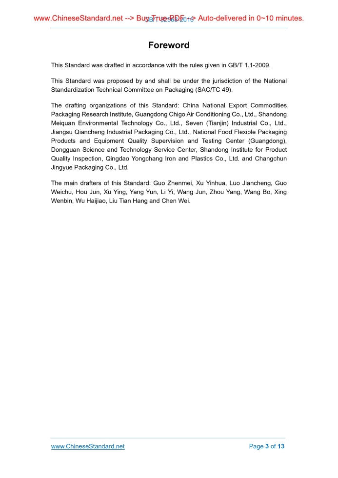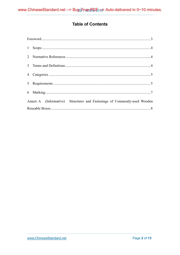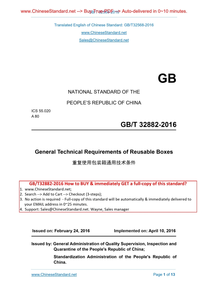 Similar standardsGB/T 32568-2016: General Technical Requirements of Reusable Boxes---This is an excerpt. Full copy of true-PDF in English version (including equations, symbols, images, flow-chart, tables, and figures etc.), auto-downloaded/delivered in 9 seconds, can be purchased online: https://www.ChineseStandard.net/PDF.aspx/GBT32568-2016GB NATIONAL STANDARD OF THE PEOPLE’S REPUBLIC OF CHINA ICS 55.020 A 80 GB/T 32882-2016 General Technical Requirements of Reusable Boxes Issued on: FEBRUARY 24, 2016 Implemented on: APRIL 10, 2016 Issued by. General Administration of Quality Supervision, Inspection and Quarantine of the People's Republic of China; Standardization Administration of the People's Republic of China. Table of ContentsForeword ... 3 1 Scope ... 4 2 Normative References ... 4 3 Terms and Definitions ... 4 4 Categories ... 5 5 Requirements ... 5 6 Marking ... 7 Annex A (Informative) Structures and Fastenings of Commonly-used Wooden Reusable Boxes ... 8ForewordThis Standard was drafted in accordance with the rules given in GB/T 1.1-2009. This Standard was proposed by and shall be under the jurisdiction of the National Standardization Technical Committee on Packaging (SAC/TC 49). The drafting organizations of this Standard. China National Export Commodities Packaging Research Institute, Guangdong Chigo Air Conditioning Co., Ltd., Shandong Meiquan Environmental Technology Co., Ltd., Seven (Tianjin) Industrial Co., Ltd., Jiangsu Qiancheng Industrial Packaging Co., Ltd., National Food Flexible Packaging Products and Equipment Quality Supervision and Testing Center (Guangdong), Dongguan Science and Technology Service Center, Shandong Institute for Product Quality Inspection, Qingdao Yongchang Iron and Plastics Co., Ltd. and Changchun Jingyue Packaging Co., Ltd. The main drafters of this Standard. Guo Zhenmei, Xu Yinhua, Luo Jiancheng, Guo Weichu, Hou Jun, Xu Ying, Yang Yun, Li Yi, Wang Jun, Zhou Yang, Wang Bo, Xing Wenbin, Wu Haijiao, Liu Tian Hang and Chen Wei. General Technical Requirements of Reusable Boxes1 ScopeThis Standard specifies the categories, requirements and marking of reusable boxes. This Standard applies to reusable boxes made of the main materials such as paper, plastics, wood, metal and biomaterials.2 Normative ReferencesThe following referenced documents are indispensable for the application of this document. For dated references, only the edition dated applies to this document. For undated references, the latest edition of the referenced document (including any amendments) applies to this Standard. GB/T 191 Packaging - Pictorial Marking for Handling of Goods GB/T 4892 Dimensions of Rigid Rectangular Packages – Transport Packages GB/T 16716.1 Packaging and Packaging Waste – Part 1. General Rules of Disposal and Utilization GB/T 16716.4 Packaging and Packaging Waste – Part 4. Reuse GB/T 16716.5 Packaging and Packaging Waste – Part 5. Recoverable by Material Recycling GB/T 16716.6 Packaging and Packaging Waste – Part 6. Recoverable by Energy Recovery GB/T 16716.7 Packaging and Packaging Waste – Part 7. Recoverable by Composting and Biodegradation GB/T 23156 Packaging – Packaging and the Environment – Terminology BB/T 0043 Plastic Logistics Containers3 Terms and DefinitionsFor the purpose of this document, the following terms and definitions and those defined in GB/T 16716.4 and GB/T 23156 apply. 5.2 Reuse 5.2.1 Reusable boxes can be used in reusable systems; reusable systems can be divided into closed-loop systems, open systems and mixed systems in accordance with the specifications of GB/T 16716.4. 5.2.2 Properties of reusable boxes newly adopted in reusable systems shall not be lower than the standard requirements of the category of products. For example, properties of plastic containers shall not be lower than the requirements of BB/T 0043. 5.2.3 Reusable boxes recycled shall be sorted, washed and maintained. 5.2.4 Reusable boxes re-enter into reusable systems shall be free from damages affecting their function and use; their properties shall not be lower than the standard requirements of the category of products. 5.3 Exit and disposal 5.3.1 In one of the following situations, reusable boxes exit from reusable systems. -- they have any damage that is beyond repair and affects function and use; -- their properties are lower than the standard requirements for the category of products; and -- systems are unable to identify them. 5.3.2 Boxes exiting from reusable systems shall be disposed as appropriate. Those suitable for material recycling shall be disposed in accordance with the specifications of GB/T 16716.5; those suitable for energy recycling shall be disposed in accordance with the specifications of GB/T 16716.6; and those suitable for composting and biodegradation shall be disposed in accordance with GB/T 16716.7. 5.4 Environmental protection 5.4.1 Materials selected for reusable boxes shall meet the national environmental protection policies and relevant regulations; no packaging materials shall be used that are hazardous to the environment and human body or that have been banned by the State. 5.4.2 Total content of heavy metals in reusable boxes shall meet the specifications of GB/T 16716.1. In the event of irreplaceable use, hazardous chemicals should be operated under foreseeable conditions at an appropriate level to reduce the environmental impact of recycling or eventual disposal of packaging wastes. ......Source: Above contents are excerpted from the full-copy PDF -- translated/reviewed by: www.ChineseStandard.net / Wayne Zheng et al. Tips & Frequently Asked Questions:Question 1: How long will the true-PDF of English version of GB/T 32568-2016 be delivered?Answer: The full copy PDF of English version of GB/T 32568-2016 can be downloaded in 9 seconds, and it will also be emailed to you in 9 seconds (double mechanisms to ensure the delivery reliably), with PDF-invoice.Question 2: Can I share the purchased PDF of GB/T 32568-2016_English 
