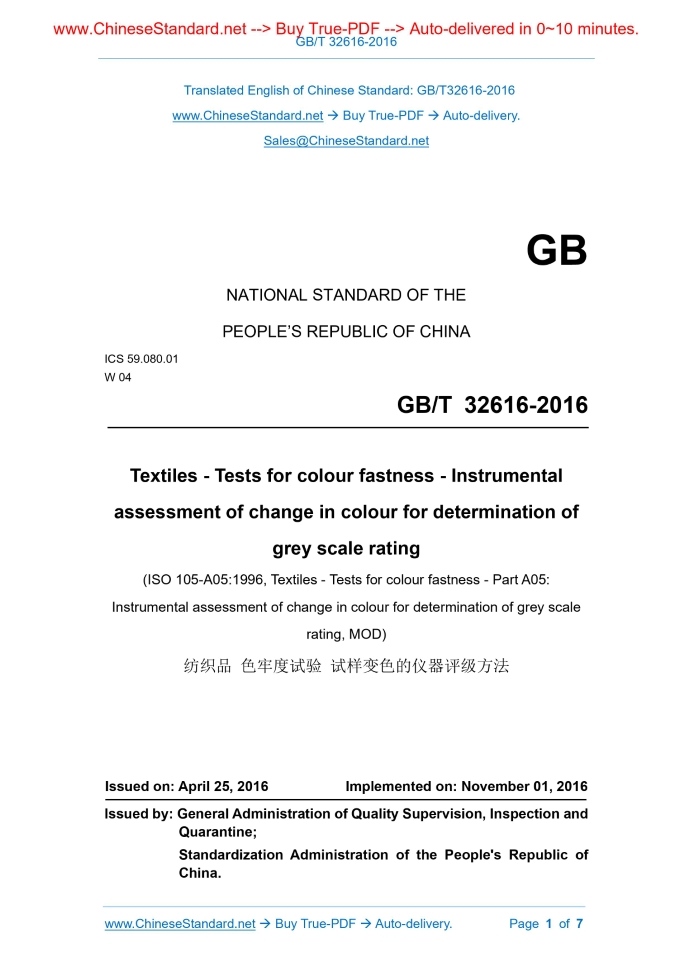 GB/T 32616-2016: Textiles -- Tests for colour fastness -- Instrumental assessment of change in colour for determination of grey scale rating Delivery: 9 seconds. True-PDF full-copy in English & invoice will be downloaded + auto-delivered via email. See step-by-step procedure Status: Valid
