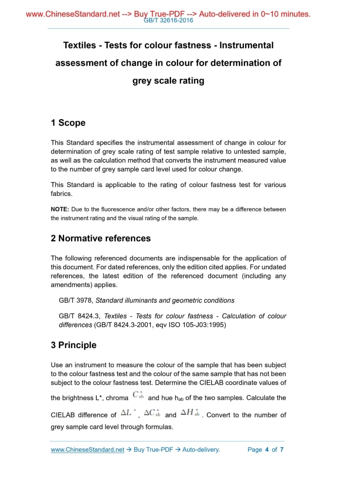 Similar standardsGB/T 32616-2016: Textiles -- Tests for colour fastness -- Instrumental assessment of change in colour for determination of grey scale rating---This is an excerpt. Full copy of true-PDF in English version (including equations, symbols, images, flow-chart, tables, and figures etc.), auto-downloaded/delivered in 9 seconds, can be purchased online: https://www.ChineseStandard.net/PDF.aspx/GBT32616-2016 NATIONAL STANDARD OF THE PEOPLE’S REPUBLIC OF CHINA ICS 59.080.01 W 04 Textiles - Tests for colour fastness - Instrumental assessment of change in colour for determination of grey scale rating (ISO 105-A05:1996, Textiles - Tests for colour fastness - Part A05: Instrumental assessment of change in colour for determination of grey scale rating, MOD) ISSUED ON: APRIL 25, 2016 IMPLEMENTED ON: NOVEMBER 01, 2016 Issued by: General Administration of Quality Supervision, Inspection and Quarantine; Standardization Administration of the People's Republic of China. Table of ContentsForeword ... 3 1 Scope ... 4 2 Normative references ... 4 3 Principle ... 4 4 Instruments ... 5 5 Sample ... 5 6 Operating procedures ... 5 7 Calculation of colour change ... 5 8 Determination of number of colour change level ... 6 9 Test report ... 7 Textiles - Tests for colour fastness - Instrumental assessment of change in colour for determination of grey scale rating1 ScopeThis Standard specifies the instrumental assessment of change in colour for determination of grey scale rating of test sample relative to untested sample, as well as the calculation method that converts the instrument measured value to the number of grey sample card level used for colour change. This Standard is applicable to the rating of colour fastness test for various fabrics. NOTE: Due to the fluorescence and/or other factors, there may be a difference between the instrument rating and the visual rating of the sample.2 Normative referencesThe following referenced documents are indispensable for the application of this document. For dated references, only the edition cited applies. For undated references, the latest edition of the referenced document (including any amendments) applies. GB/T 3978, Standard illuminants and geometric conditions GB/T 8424.3, Textiles - Tests for colour fastness - Calculation of colour differences (GB/T 8424.3-2001, eqv ISO 105-J03:1995)3 PrincipleUse an instrument to measure the colour of the sample that has been subject to the colour fastness test and the colour of the same sample that has not been subject to the colour fastness test. Determine the CIELAB coordinate values of the brightness L*, chroma and hue hab of the two samples. Calculate the CIELAB difference of , and . Convert to the number of grey sample card level through formulas.4 Instruments4.1 Spectrophotometer or colorimeter: at least meet any measurement geometry specified in 6.1 of GB/T 3978-2008.5 SampleSelect a sample that has been subject to the colour fastness test and is representative. Its size can meet the clamping requirements of the instrument, without obvious flaws. On the back of the single layer sample, pad a white material that does not contain fluorescent whitening agents and is opaque. On the backs of the sample and the reference sample, same materials shall be padded. NOTE: It may also pad several layers of the same untreated sample on the back of the sample, so as to make the sample opaque.6 Operating procedures6.1 Cut a reference sample from the sample that has not been subject to the colour fastness test. The thickness and number of layers shall be the same as the sample (Clause 5). Mount the reference sample on the sample holder. And use the instrument (4.1) to measure its colour value. Through the measuring system, use CIE illuminator D65 and 10° observer to obtain CIE tristimulus value. Then according to the provisions of GB/T 8424.3, use the obtained data to calculate CIELABL*, and hab values. NOTE: Other illuminant and observer conditions that can be used for measurements are: D65/2°, A/2°, A/10°. 6.2 Use the same method to measure the colour of the sample (Clause 5). Calculate CIELABL*, and hab values.7 Calculation of colour change7.1 Based on the measured data (6.1, 6.2), calculate the brightness difference ΔL*, chroma difference and hue difference between the reference sample and the sample. 7.2 Use the following formulas to calculate the change of the colour : ......Source: Above contents are excerpted from the full-copy PDF -- translated/reviewed by: www.ChineseStandard.net / Wayne Zheng et al. Tips & Frequently Asked Questions:Question 1: How long will the true-PDF of English version of GB/T 32616-2016 be delivered?Answer: The full copy PDF of English version of GB/T 32616-2016 can be downloaded in 9 seconds, and it will also be emailed to you in 9 seconds (double mechanisms to ensure the delivery reliably), with PDF-invoice.Question 2: Can I share the purchased PDF of GB/T 32616-2016_English with my colleagues?Answer: Yes. The purchased PDF of GB/T 32616-2016_English will be deemed to be sold to your employer/organization who actually paid for it, including your colleagues and your employer's intranet.Question 3: Does the price include tax/VAT?Answer: Yes. Our tax invoice, downloaded/delivered in 9 seconds, includes all tax/VAT and complies with 100+ countries' tax regulations (tax exempted in 100+ countries) -- See Avoidance of Double Taxation Agreements (DTAs): List of DTAs signed between Singapore and 100+ countriesQuestion 4: Do you accept my currency other than USD?Answer: Yes. www.ChineseStandard.us -- GB/T 32616-2016 -- Click this link and select your country/currency to pay, the exact amount in your currency will be printed on the invoice. Full PDF will also be downloaded/emailed in 9 seconds.How to buy and download a true PDF of English version of GB/T 32616-2016?A step-by-step guide to download PDF of GB/T 32616-2016_EnglishStep 1: Visit website https://www.ChineseStandard.net (Pay in USD), 
