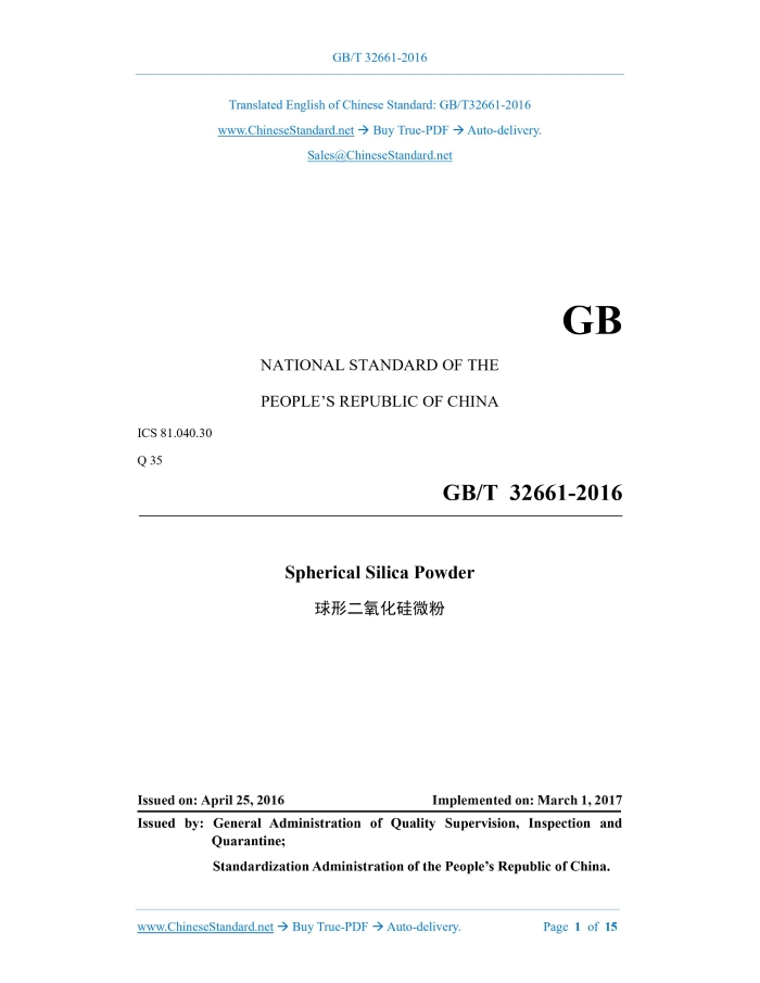 GB/T 32661-2016: Spherical silica powder Delivery: 9 seconds. True-PDF full-copy in English & invoice will be downloaded + auto-delivered via email. See step-by-step procedure Status: Valid