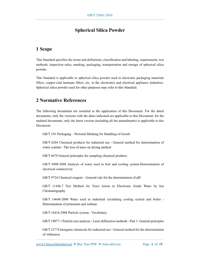 Similar standardsGB/T 32661-2016: Spherical silica powder---This is an excerpt. Full copy of true-PDF in English version (including equations, symbols, images, flow-chart, tables, and figures etc.), auto-downloaded/delivered in 9 seconds, can be purchased online: https://www.ChineseStandard.net/PDF.aspx/GBT32661-2016GB NATIONAL STANDARD OF THE PEOPLE’S REPUBLIC OF CHINA ICS 81.040.30 Q 35 Spherical Silica Powder 球形二氧化硅微粉 ISSUED ON: APRIL 25, 2016 IMPLEMENTED ON: MARCH 1, 2017 Issued by: General Administration of Quality Supervision, Inspection and Quarantine; Standardization Administration of the People’s Republic of China. Table of ContentsForeword ... 3 1 Scope ... 4 2 Normative References ... 4 3 Terms and Definitions ... 5 4 Classification and Labeling ... 5 5 Requirements ... 6 6 Test Methods ... 7 7 Inspection Rules ... 13 8 Marking, Packaging, Transportation and Storage ... 14 Spherical Silica Powder1 ScopeThis Standard specifies the terms and definitions, classification and labeling, requirements, test methods, inspection rules, marking, packaging, transportation and storage of spherical silica powder. This Standard is applicable to spherical silica powder used in electronic packaging materials fillers, copper-clad laminate fillers, etc. in the electronics and electrical appliance industries. Spherical silica powder used for other purposes may refer to this Standard.2 Normative ReferencesThe following documents are essential to the application of this Document. For the dated documents, only the versions with the dates indicated are applicable to this Document; for the undated documents, only the latest version (including all the amendments) is applicable to this Document. GB/T 191 Packaging – Pictorial Marking for Handling of Goods GB/T 6284 Chemical products for industrial use - General method for determination of water content - The loss of mass on drying method GB/T 6678 General principles for sampling chemical products GB/T 6908-2008 Analysis of water used in boil and cooling system-Determination of electrical conductivity GB/T 9724 Chemical reagent—General rule for the determination of pH GB/T 11446.7 Test Method for Trace Anion in Electronic Grade Water by Ion Chromatography GB/T 14640-2008 Water used in industrial circulating cooling system and boiler - Determination of potassium and sodium GB/T 16418-2008 Particle system - Vocabulary GB/T 19077.1 Particle size analysis - Laser diffraction methods - Part 1: General principles GB/T 23774 Inorganic chemicals for industrial use - General method for the determination of whiteness JC/T 753-2001 Methods for chemical analysis of class making sands SJ 3228.2 General rules for methods of analysis for high purity arenaceous quartz SJ 3228.3 Determination of loss on ignition in high purity arenaceous quartz SJ/T 10675-2002 Silicon dioxide micro-powder for electronic and electrical equipment industry3 Terms and DefinitionsFor the purposes of this Document, the following terms and definitions apply. 3.1 Median diameter The particle size corresponding to when the cumulative particle size distribution percentage reaches 50%. Written as D50, in μm. NOTE: Adapted from GB/T 16418-2008, definition 2.2.1.9. 3.2 Degree of sphericity The degree of particles close to a sphere. NOTE 1: The sphericity of the sphere is 1. NOTE 2: Adapted from GB/T 16418-2008, definition 2.2.2.16. 3.3 Rate of spheroidization The ratio of the number of spherical particles to the total number of counted particles.4 Classification and Labeling4.1 Classification 4.1.1 According to use, it is divided into: electronic grade spherical silica powder (QYG-H), ordinary spherical silica powder (QYG-R). 4.1.2 According to the median particle diameter D50 range, it is divided into five specifications: 030, 020, 010, 005 and 002. 4.2 Labeling Labeled by application and median particle size specifications. Sodium hexametaphosphate, analytically pure, mass fraction 0.5%. 6.5.3 Device 6.5.3.1 Microscope: with CCD module, pixels no less than 1 million, magnification no less than 100 times. 6.5.3.2 Computer: equipped with image processing software. 6.5.4 Determination 6.5.4.1 Using sodium hexametaphosphate with a mass fraction of 0.5% as the dispersion medium, take an appropriate amount of sample and disperse it evenly on the glass slide. 6.5.4.2 Use a microscope to observe the sample and adjust the focus to the clearest field of view. 6.5.4.3 Select an area with well-dispersed particles in the field of view and record the image of this area on the computer. 6.5.4.4 Use image processing software to analyze the recorded images and determine the projected area and peripheral length of each particle. 6.5.5 Calculation The degree of sphericity of a single particle is calculated according to Formula (1): Where: Φa - The measured degree of sphericity of a single particle; A - The area of particle projection, in μm2; B - Peripheral length of particle projection, in μm. The measurement result of degree of sphericity is the arithmetic mean of the degree of sphericity of 50 randomly selected complete particles in the image. Incomplete particles at the edge of the image shall not be measured. 6.6 Rate of spheroidization 6.6.1 Principle The ratio of the number of non-spherical particles to the total number of particles in the statistical field of view is calculated. The basis for determining non-spherical particles is particles with a degree of sphericity less than 0.85 or particles with acute-angled surfaces on It shall be carried out according to the provisions of SJ 3228.3. 6.10 Extraction liquid 6.10.1 Preparation of extraction liquid It shall be carried out according to the provisions of 6.11 in SJ/T 10675-2002. 6.10.2 Conductivity of extraction liquid It shall be carried out according to the provisions of GB 6908. 6.10.3 pH value of extraction liquid It shall be carried out according to the provisions of GB 9724. 6.10.4 Na+ content in the extraction liquid It sha
