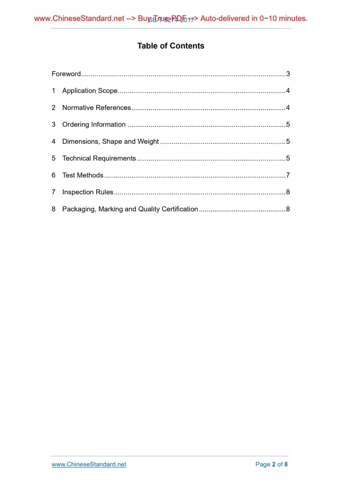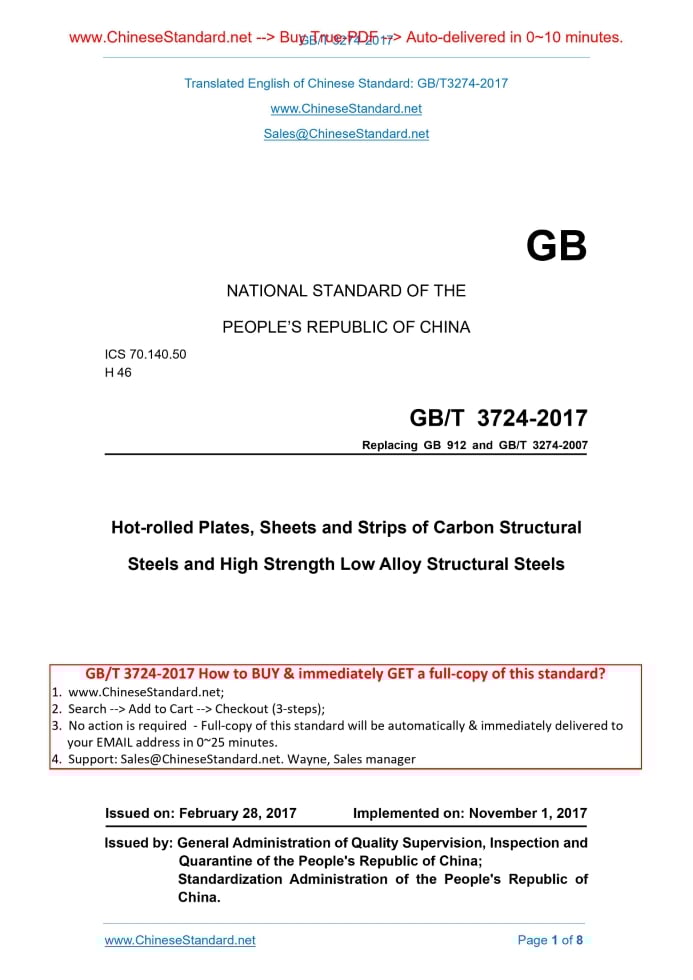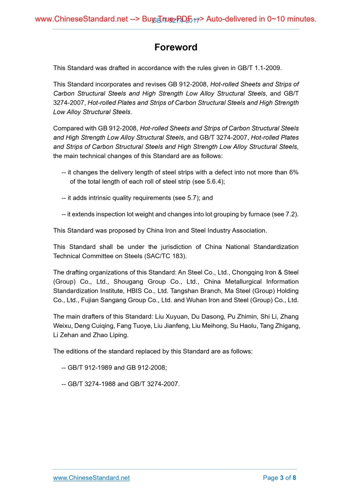 GB/T 3274-2017: Hot-rolled plates, sheets and strips of carbon structural steels and high strength low alloy structural steels---This is an excerpt. Full copy of true-PDF in English version (including equations, symbols, images, flow-chart, tables, and figures etc.), auto-downloaded/delivered in 9 seconds, can be purchased online: https://www.ChineseStandard.net/PDF.aspx/GBT3274-2017 GB NATIONAL STANDARD OF THE PEOPLE’S REPUBLIC OF CHINA ICS 70.140.50 H 46 GB/T 3724-2017 Replacing GB 912 and GB/T 3274-2007 Hot-rolled Plates, Sheets and Strips of Carbon Structural Steels and High Strength Low Alloy Structural Steels Issued on. FEBRUARY 28, 2017 Implemented on. NOVEMBER 1, 2017 Issued by. General Administration of Quality Supervision, Inspection and Quarantine of the People's Republic of China; Standardization Administration of the People's Republic of China. Table of ContentsForeword... 3 1 Application Scope... 4 2 Normative References... 4 3 Ordering Information... 5 4 Dimensions, Shape and Weight... 5 5 Technical Requirements... 5 6 Test Methods... 7 7 Inspection Rules... 8 8 Packaging, Marking and Quality Certification... 8ForewordThis Standard was drafted in accordance with the rules given in GB/T 1.1-2009. This Standard incorporates and revises GB 912-2008, Hot-rolled Sheets and Strips of Carbon Structural Steels and High Strength Low Alloy Structural Steels, and GB/T 3274-2007, Hot-rolled Plates and Strips of Carbon Structural Steels and High Strength Low Alloy Structural Steels. Compared with GB 912-2008, Hot-rolled Sheets and Strips of Carbon Structural Steels and High Strength Low Alloy Structural Steels, and GB/T 3274-2007, Hot-rolled Plates and Strips of Carbon Structural Steels and High Strength Low Alloy Structural Steels, the main technical changes of this Standard are as follows. -- it changes the delivery length of steel strips with a defect into not more than 6% of the total length of each roll of steel strip (see 5.6.4); -- it adds intrinsic quality requirements (see 5.7); and -- it extends inspection lot weight and changes into lot grouping by furnace (see 7.2). This Standard was proposed by China Iron and Steel Industry Association. This Standard shall be under the jurisdiction of China National Standardization Technical Committee on Steels (SAC/TC 183). The drafting organizations of this Standard. An Steel Co., Ltd., Chongqing Iron & Steel (Group) Co., Ltd., Shougang Group Co., Ltd., China Metallurgical Information Standardization Institute, HBIS Co., Ltd. Tangshan Branch, Ma Steel (Group) Holding Co., Ltd., Fujian Sangang Group Co., Ltd. and Wuhan Iron and Steel (Group) Co., Ltd. The main drafters of this Standard. Liu Xuyuan, Du Dasong, Pu Zhimin, Shi Li, Zhang Weixu, Deng Cuiqing, Fang Tuoye, Liu Jianfeng, Liu Meihong, Su Haolu, Tang Zhigang, Li Zehan and Zhao Liping. The editions of the standard replaced by this Standard are as follows. -- GB/T 912-1989 and GB 912-2008; -- GB/T 3274-1988 and GB/T 3274-2007. Hot-rolled Plates, Sheets and Strips of Carbon Structural Steels and High Strength Low Alloy Structural Steels1 Application ScopeThis Standard specifies the order content, dimensions, shape, weight, technical requirements, test methods, inspection rules, packaging, marking and quality certification for hot-rolled plates, sheets and strips of carbon structural steels and high strength low alloy structural steels. This Standard applies to hot-rolled plates, sheets and strips of carbon structural steels and high strength low alloy structural steels with a thickness not greater than 400 mm (hereinafter referred to as steel plates (sheets) and strips).2 Normative ReferencesThe following referenced documents are indispensable for the application of this document. For dated references, only the edition cited applies. For undated references, the latest edition of the referenced document (including any amendments) applies. GB/T 222, Permissible Tolerances for Chemical Composition of Steel Products GB/T 228.1, Metallic Materials – Tensile Testing – Part 1.Method of Test at Room Temperature GB/T 229, Metallic Materials – Charpy Pendulum Impact Test Method GB/T 232, Metallic Materials – Bend test GB/T 247, General Rules of Packaging, Marking and Certification for Steel Plates (Sheets) and Strips GB/T 700, Carbon Structural Steels GB/T 709, Dimensions, Shape, Weight and Tolerances for Hot Rolled Plates, Sheets and Strips GB/T 1591, High Strength Low Alloy Structural Steels GB/T 2975, Steel and Steel Products - Location and Preparation of Test Pieces for Mechanical Testing GB/T 8170, Rules of Rounding off for Numerical Values and Expression and Judgement of Limiting Values GB/T 14977, General Requirements for Surface Condition of Hot-Rolled Steel Plates GB/T 17505, Steel and Steel Products – General Technical Delivery Requirements GB/T 20066, Steel and Iron – Sampling and Preparation of Samples for the Determination of Chemical Composition3 Ordering Information3.1 The contracts or orders based on this Standard shall include the following content. 3.2 Steel plates (sheets) sheared from steel strips are normally delivered in cut edge; if a purchase contract does not specify the edge condition, steel strips are normally delivered in mill edge.4 Dimensions, Shape and WeightThe dimensions, shape, weight and permissible tolerances of steel plates (sheets) and strips shall be as specified in GB/T 709.5 Technical Requirements5.1 Designation and chemical composition The designation and chemical composition of steels shall be as specified in GB/T 700 and GB/T 1591.The permissible tolerances for the chemical composition of finished steel plates (sheets) and strips shall be as specified in GB/T 222. 5.2 Smelting method Steels shall be smelted by oxygen converter or electric furnace. 5.3 Delivery condition Steel plates (sheets) and strips shall be delivered in hot rolling, controlled rolling or heat treatment. 5.4 Mechanical properties 5.4.1 The tensile strength and elongat