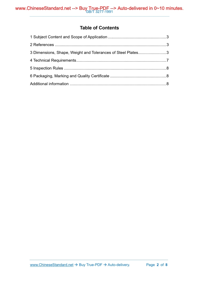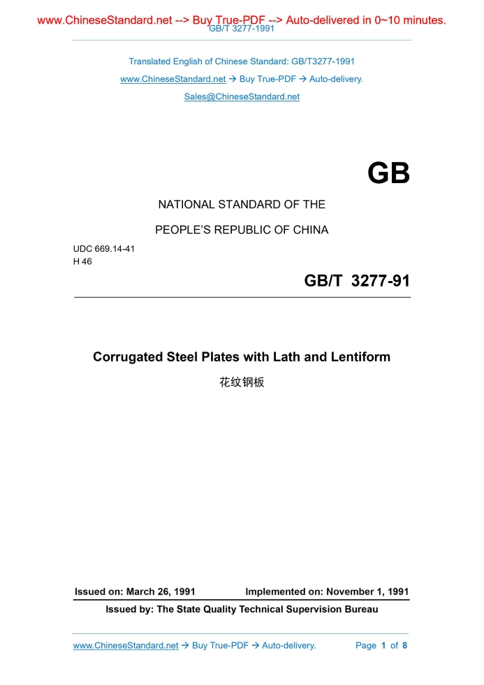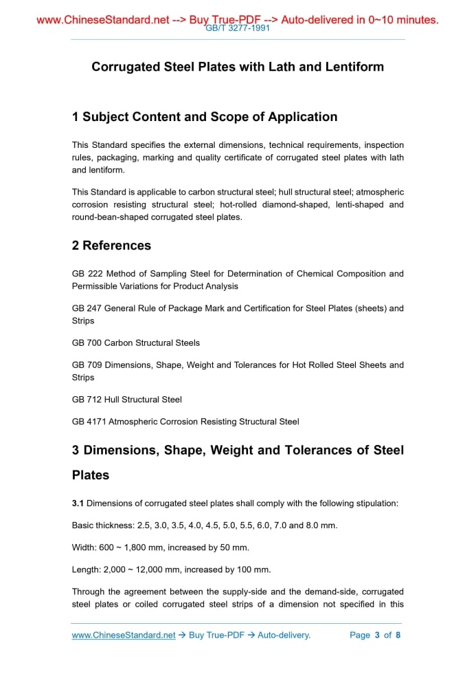 GB/T 3277-1991: Corrugated steel plates with lath and lentilform---This is an excerpt. Full copy of true-PDF in English version (including equations, symbols, images, flow-chart, tables, and figures etc.), auto-downloaded/delivered in 9 seconds, can be purchased online: https://www.ChineseStandard.net/PDF.aspx/GBT3277-1991GB NATIONAL STANDARD OF THE PEOPLE’S REPUBLIC OF CHINA UDC 669.14-41 H 46 GB/T 3277-91 Corrugated Steel Plates with Lath and Lentiform Issued on: MARCH 26, 1991 Implemented on: NOVEMBER 1, 1991 Issued by. The State Quality Technical Supervision Bureau Table of Contents1 Subject Content and Scope of Application... 3 2 References... 3 3 Dimensions, Shape, Weight and Tolerances of Steel Plates... 3 4 Technical Requirements... 7 5 Inspection Rules... 8 6 Packaging, Marking and Quality Certificate... 8 Additional information... 8 Corrugated Steel Plates with Lath and Lentiform1 Subject Content and Scope of ApplicationThis Standard specifies the external dimensions, technical requirements, inspection rules, packaging, marking and quality certificate of corrugated steel plates with lath and lentiform. This Standard is applicable to carbon structural steel; hull structural steel; atmospheric corrosion resisting structural steel; hot-rolled diamond-shaped, lenti-shaped and round-bean-shaped corrugated steel plates.2 ReferencesGB 222 Method of Sampling Steel for Determination of Chemical Composition and Permissible Variations for Product Analysis GB 247 General Rule of Package Mark and Certification for Steel Plates (sheets) and Strips GB 700 Carbon Structural Steels GB 709 Dimensions, Shape, Weight and Tolerances for Hot Rolled Steel Sheets and Strips GB 712 Hull Structural Steel GB 4171 Atmospheric Corrosion Resisting Structural Steel3 Dimensions, Shape, Weight and Tolerances of SteelPlates 3.1 Dimensions of corrugated steel plates shall comply with the following stipulation. Basic thickness. 2.5, 3.0, 3.5, 4.0, 4.5, 5.0, 5.5, 6.0, 7.0 and 8.0 mm. Width. 600 ~ 1,800 mm, increased by 50 mm. Length. 2,000 ~ 12,000 mm, increased by 100 mm. Through the agreement between the supply-side and the demand-side, corrugated steel plates or coiled corrugated steel strips of a dimension not specified in this theoretical weight. 3.8 Example of marking. round-bean-shaped corrugated steel plate, which is made from Q 235-A steel with the dimension. 4 x 1,000 x 4,000 mm, shall have the following marking. round-bean-shaped corrugated steel plate Q235 - A - 4 x 1,000 x 4,000 - GB/T 3277-91.4 Technical Requirements4.1 Nameplate and Chemical Composition 4.1.1 Steel used for corrugated steel plates shall be provided in accordance with the stipulation of steel nameplate in GB 700, GB 712 and GB 4171. Through the agreement between the supply-side and the demand side, other nameplates may be used to manufacture corrugated steel plates. 4.1.2 The allowable deviation of chemical composition of finished steel plates shall comply with the stipulation in GB 222. 4.2 Mechanical Property Mechanical property is not guaranteed here. When the demand side requests, the mechanical property indexes and test methods shall comply with the stipulation in relevant standards, or, be stipulated through the negotiation between both parties. 4.3 Delivery Status Steel plates shall be delivered under hot-rolled status. 4.4 Surface Quality 4.4.1 The surface of corrugated steel plates shall not manifest any bubbles, scars, cracks, wrinkles or inclusions. The steel plates shall not be layered. 4.4.2 Surface quality may be divided into two grades. General precision. the surface of steel plates is allowed to manifest thin oxidized iron scales, rust, rough surface caused by exfoliation of the iron scales, and other partial defects whose height or depth does not exceed the allowable deviation. The corrugation is allowed to manifest indistinct burrs and individual traces whose height does not exceed the height of the corrugation. The maximum area of individual defect shall not exceed the square of the corrugation height. Higher precision. the surface of steel plates is allowed to manifest thin oxidized iron scales, rust, and other partial defects whose height or depth does not exceed half of the thickness deviation. The corrugation shall be intact. On the corrugation, there may be slight partial burrs whose height does not exceed half of the thickness deviation.5 Inspection Rules5.1 The appearance and dimensions of corrugated steel plates shall be inspected one by one. Corrugated steel plates which are rolled by tandem mills may be sampled in accordance with coil. 5.2 The basic thickness and corrugation height of the steel plates shall be measured at a distance of not less than 40 mm from the edges along the width direction. Coiled corrugated steel stripes shall comply with the stipulation in GB 709.6 Packaging, Marking and Quality CertificatePackaging, marking and quality certificate shall comply with the stipulation in GB 247. Additional information This Standard was proposed by the Ministry of Metallurgical Industry of the People’s Republic of China. The responsible drafting organizations of this Standard. Ben Xi Iron Steel Company, Anshan Iron and Steel Company. The main drafters of this Standard. Kongwei, Yue Wenguang, Dong Wenying. Since the date of its implementation, the Standard GB/T 3277-91 shall serve as a replacement of GB 3277-82. The level marking of this Standard. GB/T 3277-91 I. ......Source: Above contents are excerpted from the full-copy PDF -- translated/reviewed by: www.ChineseStandard.net / Wayne Zheng et al. Tips & Frequently Asked Questions:Question 1: How long will the true-PDF of English version of GB/T 3277-1991 be delivered?Answer: The full copy PDF of English version of GB/T 3277-1991 can be downloaded in 9 seconds, and it will also be emailed to you in 9 seconds (double mechanisms to ensure the delivery reliably), with PDF-invoice.Question 2: Can I share the purchased PDF of GB/T 3277-1991_English wit