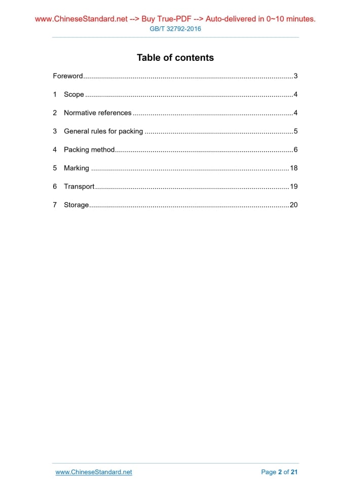Similar standardsGB/T 32792-2016: Packing, marking, transporting and storing of magnesium alloy wrought products---This is an excerpt. Full copy of true-PDF in English version (including equations, symbols, images, flow-chart, tables, and figures etc.), auto-downloaded/delivered in 9 seconds, can be purchased online: https://www.ChineseStandard.net/PDF.aspx/GBT32792-2016GB NATIONAL STANDARD OF THE PEOPLE’S REPUBLIC OF CHINA ICS 77.120.10 H 60 Packing, marking, transporting and storing of magnesium alloy wrought products Issued on: AUGUST 29, 2016 Implemented on: JULY 01, 2017 Issued by. General Administration of Quality Supervision, Inspection and Quarantine of the People's Republic of China; Standardization Administration of the PRC. Table of ContentsForeword ... 3 1 Scope ... 4 2 Normative references ... 4 3 General rules for packing ... 5 4 Packing method ... 6 5 Marking ... 18 6 Transport ... 19 7 Storage ... 20ForewordThis standard was drafted in accordance with the rules given in GB/T 1.1-2009. This standard was proposed by China Nonferrous Metals Industry Association. This standard shall be under the jurisdiction of the National Nonferrous Metal Standardization Technical Committee (SAC/TC 243). The responsible drafting organizations of this standard. Chongqing University, Chongqing Magnesium Technology Co., Ltd., Shanghai Fangle Auto Parts Co., Ltd. The participating drafting organizations of this standard. Jiaxing Zhongcheng Magnesium Technology Co., Ltd., National Magnesium and Magnesium Alloy Product Quality Supervision and Inspection Center, Shandong Yinguang Yuyuan Light Metal Precision Forming Co., Ltd., Northeast Light Alloy Co., Ltd., Shanghai Jiaotong University, Chongqing Boao Magnesium Aluminum Metal Manufacturing Co., Ltd., Shanxi Yinguang Huasheng Magnesium Industry Co., Ltd. The main drafters of this standard. Zhang Jing, Pan Fusheng, Xiang Dongxia, Qian Yafeng, Guo Jin, Wang Jinjin, Wu Jingmin, Pang Junmin, Li Ping, Chen Huiming, Wen Yu, Chen Jian, Tan Shudong, Wang Yingxin, Peng Liming, Zeng Xiaoqin, Li Weijie, Peng Junhua, Meng Fanping, Huang Lu, Gao Baoting. Packing, marking, transporting and storing of magnesium alloy wrought products1 ScopeThis standard specifies the packing, marking, transportation and storage of magnesium alloy wrought products. This standard applies to the magnesium alloy wrought products. castings, forgings, plates, strips, tubes, bars, profiles, wire and powder (hereinafter referred to as products).2 Normative referencesThe following documents are essential to the application of this document. For the dated documents, only the versions with the dates indicated are applicable to this document; for the undated documents, only the latest version (including all the amendments) are applicable to this Standard. GB190 Labels for packages of dangerous goods GB/T 191 Packing - Pictorial marking for handling of goods GB/T 2934 General-purpose flat pallets for through transit of goods - Principal dimensions and tolerances GB/T 3199 Wrought aluminum and aluminum alloy products - Packing, marking, transporting and storing GB/T 4456 Polyethylene blown film for packing applications GB/T 4857.4 Packing - Basic tests for transport packages - Part 4. Compression and stacking tests using a compression tester GB/T 4857.5 Packing - Transport packages - Vertical impact test method by dropping GB/T 4892 Dimensions of rigid rectangular packages - Transport packages GB/T 6544 Corrugated fiberboard 3.2.3 A single package can only be used to contain a single type of products, which shall be arranged orderly in accordance with the shape of the product, AND it is prohibited to mix different types of product together. 3.2.4 The distance of the reinforcing band for the packing box, rack, and pallet shall not only comply with the solidity requirements of the packing boxes, racks, and pallets, BUT also comply with cranes and forklift operation requirements; all packing units shall be suitable for mechanical handling (except for small packages for manual handling); as for the purchaser which is not far away, it shall use the recyclable devices; as the purchase which is far away, it may use the disposable package OR otherwise the recyclable packages to supply cargo. 3.2.5 When making wooden crates, racks and pallets, the nails shall be in the form of a step-like arrangement, AND the nail cap shall be knocked in and the nail tip bent. It is not allowed for nail projection or omit; AND the lifting position shall be installed with lifting protection iron corner. 3.2.6 When making metal crates, racks and pallets, they shall be welded (riveted) firmly; it is not allowed for holiday (riveting omission); the welding scar (rivets) shall be ground; AND it shall not damage the product. 3.2.7 All kinds of packing boxes, racks and pallets shall be standardized, clean, and dry. 3.3 Other requirements 3.3.1 Packing shall use steel band or plastic packing strip. When using steel band, it shall place the protective materials at the edge, corner or steel buckle of the steel band and which directly contact with the products. 3.3.2 The specific packing methods and handling methods of products shall comply with the corresponding product standards or user requirements.4 Packing method4.1 Packing method of castings 4.1.1 Recyclable package 4.1.1.1 The structure diagram of the recyclable package is shown in Figure 1. 4.3.1 The packing structure diagram of ordinary box-type or carton package is respectively shown in Figure 2 and Figure 4. Figure 4 Structure diagram of the ordinary box-type packing 4.3.2 When using the ordinary box-type and carton packing, PAVE a layer of plastic film at the bottom; PAVE one layer of hemp paper between magnesium boards; PLACE the magnesium board neatly in the box; if the box is not full, it is required to use filling materials around, and up and down to avoid loosening or friction; PLACE the quality certificate and desiccant; then USE plastic film to tie it upwar