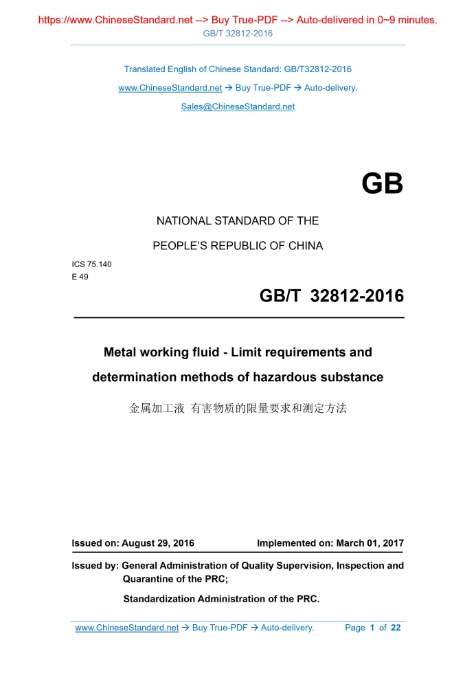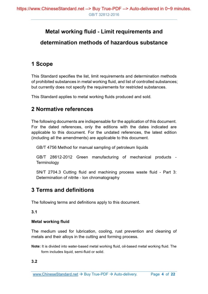 GB/T 32812-2016: Metal working fluid - Limit requirements and determination methods of hazardous substance Delivery: 9 seconds. True-PDF full-copy in English & invoice will be downloaded + auto-delivered via email. See step-by-step procedure Status: Valid