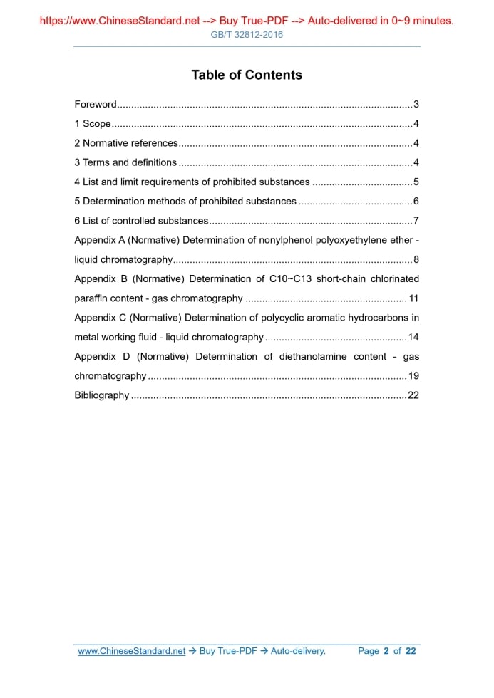 Similar standardsGB/T 32812-2016: Metal working fluid - Limit requirements and determination methods of hazardous substance---This is an excerpt. Full copy of true-PDF in English version (including equations, symbols, images, flow-chart, tables, and figures etc.), auto-downloaded/delivered in 9 seconds, can be purchased online: https://www.ChineseStandard.net/PDF.aspx/GBT32812-2016 GB NATIONAL STANDARD OF THE PEOPLE’S REPUBLIC OF CHINA ICS 75.140 E 49 Metal working fluid - Limit requirements and determination methods of hazardous substance ISSUED ON: AUGUST 29, 2016 IMPLEMENTED ON: MARCH 01, 2017 Issued by: General Administration of Quality Supervision, Inspection and Quarantine of the PRC; Standardization Administration of the PRC. Table of ContentsForeword ... 3 1 Scope ... 4 2 Normative references ... 4 3 Terms and definitions ... 4 4 List and limit requirements of prohibited substances ... 5 5 Determination methods of prohibited substances ... 6 6 List of controlled substances ... 7 Appendix A (Normative) Determination of nonylphenol polyoxyethylene ether - liquid chromatography ... 8 Appendix B (Normative) Determination of C10~C13 short-chain chlorinated paraffin content - gas chromatography ... 11 Appendix C (Normative) Determination of polycyclic aromatic hydrocarbons in metal working fluid - liquid chromatography ... 14 Appendix D (Normative) Determination of diethanolamine content - gas chromatography ... 19 Bibliography ... 22 Metal working fluid - Limit requirements and determination methods of hazardous substance1 ScopeThis Standard specifies the list, limit requirements and determination methods of prohibited substances in metal working fluid, and list of controlled substances; but currently does not specify the requirements for restricted substances. This Standard applies to metal working fluids produced and sold.2 Normative referencesThe following documents are indispensable for the application of this document. For the dated references, only the editions with the dates indicated are applicable to this document. For the undated references, the latest edition (including all the amendments) are applicable to this document. GB/T 4756 Method for manual sampling of petroleum liquids GB/T 28612-2012 Green manufacturing of mechanical products - Terminology SN/T 2704.3 Cutting fluid and machining process waste fluid - Part 3: Determination of nitrite - Ion chromatography3 Terms and definitionsThe following terms and definitions apply to this document. 3.1 Metal working fluid The medium used for lubrication, cooling, rust prevention and cleaning of metals and their alloys in the cutting and forming process. Note: It is divided into water-based metal working fluid, oil-based metal working fluid. The form includes liquid, semi-fluid or solid. 3.2 Note 3: Prohibited substances include but are not limited to the above substances.5 Determination methods of prohibited substances5.1 Sampling Sampling of metal working fluid shall be carried out in accordance with the provisions of GB/T 4756. 5.2 Nitrite NO2- The content of nitrite in the metal working fluid is determined using nitrite NO2- test paper. The arbitration test is carried out in accordance with SN/T 2704.3. 5.3 Nonylphenol polyoxyethylene ether See Appendix A for the determination of nonylphenol polyoxyethylene ether content in metal working fluids. 5.4 Short-chain chlorinated paraffin See Appendix B for the determination of short-chain chlorinated paraffin content in metal working fluids. 5.5 Polycyclic aromatic hydrocarbons See Appendix C for the determination of the content of polycyclic aromatic hydrocarbons in metal working fluids. 5.6 Diethanolamine See Appendix D for the determination of diethanolamine content in metal working fluids. 5.7 Lead The determination of lead content in metal working fluid is carried out according to the following steps: a) TAKE 1 g of sample in a porcelain crucible; HEAT and carbonize it on an electric hot plate; ADD 2 mL of concentrated nitric acid and 5 drops of concentrated sulfuric acid; carefully heat until the white fume is exhausted; MOVE it into a 550 °C high-temperature furnace for ashing (6 h~8 h); b) TAKE it out after cooling; ADD 1 mL of nitric acid (1+1) solution; HEAT to dissolve the ash. If the ash of the sample is not completely dissolved, add 1 mL of mixed acid (nitric acid : perchloric acid=9 : 1) solution; HEAT toAppendix A(Normative) Determination of nonylphenol polyoxyethylene ether - liquid chromatography A.1 Overview This appendix specifies the liquid chromatography detection method for nonylphenol polyoxyethylene ether (n=2~10) in water-based metal working fluids. A.2 Method After taking 1 g of sample and adding 10 mL of ethanol for extraction, the ethanol extract is determined by liquid chromatography and quantified by external standard method. A.3 Reagents and standard solutions Reagent and standard solution requirements: - Methanol (HPLC grade); - Acetonitrile (HPLC grade); - Ethanol (analytical purity); - Pure water; the resistivity is greater than 18.2 MΩ • cm; - Nonylphenol polyoxyethylene ether standard; average degree of polymerization n=9; purity is ≥99%; - Nonylphenol polyoxyethylene ether standard solutions: Accurately weigh an appropriate amount of nonylphenol polyoxyethylene ether; USE methanol to dilute; prepare a series of standard working solutions of the required concentration 10 mg/L, 50 mg/L, 100 mg/L, 200 mg/ L and 500 mg/L. A.4 Apparatus Test apparatus and related requirements: - High performance liquid chromatograph, equipped with fluorescenceAppendix B(Normative) Determination of C10~C13 short-chain chlorinated paraffin content - gas chromatography B.1 Overview This appendix specifies the detection method for the content of C10~C13 short- chain chlorinated paraffins in the metal working fluid with a concentration (mass fraction) ranging from 0.1%~2.5%. B.2 Method TAKE 0.2 g of sample and add 10 mL of n-heptane to dilute or extract; then tak