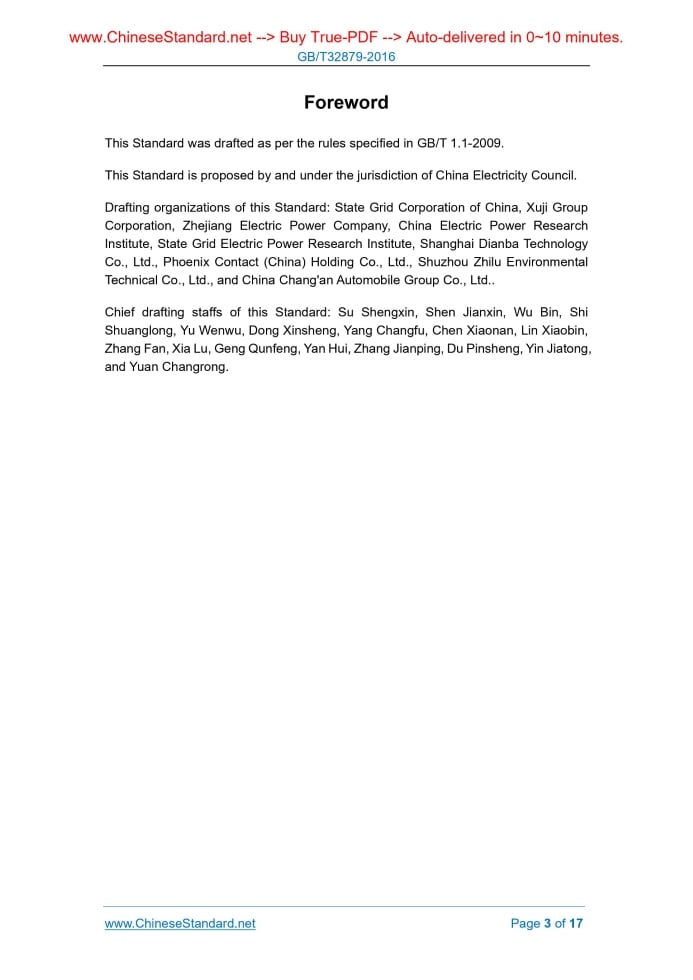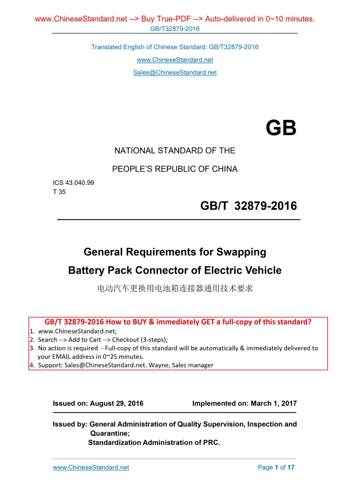 Similar standardsGB/T 32879-2016: General Requirements for Swapping Battery Pack Connector of Electric Vehicle---This is an excerpt. Full copy of true-PDF in English version (including equations, symbols, images, flow-chart, tables, and figures etc.), auto-downloaded/delivered in 9 seconds, can be purchased online: https://www.ChineseStandard.net/PDF.aspx/GBT32879-2016GB NATIONAL STANDARD OF THE PEOPLE’S REPUBLIC OF CHINA ICS 43.040.99 T 35 General Requirements for Swapping Battery Pack Connector of Electric Vehicle Issued on: AUGUST 29, 2016 Implemented on: MARCH 1, 2017 Issued by. General Administration of Quality Supervision, Inspection and Quarantine; Standardization Administration of PRC. Table of ContentsForeword ... 3 1 Scope ... 4 2 Normative References ... 4 3 Terms and Definitions ... 4 4 Rated Values ... 5 5 Structure and Function ... 5 6 Test Methods ... 9 7 Inspection Rules ... 14 8 Mark, Package, Transportation and Storage ... 16ForewordThis Standard was drafted as per the rules specified in GB/T 1.1-2009. This Standard is proposed by and under the jurisdiction of China Electricity Council. Drafting organizations of this Standard. State Grid Corporation of China, Xuji Group Corporation, Zhejiang Electric Power Company, China Electric Power Research Institute, State Grid Electric Power Research Institute, Shanghai Dianba Technology Co., Ltd., Phoenix Contact (China) Holding Co., Ltd., Shuzhou Zhilu Environmental Technical Co., Ltd., and China Chang'an Automobile Group Co., Ltd.. Chief drafting staffs of this Standard. Su Shengxin, Shen Jianxin, Wu Bin, Shi Shuanglong, Yu Wenwu, Dong Xinsheng, Yang Changfu, Chen Xiaonan, Lin Xiaobin, Zhang Fan, Xia Lu, Geng Qunfeng, Yan Hui, Zhang Jianping, Du Pinsheng, Yin Jiatong, and Yuan Changrong. General Requirements for Swapping Battery Pack Connector of Electric Vehicle1 ScopeThis Standard specifies the rated values, technical requirements, test methods, inspection rules, as well as the requirements for marks, package, transportation and storage of swapping battery pack connector (hereinafter referred to as “connector”) of electric vehicle. This Standard is applicable for the design, production and usage of the swapping battering pack connector of electric vehicle.2 Normative ReferencesThe following documents are essential to the application of this document. For the dated documents, only the versions with the dates indicated are applicable to this document; for the undated documents, only the latest version (including all the amendments) are applicable to this document. GB 4208-2008 Degrees of Protection Provided By Enclosure (IP Code) GB/T 11918.1-2014 Plugs, Socket-Outlet and Couplers for Industrial Purposes - Part 1. General Requirements GB/T 19596 Terminology of Electric Vehicles GB/T 20234.1-2015 Connection Set for Conductive Charging of Electric Vehicles - Part 1. General Requirements QC/T 413-2002 Basic Technical Requirements for Automotive Electric Equipment ISO 16750-3.2012 Road Vehicles – Environmental Conditions and Testing for Electrical and Electronic Equipment – Part 3. Mechanical Loads3 Terms and DefinitionsThe following terms and definitions stipulated in GB/T 11918.1-2014, GB/T 19596, b) After the correct connection of coupler plug, socket-outlet and cable, the danger of unexpected contact between the terminals on different poles, between terminal and metal components shall not occur; c) If bolt is taken for connection, then the anti-loose measure shall be adopted; d) If the motor circuit adopts cold extrusion crimping, the crimping quality shall be ensured, and conduct the tin filling treatment. 5.4 Guide floating requirements 5.4.1 The coupler shall be equipped with alignment input function, when coupling, it can automatically correct the position deviation; and ensure the accurate connecting. The guide mechanism can correct the angular deviation no less than 1°. The axis vertical direction of guide mechanism can correct the position deviation no less than 5mm. 5.4.2 The coupler is equipped with floating following mechanism; when the coupler plug disconnects from the socket-outlet, the socket-let that deviates in the running direction of the plug shall be put back automatically, and return to its original position. 5.4.3 The floating following mechanism, in the axial horizontal direction, can follow the position deviation no less than 5mm. 5.4.4 The floating following mechanism, in the axial vertical direction, can follow the position deviation no less than 5mm. 5.5 Inserting and pulling-out force The inserting and pulling-out force during the coupling and disconnecting of the coupler shall be no greater than 400N. 5.6 Protection against electric shock The protection against electric shock of coupler shall meet the requirements of Chapter 9 in GB/T 11918.1-2014. NOTE. signal and grounding terminal shall not be regarded as the live parts. 5.7 Grounding measures The grounding protection of the coupler shall meet the requirements of Chapter 10 in GB/T 11918.1-2014. 5.8 Terminals The terminals of coupler shall meet the requirements of Chapter 11 in GB/T 11918.1- 2014. free from burrs, flashes, and the like sharp edges; the position of grounding contacts or neutral contacts can’t be changed; it is equipped with the structure that ensure to prevent the incorrect coupling; the design of insulation gasket, partition board, and the like parts shall ensure their non-removable or prevent their incorrect positions; ensure the coupler is clearly labeled, the coupler shall be checked without lack of accessories as per the diagram provided by the manufacturer. 6.3 Guide floating requirements The guide floating of coupler shall meet the following requirements. a) Install the coupler on the special device, it shall be run as required during the insertion cycle period. Such special device can adjust the displacement of coupler plug and socket-outlet; namely, the transverse axial and vertical axis can realize the offset 