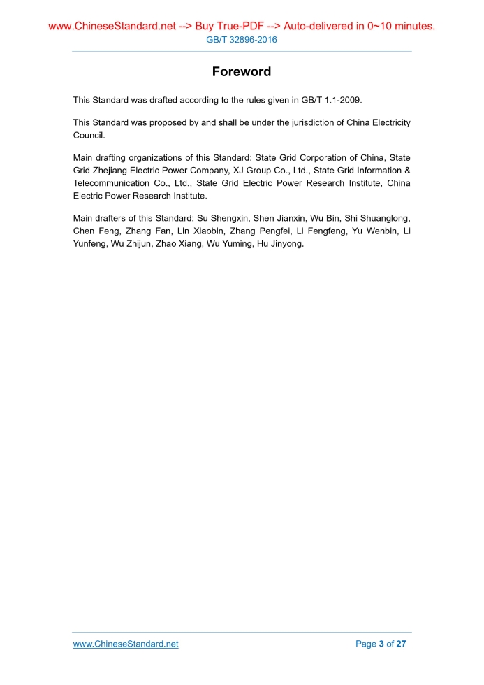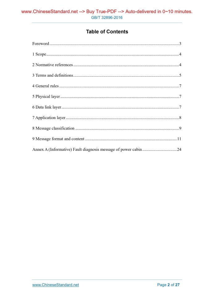 Similar standardsGB/T 32896-2016: Communication protocols for power cabin of electric vehicle---This is an excerpt. Full copy of true-PDF in English version (including equations, symbols, images, flow-chart, tables, and figures etc.), auto-downloaded/delivered in 9 seconds, can be purchased online: https://www.ChineseStandard.net/PDF.aspx/GBT32896-2016GB NATIONAL STANDARD OF THE PEOPLE’S REPUBLIC OF CHINA ICS 29.200 K 81 Communication protocols for power cabin of electric vehicle Issued on: AUGUST 29, 2016 Implemented on: MARCH 1, 2017 Issued by. General Administration of Quality Supervision, Inspection and Quarantine of the People's Republic of China; Standardization Administration of the People's Republic of China. Table of ContentsForeword ... 3 1 Scope ... 4 2 Normative references ... 4 3 Terms and definitions ... 5 4 General rules ... 7 5 Physical layer ... 7 6 Data link layer ... 7 7 Application layer ... 8 8 Message classification ... 9 9 Message format and content ... 11 Annex A (Informative) Fault diagnosis message of power cabin ... 24ForewordThis Standard was drafted according to the rules given in GB/T 1.1-2009. This Standard was proposed by and shall be under the jurisdiction of China Electricity Council. Main drafting organizations of this Standard. State Grid Corporation of China, State Grid Zhejiang Electric Power Company, XJ Group Co., Ltd., State Grid Information & Telecommunication Co., Ltd., State Grid Electric Power Research Institute, China Electric Power Research Institute. Main drafters of this Standard. Su Shengxin, Shen Jianxin, Wu Bin, Shi Shuanglong, Chen Feng, Zhang Fan, Lin Xiaobin, Zhang Pengfei, Li Fengfeng, Yu Wenbin, Li Yunfeng, Wu Zhijun, Zhao Xiang, Wu Yuming, Hu Jinyong. Communication protocols for power cabin of electric vehicle1 ScopeThis Standard specifies the definition of the communication physical layer, data link layer and application layer of power cabin of electric vehicles (hereinafter referred to as power cabin) basing on the control area network (CAN). This Standard applies to the communication between the power cabin of electric vehicle with the battery at quick-change mode and vehicle equipment.2 Normative referencesThe following documents are indispensable for the application of this document. For dated references, only the dated edition applies to this document. For undated references, the latest edition (including all amendments) applies to this document. GB/T 19596-2004 Terminology of electric vehicles ISO 11898-1.2003 Road vehicle - Control area network (CAN) - Part 1. Data link layer and physical signaling ISO 11898-2.2003 Road vehicle - Control area network (CAN) - Part 2. High-speed medium access unit ISO 11898-5.2006 Road vehicles - Controller area network (CAN) - Part 5. High- speed medium access unit with low-power mode SAE J1939-11.2006 Recommended practice for serial control and communication vehicle network - Part 11. Physical layer, 250 Kbits/s, twisted shielded pair SAE J1939-21.2006 Recommended practice for serial control and communication vehicle network - Part 21. Data link layer SAE J1939-73.2006 Recommended practice for serial control and communication vehicle network - Part 73. Application Layer - Diagnostics3 Terms and definitionsThe following terms and definitions and those defined in GB/T 19596-2004 apply to this document. 3.1 power cabin of EV The device in electric vehicles, carrying and locking a number of fast-change battery boxes, electrically and mechanically connecting with quick-change battery boxes and vehicles, and for the management of quick-change battery box. 3.2 frame A series of data bits that form a complete message. 3.3 CAN data frame The ordered bit fields necessary to form the CAN protocol for transmitting data, starting at start-of-frame (SOF) and ending at end-of-frame (EOF). 3.4 messages One or more “CAN data frames” with the same parameter group number. 3.5 identifier The identification part of the CAN arbitration field. 3.6 extended frame The CAN data frame defined in the CAN bus, using a 29-bit identifier. 3.7 priority 7.2 The parameter groups are numbered using PGN; each node identifies the contents of the data packet according to the PGN. 7.3 It uses “Request PGN” to actively acquire the parameter group of other nodes. 7.4 It uses cyclic transmission and event driving to transmit data. 7.5 If more than one PGN data needs to be sent to implement a function, multiple PGNs of the definition must be received to determine whether the function is sent successfully. 7.6 When defining a new parameter group, place the parameters of the same function, the parameters of the same or similar refresh frequency and the parameters belonging to the same subsystem in the same parameter group as far as possible. At the same time, the new parameter group shall make full use of 8-byte data width, to place the relevant parameters in the same group as far as possible, also it shall consider the scalability, reserving some bytes or bits, in order to be modified in the future. 7.7 When modifying the parameter group has been defined in this Standard, the definition of the defined byte or bit shall not be modified; the newly added parameter shall be related to the parameters already in the parameter group; it shall not add unrelated parameters to the defined PGN in order to save the number of PGNs. 7.8 The definition of fault diagnosis shall follow the requirements of the CAN bus diagnostic system in 5.1 of SAE J1939-73.2006; the definition of the fault diagnosis message is given in Annex A. 7.9 The single-byte parameter setting of invalid information unit shall be 0xFF, the double-byte parameter setting shall be 0xFFFF, the four-byte parameter setting shall be 0xFFFFFFFF, the invalid or reserved bit shall be set to 1.8 Message classification8.1 Basic information message The basic information is used to transfer the attribute information of the power cabin. The classification of the basic information me