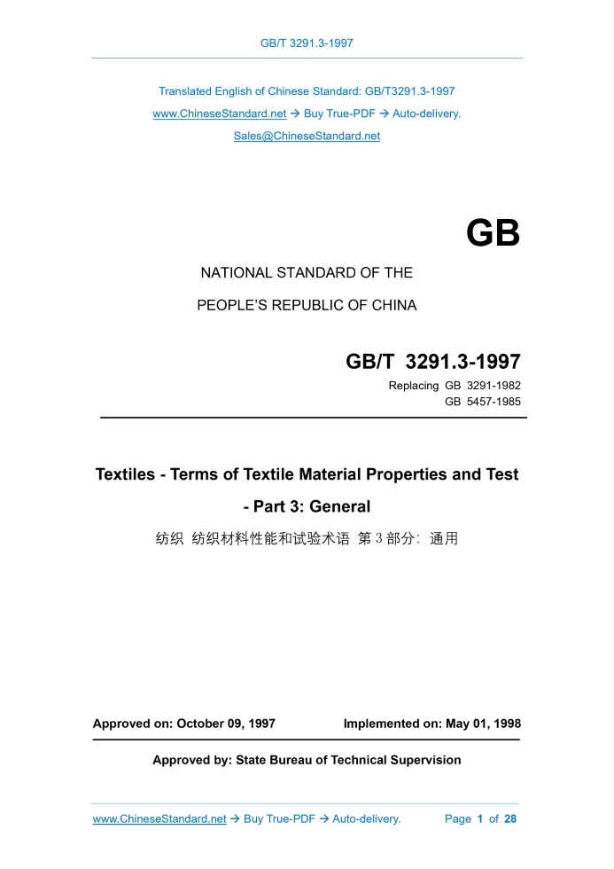 GB/T 3291.3-1997: Textiles. Terms of textile material properties and test. Part 3: General Delivery: 9 seconds. True-PDF full-copy in English & invoice will be downloaded + auto-delivered via email. See step-by-step procedure