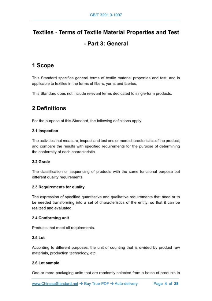 Similar standardsGB/T 3291.3-1997: Textiles. Terms of textile material properties and test. Part 3: General---This is an excerpt. Full copy of true-PDF in English version (including equations, symbols, images, flow-chart, tables, and figures etc.), auto-downloaded/delivered in 9 seconds, can be purchased online: https://www.ChineseStandard.net/PDF.aspx/GBT3291.3-1997GB NATIONAL STANDARD OF THE PEOPLE’S REPUBLIC OF CHINA Replacing GB 3291-1982 GB 5457-1985 Textiles - Terms of Textile Material Properties and Test - Part 3: General APPROVED ON: OCTOBER 09, 1997 IMPLEMENTED ON: MAY 01, 1998 Approved by: State Bureau of Technical Supervision Table of ContentsForeword ... 3 1 Scope ... 4 2 Definitions ... 4 Appendix A (Prompt) English Index ... 25 Textiles - Terms of Textile Material Properties and Test - Part 3: General1 ScopeThis Standard specifies general terms of textile material properties and test; and is applicable to textiles in the forms of fibers, yarns and fabrics. This Standard does not include relevant terms dedicated to single-form products.2 DefinitionsFor the purpose of this Standard, the following definitions apply. 2.1 Inspection The activities that measure, inspect and test one or more characteristics of the product; and compare the results with specified requirements for the purpose of determining the conformity of each characteristic. 2.2 Grade The classification or sequencing of products with the same functional purpose but different quality requirements. 2.3 Requirements for quality The expression of specified quantitative and qualitative requirements that need or to be needed transforming into a set of characteristics of the entity; so that it can be realized and evaluated. 2.4 Conforming unit Products that meet all requirements. 2.5 Lot According to different purposes, the unit of counting that is divided by product raw materials, production technology, etc. 2.6 Lot sample One or more packaging units that are randomly selected from a batch of products in 2.17 Instrumental error The intrinsic error of the test instrument. 2.18 Personal error The error that is caused by subjective factors and operating techniques of the measuring staffs. 2.19 Environmental error The error that is caused by the inconsistency between the actual environmental conditions and the specified conditions. 2.20 Error of method The error that is caused by imperfect measurement method. 2.21 Absolute error The difference between the measurement result and the measured (conventional) true value. 2.22 Relative error The ratio of the absolute error of the measurement to the measured (conventional) true value. 2.23 Correction In order to eliminate or reduce the systematic error, the value that is added to the actually-measured result by algebra. 2.24 Correction factor In order to eliminate or reduce the systematic error, the numerical factor that is multiplied by the actually-measured result. 2.25 Arithmetic mean The quotient that is obtained through dividing an algebraic sum of n measured values to be measured by n. 2.26 Weighted arithmetic mean; Lp For multiple measurements to be measured, the quotient that is obtained through DIVIDING the sum of the product of the arithmetic mean (L1, L2, ... Ln) of each group of measured values and the corresponding “weight” (p1, p2, ... pn) BY the sum of “weight”. A treatment to make the sample or specimen reach a lower moisture regain before conditioning in the standard atmosphere for the test. 2.34 Conditioning A treatment in which the sample or specimen is placed in the test standard atmosphere for a certain period of time to reach moisture equilibrium. 2.35 Standard atmosphere for preconditioning The relative humidity and temperature that are specified by the preconditioning treatment of the material. 2.36 Standard atmosphere for testing The relative humidity and temperature that are specified in the textile test. 2.37 Moisture equilibrium The state in which the moisture absorption and moisture release of textile materials reach a balance, and the change of its quality tends to zero. 2.38 Moisture content The percentage ratio of the mass of any form of water in the textile material that is measured by the prescribed method to the mass of the measured moisture-containing material. 2.39 Moisture regain The percentage ratio of the mass of any form of water in the textile material that is measured according to the prescribed method to the dry mass of the measured material. 2.40 Moisture and extractable component The percentage ratio of the mass of any form of water and extractables in the textile material that is measured by the prescribed method to the mass of the material after extraction and drying. 2.41 Moisture regain in the standard atmosphere After the textile material is preconditioned, the moisture regain when it reaches the moisture equilibrium in the standard atmosphere. 2.42 Conventional moisture regain The conventional value of the moisture regain of the textile material. 2.52 Liquid wicking rate A measurement of the capillary effect of a test material, which characterizes the speed of liquid transfer to the fabric. 2.53 Color fastness In processing and use, the color of textiles can withstand various effects. It is expressed by the degree of discoloration of the textiles and the degree of staining of the adjacent fabric. 2.54 Change in color A single or comprehensive change in the brightness, chroma or hue of a textile color. 2.55 Staining The dye in the bath liquid is absorbed into the adjacent fabric or the dye on the specimen is transferred to the adjacent fabric. 2.56 Photochromism A phenomenon that the colored textiles is restored the color after a short-time exposure and discoloration, then being placed in a dark place. Namely, the reversible discoloration that is produced by light. 2.57 Sublimation A phenomenon in which dyes on colored textiles are directly transformed into gaseous state by heating. 2.58 Yellowing A phenomenon that the