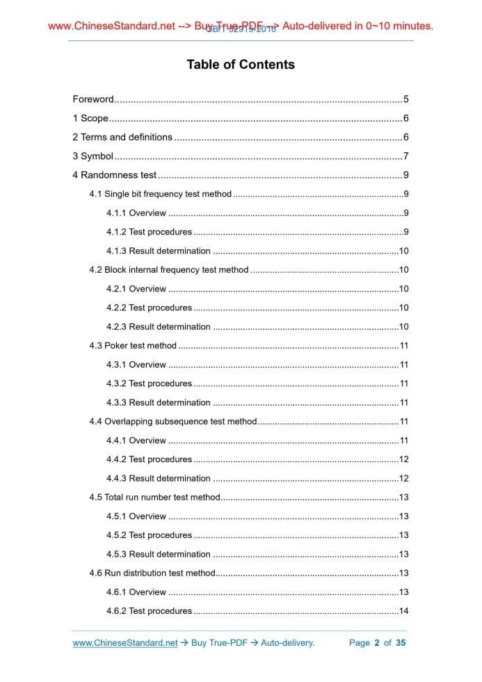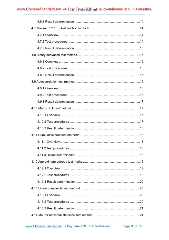 Similar standardsGB/T 32915-2016: Information security technology - Randomness test methods for binary sequence---This is an excerpt. Full copy of true-PDF in English version (including equations, symbols, images, flow-chart, tables, and figures etc.), auto-downloaded/delivered in 9 seconds, can be purchased online: https://www.ChineseStandard.net/PDF.aspx/GBT32915-2016GB NATIONAL STANDARD OF THE PEOPLE’S REPUBLIC OF CHINA ICS 35.040 L 80 Information security technology - Randomness test methods for binary sequence Issued on. AUGUST 29, 2016 Implemented on. MARCH 01, 2017 Issued by. General Administration of Quality Supervision Inspection and Quarantine of PRC; Standardization Administration of PRC. Table of ContentsForeword... 5 1 Scope... 6 2 Terms and definitions... 6 3 Symbol... 7 4 Randomness test... 9 5 Random number generator test... 23 Appendix A (Informative) Random test principle... 25 Appendix B (Informative) Randomness test parameter setting table... 35ForewordThis standard was drafted in accordance with the rules given in GB/T 1.1-2009. Please note that some of the contents of this document may involve patents. The issuing organization of this document is not responsible for identifying these patents. This standard was proposed by the National Cryptography Authority. This standard shall be under the jurisdiction of the National Information Security Standardization Technical Committee (SAC/TC 260). Drafting organizations of this standard. National Cryptographic Authority Commercial Password Testing Center, Institute of Software of Chinese Academy of Sciences, Beijing Institute of Information Science and Technology. The main drafters of this standard. Li Dawei, Feng Dengguo, Chen Hua, Zhang Chao, Zhou Yongbin, Dong Fang, Fan Limin, Xu Weiwei, Deng Kaiyong, Luo Peng. Information security technology - Randomness test methods for binary sequence1 ScopeThis standard specifies the randomness test indicators and test methods in commercial password applications. This standard applies to the randomness test of binary sequences generated by random number generators.2 Terms and definitionsThe following terms and definitions apply to this document. 2.1 Binary sequence A bit string consisting of “0” and “1”. 2.2 Random number generator A device or program that produces a random binary sequence. 2.3 Randomness hypothesis When performing randomness test on a binary sequence, first assume that the sequence is random. This assumption is called the original hypothesis or null hypothesis and is recorded as H0.The hypothesis opposite to the null hypothesis, that this sequence is not random, is called the alternative hypothesis, which is denoted as Hα. 2.4 Randomness test A function or process used for binary sequence test to determine whether to accept the randomness null hypothesis. 2.5 Significance level The probability of erroneously determining a random sequence as a non- random sequence in randomness test, which is represented by α.3 SymbolThe following symbols apply to this document. α. Significance level H0.Original hypothesis (null hypothesis) Hα. Alternative hypothesis ε. Sequence to be tested n. Bit length of the sequence to be tested4 Randomness test4.1 Single bit frequency test method 4.1.1 Overview Single-bit frequency test is the most basic test, which is used to detect whether the number of 0 and 1 in a binary sequence are similar. That is, if a binary sequence of length n is known, it is tested whether the sequence has a good 0, 1 balance. 4.1.2 Test procedures The single-bit frequency test procedures are as follows. Step 1.This test converts 0 and 1 in the sequence ε to be tested into -1 and 1, 4.1.3 Result determination The P_value result calculated in 4.1.2 is compared with the significance level α. If P_value ≥ α, the sequence to be tested is deemed to pass the single bit frequency test; otherwise, the sequence to be tested is deemed not to pass the single bit frequency test. 4.2 Block internal frequency test method 4.3 Poker test method 4.3.1 Overview Poker test is used to test whether the number of 2m subsequence types of length m is close. For random sequences, the number of 2m subsequences shall be close. 4.3.3 Result determination The P_value result calculated in 4.3.2 is compared with the significance level α. If P_value ≥ α, the sequence to be tested is deemed to pass the poker test; otherwise, the sequence to be tested is deemed not to pass the poker test. 4.4 Overlapping subsequence test method 4.4.1 Overview For any positive integer m, the binary sequence of length m has 2m types. Overlapping subsequence test divides the sequence to be tested (length n) into n superimposable m-bit subsequences. For a random binary sequence, the probability of occurrence of each mode of the m-bit superimposable subsequence shall be close due to its uniformity. 4.4.3 Result determination Compare the two P_value results calculated in 4.4.2 with the significance level α. If P_value1 ≥ α and P_value2 ≥ α, the sequence to be tested is deemed to pass the overlapping subsequence test. 4.5 Total run number test method 4.5.1 Overview A run is a subsequence in a sequence consisting of consecutive “0” or “1”, and the preamble and successor elements of the subsequence are different from their own elements. The total run number test mainly tests whether the total number of runs in the sequence to be tested obeys the randomness requirements. 4.7 Maximum “1” run test method in block 4.7.1 Overview The maximum “1” run test in the block divides the sequence to be tested into N subsequences of length m, where. The longest “1” run length in each subsequence is counted, and by assigning it to the corresponding set, the randomness of the sequence to be tested is evaluated in accordance with the distribution of the largest 1 run in each subsequence. 4.7.3 Result determination Compare the P_value result calculated in 4.7.2 with the significance level α. I