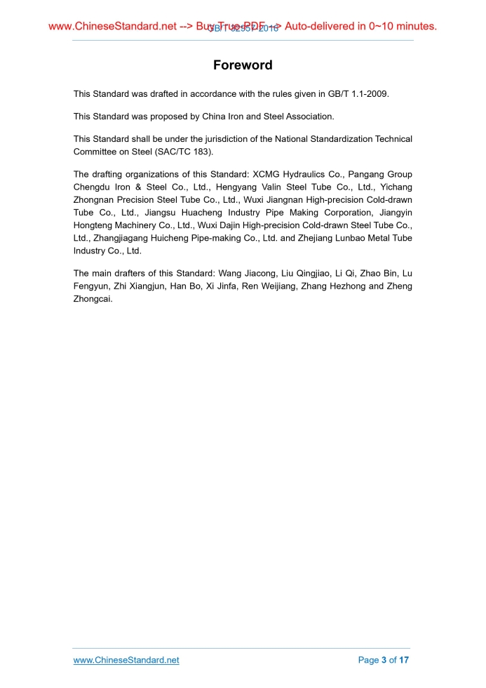 Similar standardsGB/T 32957-2016: Cold-drawn or Cold-rolled Precision Inside Diameter Seamless Steel Tube for Hydraulic and Pneumatic System Service---This is an excerpt. Full copy of true-PDF in English version (including equations, symbols, images, flow-chart, tables, and figures etc.), auto-downloaded/delivered in 9 seconds, can be purchased online: https://www.ChineseStandard.net/PDF.aspx/GBT32957-2016 GB NATIONAL STANDARD OF THE PEOPLE’S REPUBLIC OF CHINA ICS 77.140.75 H 48 Cold-drawn or Cold-rolled Precision Inside Diameter Seamless Steel Tube for Hydraulic and Pneumatic System Service Issued on: AUGUST 29, 2016 Implemented on: JULY 1, 2017 Issued by. General Administration of Quality Supervision, Inspection and Quarantine of the People's Republic of China; Standardization Administration of the People's Republic of China. Table of ContentsForeword ... 3 1 Scope ... 4 2 Normative References ... 4 3 Classification and Codes ... 6 4 Order Content... 6 5 Dimensions, Shape, Weight and Tolerances ... 6 6 Technical Requirements ... 3 7 Test Method ... 3 8 Inspection Rules ... 3 9 Packaging, Marking and Quality Certification ... 4ForewordThis Standard was drafted in accordance with the rules given in GB/T 1.1-2009. This Standard was proposed by China Iron and Steel Association. This Standard shall be under the jurisdiction of the National Standardization Technical Committee on Steel (SAC/TC 183). The drafting organizations of this Standard. XCMG Hydraulics Co., Pangang Group Chengdu Iron & Steel Co., Ltd., Hengyang Valin Steel Tube Co., Ltd., Yichang Zhongnan Precision Steel Tube Co., Ltd., Wuxi Jiangnan High-precision Cold-drawn Tube Co., Ltd., Jiangsu Huacheng Industry Pipe Making Corporation, Jiangyin Hongteng Machinery Co., Ltd., Wuxi Dajin High-precision Cold-drawn Steel Tube Co., Ltd., Zhangjiagang Huicheng Pipe-making Co., Ltd. and Zhejiang Lunbao Metal Tube Industry Co., Ltd. The main drafters of this Standard. Wang Jiacong, Liu Qingjiao, Li Qi, Zhao Bin, Lu Fengyun, Zhi Xiangjun, Han Bo, Xi Jinfa, Ren Weijiang, Zhang Hezhong and Zheng Zhongcai. Cold-drawn or Cold-rolled Precision Inside Diameter Seamless Steel Tube for Hydraulic and Pneumatic System Service1 ScopeThis Standard specifies the classification and codes, order content, dimensions, shape, weight and tolerances, technical requirements, test method, inspection rules, packaging, marking and quality certification for cold-drawn or cold-rolled precision inside diameter seamless steel tube for hydraulic and pneumatic system service. This Standard applies to cold-drawn or cold-rolled precision inside diameter seamless steel tube for hydraulic and pneumatic system service of an inside diameter 25 mm to 500 mm.2 Normative ReferencesThe following referenced documents are indispensable for the application of this document. For dated references, only the edition dated applies to this document. For undated references, the latest edition of the referenced document (including any amendments) applies to this Standard. GB/T 222 Permissible Tolerances for Chemical Composition of Steel Products GB/T 223.5 Steel and Iron – Determination of Acid-Soluble Silicon and Total Silicon Content – Reduced Molybdosilicate Spectrophotometric Method GB/T 223.12 Methods for Chemical Analysis of Iron, Steel and Alloy – the Sodium Carbonate Separation-Diphenyl Carbazide Photometric Method for the Determination Of Chromium Content GB/T 223.23 Iron, Steel and Alloy – Determination of Nickel Content – the Dimethylglyoxime Spectrophotometric Method GB/T 223.26 Iron, Steel and Alloy – Determination of Molybdenum Content – the Thiocyanate Spectrophotometric Method GB/T 223.53 Methods for Chemical Analysis of Iron, Steel and Alloy – the Flame Atomic Absorption Spectrophotometric Method for the Determination of Copper Content GB/T 223.59 Iron, Steel and Alloy – Determination of Phosphorus Content – Bismuth Phosphomolybdate Blue Spectrophotometric Method and Antimony Phosphomolybdate Blue Spectrophotometric Method GB/T 223.63 Methods for Chemical Analysis of Iron, Steel and Alloy - the Sodium (Potassium) Periodate Photometric Method for the Determination of Manganese Content GB/T 223.68 Methods for Chemical Analysis of Iron, Steel and Alloy – the Potassium Iodate Titration Method after Combustion in the Pipe Furnace for the Determination of Sulfur Content GB/T 223.69 Iron, Steel and Alloy – Determination of Carbon Content – Gas- volumetric Method after Combustion in the Pipe Furnace GB/T 228.1 Metallic Materials – Tensile Testing – Part 1. Method of Test at Room Temperature GB/T 229 Metallic Materials – Charpy Pendulum Impact Test Method GB/T 242 Metal Materials – Tube – Drift-expanding Test GB/T 246 Metal Materials – Tube - Flattening Test GB/T 699 Quality Carbon Structural Steels GB/T 1031 Geometrical Product Specifications (GPS) – Surface Texture. Profile Method – Surface Roughness Parameters and Their Values GB/T 1591-2008 High Strength Low Alloy Structural Steels GB/T 2102 Acceptance, Packing, Marking and Quality Certification of Steel Pipe GB/T 2975 Steel and Steel Products – Location and Preparation of Test Pieces for Mechanical Testing GB/T 3077-2015 Alloy Structure Steels GB/T 4336 Standard Test Method for Spark Discharge Atomic Emission Spectrometric Analysis of Carbon and Low-alloy Steel (Routine Method) GB/T 6394 Metal – Methods for Estimating the Average Grain Size GB/T 7735-2004 Steel Tubes - The Inspection Method on Eddy Current Test GB/T 12606-2016 Automated Full Peripheral Flux Leakage Testing of Seamless and Welded (Except Submerged Arc-welded) Ferromagnetic Steel Tubes for the Detection of Longitudinal and / or Transverse Imperfections GB/T 17395 Dimensions, Shapes, Masses and Tolerances of Seamless Steel Tubes 5.1.1 Steel tube is usually delivered in inside diameter and wall thickness. When the purchaser requires the supplier to deliver in outside diameter and inside diameter or outside diameter a