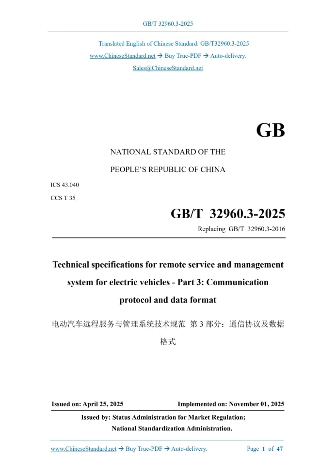 GB/T 32960.3-2025: Technical specifications for remote service and management system for lectric vehicles - Part 3: Communication protocol and data format Delivery: 9 seconds. True-PDF full-copy in English & invoice will be downloaded + auto-delivered via email. See step-by-step procedure Status: Valid GB/T 32960.3: Historical versions