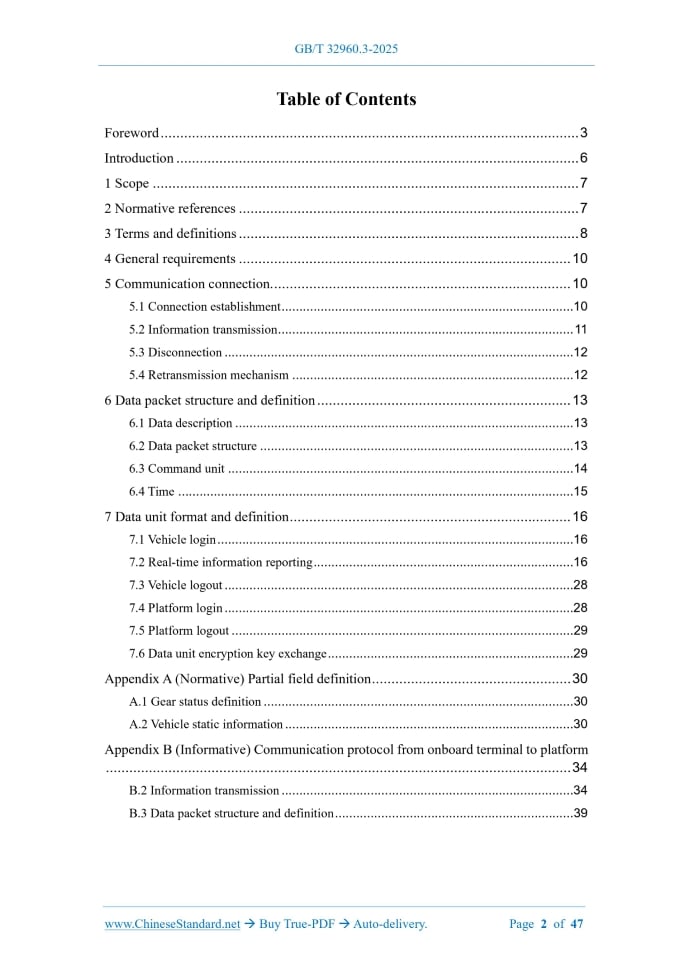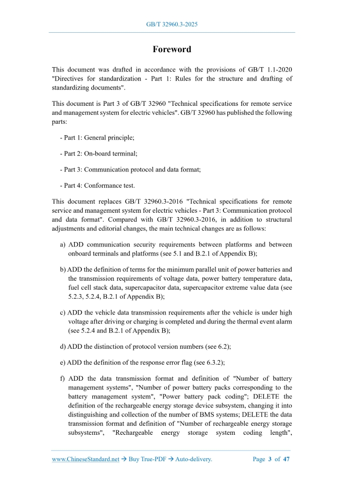 Similar standardsGB/T 32960.3-2025: Technical specifications for remote service and management system for lectric vehicles - Part 3: Communication protocol and data format---This is an excerpt. Full copy of true-PDF in English version (including equations, symbols, images, flow-chart, tables, and figures etc.), auto-downloaded/delivered in 9 seconds, can be purchased online: https://www.ChineseStandard.net/PDF.aspx/GBT32960.3-2025 GB NATIONAL STANDARD OF THE PEOPLE’S REPUBLIC OF CHINA ICS 43.040 CCS T 35 Replacing GB/T 32960.3-2016 Technical specifications for remote service and management system for electric vehicles - Part 3.Communication protocol and data format Issued on: APRIL 25, 2025 Implemented on: NOVEMBER 01, 2025 Issued by. Status Administration for Market Regulation; National Standardization Administration. Table of ContentsForeword... 3 Introduction... 6 1 Scope... 7 2 Normative references... 7 3 Terms and definitions... 8 4 General requirements... 10 5 Communication connection... 10 5.1 Connection establishment... 10 5.2 Information transmission... 11 5.3 Disconnection... 12 5.4 Retransmission mechanism... 12 6 Data packet structure and definition... 13 6.1 Data description... 13 6.2 Data packet structure... 13 6.3 Command unit... 14 6.4 Time... 15 7 Data unit format and definition... 16 7.1 Vehicle login... 16 7.2 Real-time information reporting... 16 7.3 Vehicle logout... 28 7.4 Platform login... 28 7.5 Platform logout... 29 7.6 Data unit encryption key exchange... 29 Appendix A (Normative) Partial field definition... 30 A.1 Gear status definition... 30 A.2 Vehicle static information... 30 Appendix B (Informative) Communication protocol from onboard terminal to platform ... 34 B.2 Information transmission... 34 B.3 Data packet structure and definition... 39ForewordThis document was drafted in accordance with the provisions of GB/T 1.1-2020 "Directives for standardization - Part 1.Rules for the structure and drafting of standardizing documents". This document is Part 3 of GB/T 32960 "Technical specifications for remote service and management system for electric vehicles". GB/T 32960 has published the following parts. - Part 1.General principle; - Part 2.On-board terminal; - Part 3.Communication protocol and data format; - Part 4.Conformance test. This document replaces GB/T 32960.3-2016 "Technical specifications for remote service and management system for electric vehicles - Part 3.Communication protocol and data format". Compared with GB/T 32960.3-2016, in addition to structural adjustments and editorial changes, the main technical changes are as follows. a) ADD communication security requirements between platforms and between onboard terminals and platforms (see 5.1 and B.2.1 of Appendix B); b) ADD the definition of terms for the minimum parallel unit of power batteries and the transmission requirements of voltage data, power battery temperature data, fuel cell stack data, supercapacitor data, supercapacitor extreme value data (see 5.2.3, 5.2.4, B.2.1 of Appendix B); c) ADD the vehicle data transmission requirements after the vehicle is under high voltage after driving or charging is completed and during the thermal event alarm (see 5.2.4 and B.2.1 of Appendix B); d) ADD the distinction of protocol version numbers (see 6.2); e) ADD the definition of the response error flag (see 6.3.2); f) ADD the data transmission format and definition of "Number of battery management systems", "Number of power battery packs corresponding to the battery management system", "Power battery pack coding"; DELETE the definition of the rechargeable energy storage device subsystem, changing it into distinguishing and collection of the number of BMS systems; DELETE the data transmission format and definition of "Number of rechargeable energy storage subsystems", "Rechargeable energy storage system coding length", "Rechargeable energy storage system coding" (see 7.1; 7.1 of the 2016 edition); g) ADD the transmission format and definition of signature information (see 7.2.1, 7.2.2, B.3.5.2.1, B.3.5.2.2 of Appendix B), activation information, activation result response information (see B.3.5.5; B.3.5.6 of Appendix B); h) ADD the power battery minimum parallel unit voltage data, power battery temperature data, fuel cell stack data, supercapacitor data, supercapacitor extreme value information type flag (see 7.2.3 and B.3.5.2.3 of Appendix B); i) ADD the transmission format and definition of power battery minimum parallel unit voltage data (see 7.2.4.2 and B.3.5.3.2 of Appendix B), power battery temperature data (see 7.2.4.3 and B.3.5.3.3 of Appendix B), fuel cell stack data (see 7.2.4.6 and B.3.5.3.6 of Appendix B), supercapacitor data (see 7.2.4.10 and B.3.5.3.10 of Appendix B), supercapacitor extreme value data (see 7.2.4.11 and B.3.5.3.11 of Appendix B); j) CHANGE the description of "rechargeable energy storage device voltage data" to "power battery minimum parallel unit voltage data" (see 7.2.4.2 and B.3.5.3.2 of Appendix B; B.3.5.3.8 of Appendix B of the 2016 edition); CHANGE the description of "rechargeable energy storage device temperature data" to "power battery temperature data" (see 7.2.4.3 and B.3.5.3.3 of Appendix B; B.3.5.3.9 of Appendix B of the 2016 edition); k) DELETE the data format and definition of power battery extreme value (see 7.2.3.6 of the 2016 edition); l) DELETE the rechargeable energy storage device voltage data (see B.3.5.3.8 of Appendix B of the 2016 edition); DELETE the rechargeable energy storage device temperature data (see B.3.5.3.9 of Appendix B of the 2016 edition); m) CHANGE the vehicle speed, total voltage, total current range, insulation resistance value definition in vehicle data (see 7.2.4.1; 7.2.3.1 of the 2016 edition); n) DELETE the format and definition of motor controller input voltage and motor controller DC bus current (see 7.2.3.2 of the 2016 edition); CHANGE the drive motor speed and drive motor torque range in the drive motor data (see 7.2.4.4; 7