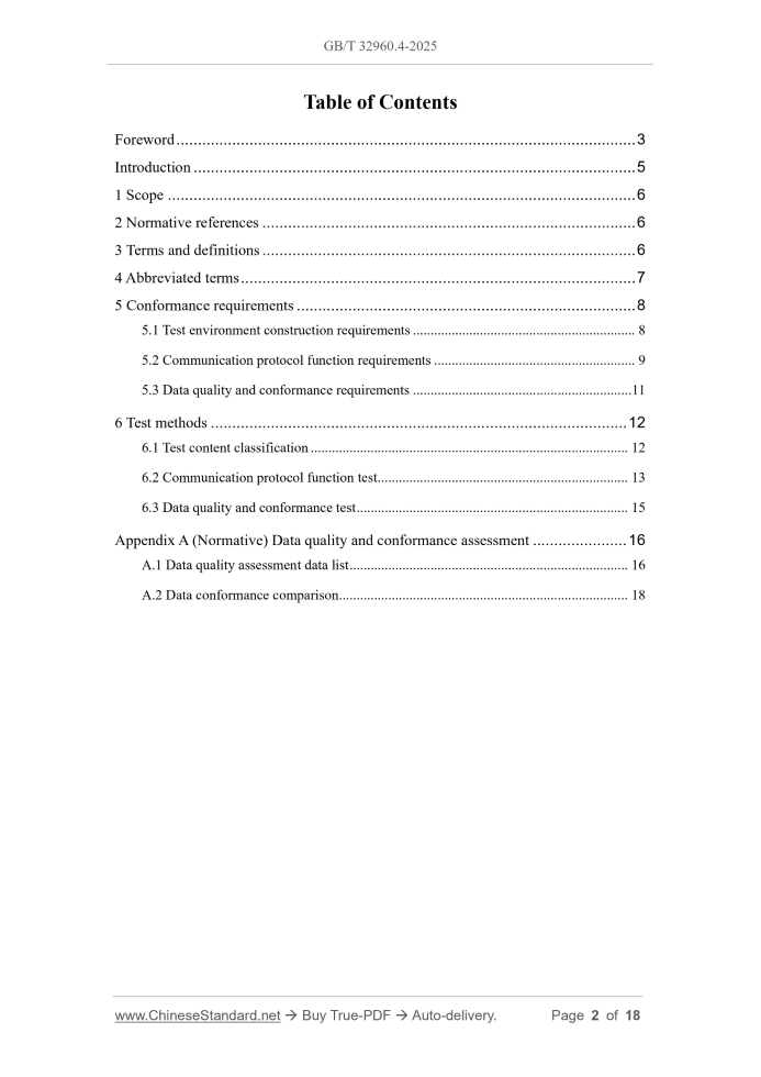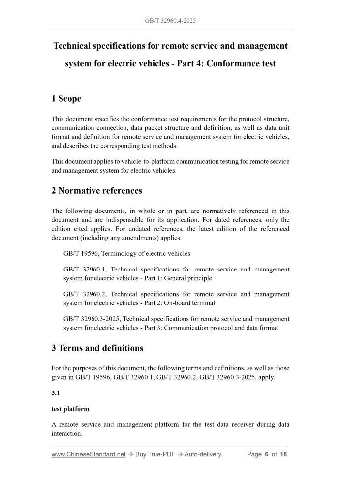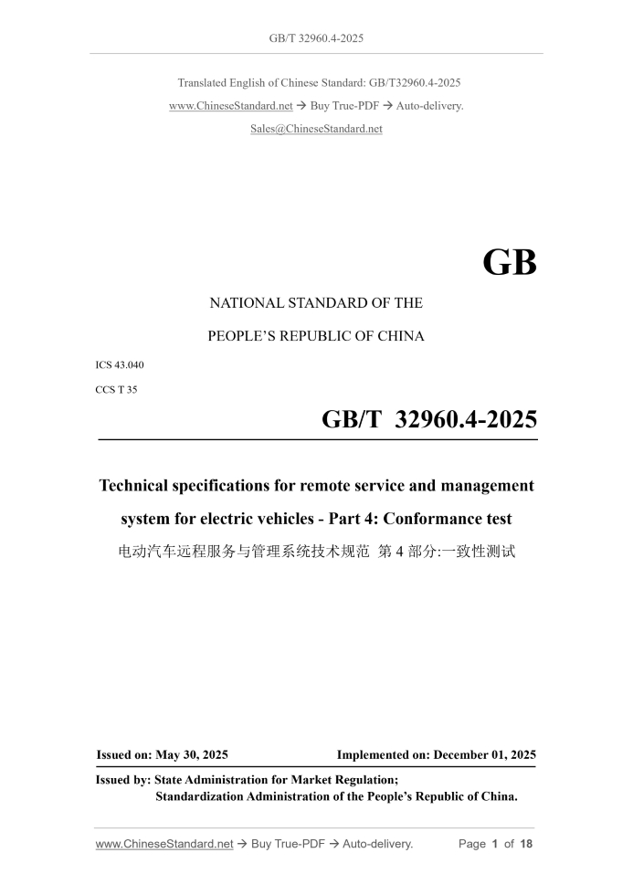Similar standardsGB/T 32960.4-2025: Technical specifications for remote service and management system for electric vehicles - Part 4: Conformance test---This is an excerpt. Full copy of true-PDF in English version (including equations, symbols, images, flow-chart, tables, and figures etc.), auto-downloaded/delivered in 9 seconds, can be purchased online: https://www.ChineseStandard.net/PDF.aspx/GBT32960.4-2025 GB NATIONAL STANDARD OF THE PEOPLE’S REPUBLIC OF CHINA ICS 43.040 CCS T 35 Technical specifications for remote service and management system for electric vehicles - Part 4.Conformance test Issued on: MAY 30, 2025 Implemented on: DECEMBER 01, 2025 Issued by. State Administration for Market Regulation; Standardization Administration of the People’s Republic of China. Table of ContentsForeword... 3 Introduction... 5 1 Scope... 6 2 Normative references... 6 3 Terms and definitions... 6 4 Abbreviated terms... 7 5 Conformance requirements... 8 5.1 Test environment construction requirements... 8 5.2 Communication protocol function requirements... 9 5.3 Data quality and conformance requirements... 11 6 Test methods... 12 6.1 Test content classification... 12 6.2 Communication protocol function test... 13 6.3 Data quality and conformance test... 15 Appendix A (Normative) Data quality and conformance assessment... 16 A.1 Data quality assessment data list... 16 A.2 Data conformance comparison... 18 Technical specifications for remote service and management system for electric vehicles - Part 4.Conformance test1 ScopeThis document specifies the conformance test requirements for the protocol structure, communication connection, data packet structure and definition, as well as data unit format and definition for remote service and management system for electric vehicles, and describes the corresponding test methods. This document applies to vehicle-to-platform communication testing for remote service and management system for electric vehicles.2 Normative referencesThe following documents, in whole or in part, are normatively referenced in this document and are indispensable for its application. For dated references, only the edition cited applies. For undated references, the latest edition of the referenced document (including any amendments) applies. GB/T 19596, Terminology of electric vehicles GB/T 32960.1, Technical specifications for remote service and management system for electric vehicles - Part 1.General principle GB/T 32960.2, Technical specifications for remote service and management system for electric vehicles - Part 2.On-board terminal GB/T 32960.3-2025, Technical specifications for remote service and management system for electric vehicles - Part 3.Communication protocol and data format3 Terms and definitionsFor the purposes of this document, the following terms and definitions, as well as those given in GB/T 19596, GB/T 32960.1, GB/T 32960.2, GB/T 32960.3-2025, apply. 3.1 test platform A remote service and management platform for the test data receiver during data interaction. 3.2 null value rate; NVR The proportion of null data units in the test data. Note. One or more null data unit(s) in a data item shall be counted as one null value data item. 3.3 abnormal value rate; AVR The proportion of abnormal data units in the test data. Note. One or more abnormal data units in a data item shall be counted as one abnormal data item. 3.4 invalid value rate; IVR The proportion of invalid data units in the test data. Note. One or more invalid data unit(s) in a data item shall be counted as one invalid data item. 3.5 packet loss rate; PLR The proportion of data transmission loss in the test data.4 Abbreviated termsFor the purposes of this document, the following abbreviated terms apply. CAN. Controller Area Network DBC. Database CAN OBD. Onboard Diagnostic System SOC. State of Charge 5.2.3 Data resend After resuming communication after being offline, the vehicle shall resend the data collected during the offline period immediately and upload them to the test platform. The time period for resending the information reporting shall not exceed 30 seconds. 5.2.4 Alarm resend If the communication link between the vehicle and the test platform is normal and the real-time information transmission time is greater than 1 minute, make the vehicle offline. When the offline time lasts for more than 5 minutes, any of the level 3 failure alarms or level 4 thermal event failure alarms specified in 7.2.4.9 of GB/T 32960.3- 2025 shall be triggered during the offline period. After successful re-logins, the vehicle shall immediately resend data during the offline period upload them to the test platform. The data sampling period from 30 seconds before the level 3 or level 4 failure alarm point to the alarm release shall not exceed 1 second. The time period for resending information reporting during the rest of the time shall not exceed 30 seconds. 5.2.5 Vehicle charging When the communication link between the vehicle and the test platform is normal, the vehicle is subjected to charging test. If the charging time is greater than 15 minutes, or the vehicle SOC reaches 100% after charging for more than 5 minutes, test the data upload protocol conformance. 5.2.6 Power-off monitoring When the communication link between the vehicle and the test platform is normal, and after the vehicle completes driving or charging and then turns off the high voltage, it shall continue to monitor and report the power battery-related data specified in 7.2.4.2 and 7.2.4.3 of GB/T 32960.3-2025.Within 1 hour after power-off, it shall continue to monitor at a monitoring frequency of not less than 1 Hz, and report the power battery- related data specified in 7.2.4.2 and 7.2.4.3 of GB/T 32960.3-2025 within 59 minutes and 30 seconds to 1 hour (including at least 1 data). During the 1-hour monitoring period, when level 3 or level 4 failure alarms in Table 24 of GB/T 32960.3-2025 are detected, the first frame after the on-board terminal is
