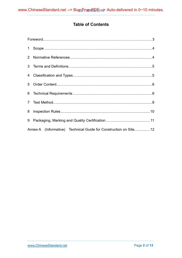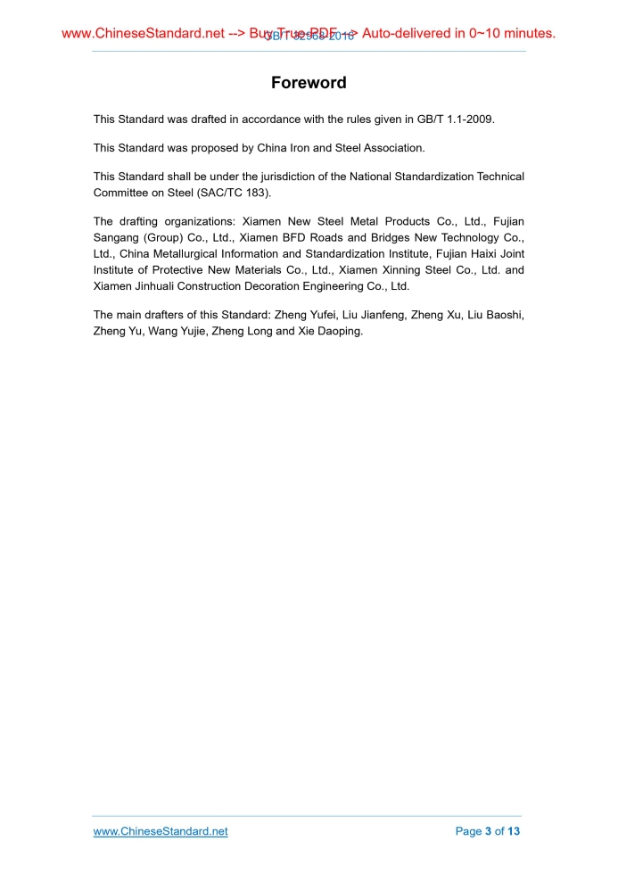 Similar standardsGB/T 32968-2016: Zinc-aluminum Alloy Coated Steel Bars for the Reinforcement of Concrete---This is an excerpt. Full copy of true-PDF in English version (including equations, symbols, images, flow-chart, tables, and figures etc.), auto-downloaded/delivered in 9 seconds, can be purchased online: https://www.ChineseStandard.net/PDF.aspx/GBT32968-2016GB NATIONAL STANDARD OF THE PEOPLE’S REPUBLIC OF CHINA ICS 77.140.60 Z 44 Zinc-aluminum Alloy Coated Steel Bars for the Reinforcement of Concrete Issued on: AUGUST 19, 2016 Implemented on: JULY 1, 2017 Issued by. General Administration of Quality Supervision, Inspection and Quarantine of the People's Republic of China; Standardization Administration of the People's Republic of China. Table of ContentsForeword ... 3 1 Scope ... 4 2 Normative References ... 4 3 Terms and Definitions ... 5 4 Classification and Types ... 5 5 Order Content ... 6 6 Technical Requirements ... 6 7 Test Method ... 8 8 Inspection Rules ... 10 9 Packaging, Marking and Quality Certification ... 11 Annex A (Informative) Technical Guide for Construction on Site ... 12ForewordThis Standard was drafted in accordance with the rules given in GB/T 1.1-2009. This Standard was proposed by China Iron and Steel Association. This Standard shall be under the jurisdiction of the National Standardization Technical Committee on Steel (SAC/TC 183). The drafting organizations. Xiamen New Steel Metal Products Co., Ltd., Fujian Sangang (Group) Co., Ltd., Xiamen BFD Roads and Bridges New Technology Co., Ltd., China Metallurgical Information and Standardization Institute, Fujian Haixi Joint Institute of Protective New Materials Co., Ltd., Xiamen Xinning Steel Co., Ltd. and Xiamen Jinhuali Construction Decoration Engineering Co., Ltd. The main drafters of this Standard. Zheng Yufei, Liu Jianfeng, Zheng Xu, Liu Baoshi, Zheng Yu, Wang Yujie, Zheng Long and Xie Daoping. Zinc-aluminum Alloy Coated Steel Bars for the Reinforcement of Concrete1 ScopeThis Standard specifies terms and definitions, categories and types, order content, technical requirements, test methods, inspection rules, marking and quality certification of zinc-aluminum alloy coated steel bars for the reinforcement of concrete. This Standard applies to the continuous hot-dipped zinc-aluminum alloy ribbed steel bars and plain round steel bars for the reinforcement of concrete (hereinafter referred to as steel bars).2 Normative ReferencesThe following referenced documents are indispensable for the application of this document. For dated references, only the edition dated applies to this document. For undated references, the latest edition of the referenced document (including any amendments) applies to this Standard. GB/T 470 Zinc Ingots GB 1499.1 Steel for the Reinforcement of Concrete – Part 1. Hot Rolled Plain Bars GB 1499.2 Steel for the Reinforcement of Concrete – Part 2. Hot Rolled Ribbed Bars GB/T 2101 General Provisions on Acceptance, Package, Marking and Quality Certificate For Profile Steel GB/T 3082 Galvanized or Zinc-5% Aluminum-Mixed Mischmetal Alloy-Coated Low Carbon Steel Wire for Armouring Cables GB/T 4956 Non-magnetic Coatings on Magnetic Substrates – Measurement of Coating Thickness – Magnetic Method GB/T 6462 Metallic and Oxide Coatings – Measurement of Coating Thickness - Microscopic Method GB/T 9793 Thermal Spraying – Metallic and Other Inorganic Coatings – Zinc, Aluminium and Their Alloys GB/T 13825 Metallic Coatings – Hot Dip Galvanized Coatings on Ferrous Materials – Gravimetric Determination of the Mass Per Unit Area to 1 μm. 6.3.3 Coating bendability The coating bendability shall be determined by bending test. After bending test, the bending surface of test pieces shall be free from any visible crack or stripping. 6.3.4 Aluminum content The aluminum content in the zinc-aluminum coatings shall be 0.05% to 0.5% or 4.2% to 6.2%. 6.4 Skipping and repairing 6.4.1 Skipping The total area of skipping for each meter of steel bar shall not exceed 0.5% of the total area of steel bars; and the number of skipping per meter shall not exceed 3. If the skipping area is more than the above-mentioned value, steel bars shall be re-coated. The skipping areas shall not include the end faces and cutting faces of steel bars. 6.4.2 Repairing If there are areas needing to be repaired on the surface of steel bars such as skipping or surface damaging, they shall be repaired by applying zinc-rich paint or thermal spraying zinc alloy or other means. Before repairing, remove the oxide skin or other dirt within the repairing area, or take other pretreating measures, in order to ensure the adhesive force between the repairing layer and the base. If they are repaired by thermal spraying, it shall be conducted in accordance with the requirements of GB/T 9793. The coating thickness within the repairing areas is usually more than 30 μm thicker than the coating thickness specified in 6.3.2. 6.5 Technical guide for construction on site Refer to Annex A for the technical guide for the construction of steel bars on site.7 Test Method7.1 Test items 7.1.1 The test items, sampling quantity, sampling methods and test methods for each batch of steel bars shall meet the specifications of Table 2. Table 2 Test Items, Sampling Quantity, Sampling Methods and Test Methods S/N Test itema Sampling quantity/pc(s) Sampling method Test method 1 Appearance 3 Take different ones at random 7.2Annex A(Informative) Technical Guide for Construction on Site A.1 When coated steel bars are handled, abrasion shall be prevented between all bundles of steel bars or between all steel bars. A.2 When they are handled by machinery, the position in contact with coated steel bars shall be provided with protective measures. A.3 Coated steel bars shall be unloaded at the location closest to the place where a reinforced concrete structure is laid or closest to the place of a crane in order to facilitate hoisting them into the position of laying. A