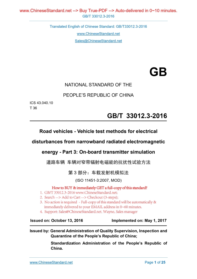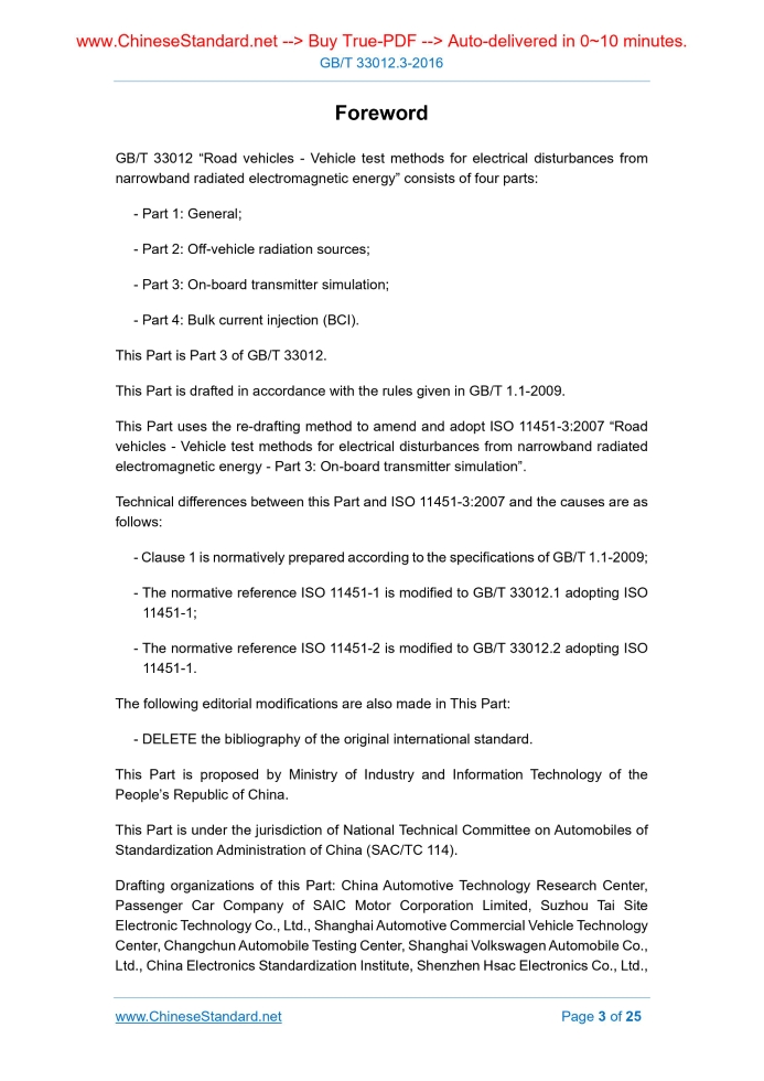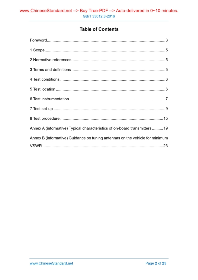 Similar standardsGB/T 33012.3-2016: Road vehicles -- Vehicle test methods for electrical disturbances from narrowband radiated electromagnetic energy -- Part 3: On-board transmitter simulation---This is an excerpt. Full copy of true-PDF in English version (including equations, symbols, images, flow-chart, tables, and figures etc.), auto-downloaded/delivered in 9 seconds, can be purchased online: https://www.ChineseStandard.net/PDF.aspx/GBT33012.3-2016 GB NATIONAL STANDARD OF THE PEOPLE’S REPUBLIC OF CHINA ICS 43.040.10 T 36 Road vehicles - Vehicle test methods for electrical disturbances from narrowband radiated electromagnetic energy - Part 3. On-board transmitter simulation (ISO 11451-3.2007, MOD) Issued on: OCTOBER 13, 2016 Implemented on: MAY 1, 2017 Issued by. General Administration of Quality Supervision, Inspection and Quarantine of the People’s Republic of China; Standardization Administration of the People’s Republic of China. 3. No action is required - Full-copy of this standard will be automatically & immediately delivered to your EMAIL address in 0~60 minutes. Table of ContentsForeword ... 3 1 Scope ... 5 2 Normative references ... 5 3 Terms and definitions ... 5 4 Test conditions ... 6 5 Test location ... 6 6 Test instrumentation ... 7 7 Test set-up ... 9 8 Test procedure ... 15 Annex A (informative) Typical characteristics of on-board transmitters ... 19 Annex B (informative) Guidance on tuning antennas on the vehicle for minimum VSWR ... 23ForewordGB/T 33012 “Road vehicles - Vehicle test methods for electrical disturbances from narrowband radiated electromagnetic energy” consists of four parts. - Part 1. General; - Part 2. Off-vehicle radiation sources; - Part 3. On-board transmitter simulation; - Part 4. Bulk current injection (BCI). This Part is Part 3 of GB/T 33012. This Part is drafted in accordance with the rules given in GB/T 1.1-2009. This Part uses the re-drafting method to amend and adopt ISO 11451-3.2007 “Road vehicles - Vehicle test methods for electrical disturbances from narrowband radiated electromagnetic energy - Part 3. On-board transmitter simulation”. Technical differences between this Part and ISO 11451-3.2007 and the causes are as follows. - Clause 1 is normatively prepared according to the specifications of GB/T 1.1-2009; - The normative reference ISO 11451-1 is modified to GB/T 33012.1 adopting ISO 11451-1; - The normative reference ISO 11451-2 is modified to GB/T 33012.2 adopting ISO 11451-1. The following editorial modifications are also made in This Part. - DELETE the bibliography of the original international standard. This Part is proposed by Ministry of Industry and Information Technology of the People’s Republic of China. This Part is under the jurisdiction of National Technical Committee on Automobiles of Standardization Administration of China (SAC/TC 114). Drafting organizations of this Part. China Automotive Technology Research Center, Passenger Car Company of SAIC Motor Corporation Limited, Suzhou Tai Site Electronic Technology Co., Ltd., Shanghai Automotive Commercial Vehicle Technology Center, Changchun Automobile Testing Center, Shanghai Volkswagen Automobile Co., Ltd., China Electronics Standardization Institute, Shenzhen Hsac Electronics Co., Ltd., Road vehicles - Vehicle test methods for electrical disturbances from narrowband radiated electromagnetic energy - Part 3. On-board transmitter simulation1 ScopeThis Part of GB/T 33012 specifies the test conditions, test location, test equipment and test procedure for vehicle test methods for electrical disturbances from narrowband radiated electromagnetic energy - on-board transmitter simulation. This Part applies to M, N and O vehicles (regardless of the vehicle power system, e.g. spark-ignition engine, diesel engine, electric motor). NOTE. On-board transmitters include on-board transmitters connected to an external antenna and portable transmitters with integral antennas.2 Normative referencesThe following referenced documents are indispensable for the application of this document. For dated references, only the edition cited applies. For undated references, the latest edition of the referenced document (including any amendments) applies. GB/T 33012.1 Road vehicles - Vehicle test methods for electrical disturbances from narrowband radiated electromagnetic energy - Part 1. General (GB/T 33012.1-2016, ISO 11451-1.2005 + A1. 2008, MOD) GB/T 33012.2 Road vehicles - Vehicle test methods for electrical disturbances from narrowband radiated electromagnetic energy - Part 2. Off-vehicle radiation sources (GB/T 33012.2-2016, ISO 11451-2.2005, MOD)3 Terms and definitionsFor the purposes of this document, the terms and definitions given in GB/T 33012.1 and the following apply. 3.1 integral antenna 6.4 Antennas 6.4.1 Transmitters with antenna outside the vehicle 6.4.1.1 Simulated on-board transmitters When an OEM antenna is not installed on the vehicle, the antenna(s) described below shall be used. - For frequency ranges lower than 30 MHz, loaded antennas shall be used. Loaded antennas employ lumped or distributed reactive components with a radiating element physically shorter than quarter wave at resonance. - For frequency ranges higher than 30 MHz, e.g. for the very high frequency (VHF) and ultra-high frequency (UHF) bands, quarter wave antennas shall be given preference over 5/8 wave antennas, since there are higher skin currents created by quarter wave antennas. All antennas shall be tuned on the vehicle for minimum voltage standing wave ratio (VSWR, typically less than 2.1), unless otherwise specified in the test plan. As a minimum, the VSWR value shall be recorded with the antenna on the vehicle at the lower and upper band edge and at a middle frequency (see Annex B). NOTE. The resulting VSWR is compatible with the design of the RF source. When an OEM antenna is actually installed on the vehicle, this antenna shall be used for the test in the appropriate frequency range. In this