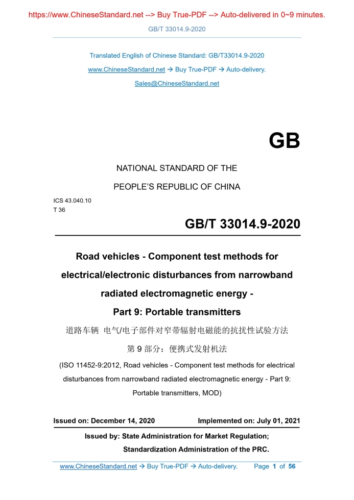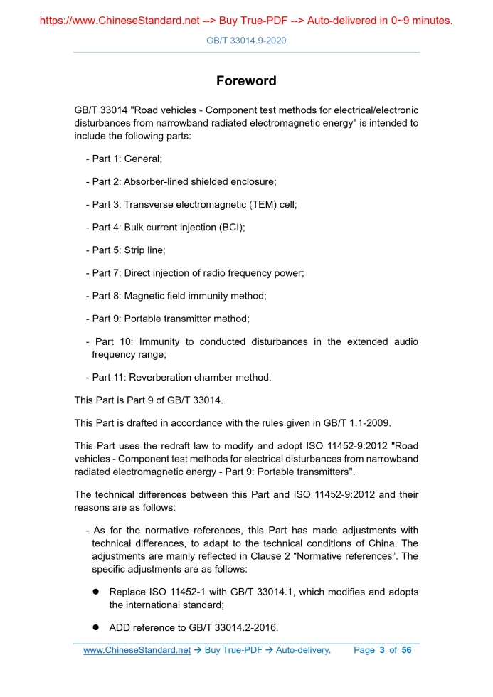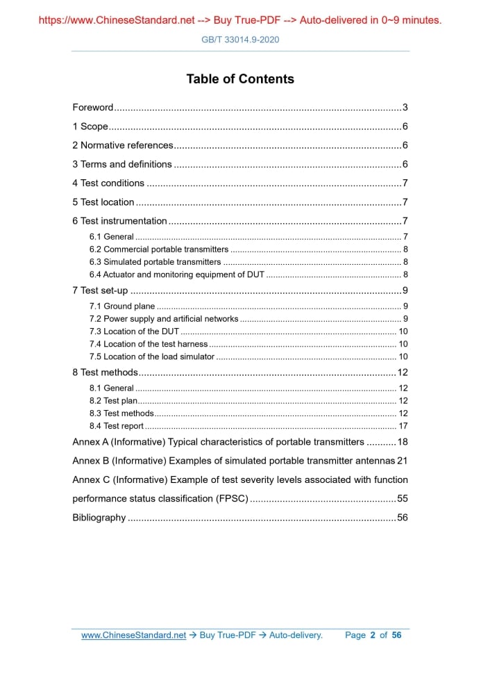 Similar standardsGB/T 33014.9-2020: Road vehicles - Component test methods for electrical/electronic disturbances from narrowband radiated electromagnetic energy - Part 9: Portable transmitters---This is an excerpt. Full copy of true-PDF in English version (including equations, symbols, images, flow-chart, tables, and figures etc.), auto-downloaded/delivered in 9 seconds, can be purchased online: https://www.ChineseStandard.net/PDF.aspx/GBT33014.9-2020 GB NATIONAL STANDARD OF THE PEOPLE’S REPUBLIC OF CHINA ICS 43.040.10 T 36 Road vehicles - Component test methods for electrical/electronic disturbances from narrowband radiated electromagnetic energy - Part 9.Portable transmitters (ISO 11452-9.2012, Road vehicles - Component test methods for electrical disturbances from narrowband radiated electromagnetic energy - Part 9. Portable transmitters, MOD) Issued on. DECEMBER 14, 2020 Implemented on. JULY 01, 2021 Issued by. State Administration for Market Regulation; Standardization Administration of the PRC. Table of ContentsForeword... 3 1 Scope... 6 2 Normative references... 6 3 Terms and definitions... 6 4 Test conditions... 7 5 Test location... 7 6 Test instrumentation... 7 6.1 General... 7 6.2 Commercial portable transmitters... 8 6.3 Simulated portable transmitters... 8 6.4 Actuator and monitoring equipment of DUT... 8 7 Test set-up... 9 7.1 Ground plane... 9 7.2 Power supply and artificial networks... 9 7.3 Location of the DUT... 10 7.4 Location of the test harness... 10 7.5 Location of the load simulator... 10 8 Test methods... 12 8.1 General... 12 8.2 Test plan... 12 8.3 Test methods... 12 8.4 Test report... 17 Annex A (Informative) Typical characteristics of portable transmitters... 18 Annex B (Informative) Examples of simulated portable transmitter antennas 21 Annex C (Informative) Example of test severity levels associated with function performance status classification (FPSC)... 55 Bibliography... 56ForewordGB/T 33014 "Road vehicles - Component test methods for electrical/electronic disturbances from narrowband radiated electromagnetic energy" is intended to include the following parts. - Part 1.General; - Part 2.Absorber-lined shielded enclosure; - Part 3.Transverse electromagnetic (TEM) cell; - Part 4.Bulk current injection (BCI); - Part 5.Strip line; - Part 7.Direct injection of radio frequency power; - Part 8.Magnetic field immunity method; - Part 9.Portable transmitter method; - Part 10.Immunity to conducted disturbances in the extended audio frequency range; - Part 11.Reverberation chamber method. This Part is Part 9 of GB/T 33014. This Part is drafted in accordance with the rules given in GB/T 1.1-2009. This Part uses the redraft law to modify and adopt ISO 11452-9.2012 "Road vehicles - Component test methods for electrical disturbances from narrowband radiated electromagnetic energy - Part 9.Portable transmitters". The technical differences between this Part and ISO 11452-9.2012 and their reasons are as follows. - As for the normative references, this Part has made adjustments with technical differences, to adapt to the technical conditions of China. The adjustments are mainly reflected in Clause 2 “Normative references”. The specific adjustments are as follows. ⚫ Replace ISO 11452-1 with GB/T 33014.1, which modifies and adopts the international standard; ⚫ ADD reference to GB/T 33014.2-2016. - ADD notes to the numbers in Figure 6. - The figures in Table B.1 in the previous text are incorrect. This Part has made corrections. - The remote/local grounding in the previous text 7.2 adopts Annex D; this Part adopts the equivalent GB/T 33014.2-2016 Annex B, to avoid repetition of the same content. At the same time, delete Annex D. - Rearrange the frequency bands in Annex A of the previous text; GIVE a note for the international frequency bands not used in China; ADD some frequency bands used in China. - ADD annotations to Category 1, Category 2, and Category 3 in Annex C, to facilitate users' understanding and selection. This Part has made the following editorial changes. - In order to be consistent with China's technical standard system, change the standard name to "Road vehicles - Component test methods for electrical/electronic disturbances from narrowband radiated electromagnetic energy - Part 9.Portable transmitters"; - According to the requirements of GB/T 1.1-2009, standardize the writing of Clause 1; - ADD the bibliography. This Part was proposed by Ministry of Industry and Information Technology of the PRC. This Part shall be under the jurisdiction of National Technical Committee of Auto Standardization (SAC/TC 114). Drafting organizations of this Part. China Electronics Standardization Institute; China Automotive Technology and Research Center Co., Ltd.; The Fifth Electronics Research Institute of the Ministry of Industry and Information Technology; FAW-Volkswagen Automotive Co., Ltd.; Zhengzhou Yutong Bus Co., Ltd.; Xiangyang Da An Automobile Test Center Co., Ltd.; Suzhou 3ctest Electronic Co., Ltd.; Shanghai Electrical Apparatus Research Institute; Changchun Automotive Test Center Co., Ltd.; SAIC Volkswagen Automotive Co., Ltd.; Brilliance Auto Group Holdings Co., Ltd.; Chery Automobile Co., Ltd.; Great Wall Motor Co., Ltd.; Pan Asia Technical Automotive Center Co., Ltd.; Huizhou Desay SV Automotive Co., Ltd.; Guangzhou Automobile Group Co., Ltd. Automotive Engineering Research Institute; Nanjing Automobile Group Corporation Automotive Engineering Research Institute; Beijing Audeco Auto Electronic Product Testing Co., Ltd.; Geely Automobile Research Institute (Ningbo) Co., Ltd.; Shaanxi Heavy Duty Automobile Co., Ltd.; Centre Testing International (Ningbo) Co., Ltd.; Anhui Jianghuai Automobile Group Corp., Ltd.; Dekra Certification Services (Suzhou) Co., Ltd.; United Automotive Electronic Systems Co., Ltd.; BMW Brilliance Automotive Ltd.; Shanghai NIO Automobile Co., Ltd.; Denso (China) Investment Co., Ltd.; Toyota Motor (China) Investment Co., Ltd.; Ford Mo
