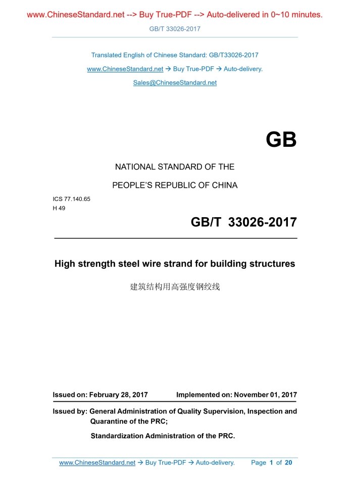 NATIONAL STANDARD OF THE PEOPLE’S REPUBLIC OF CHINA ICS 77.140.65 H 49 High strength steel wire strand for building structures ISSUED ON: FEBRUARY 28, 2017 IMPLEMENTED ON: NOVEMBER 01, 2017 Issued by: General Administration of Quality Supervision, Inspection and Quarantine of the PRC; Standardization Administration of the PRC.