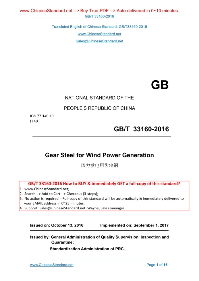 GB/T 33160-2016: Gear Steel for Wind Power Generation Delivery: 9 seconds. True-PDF full-copy in English & invoice will be downloaded + auto-delivered via email. See step-by-step procedure Status: Valid