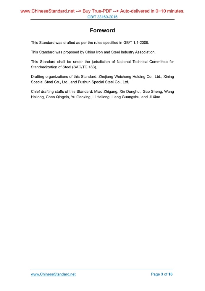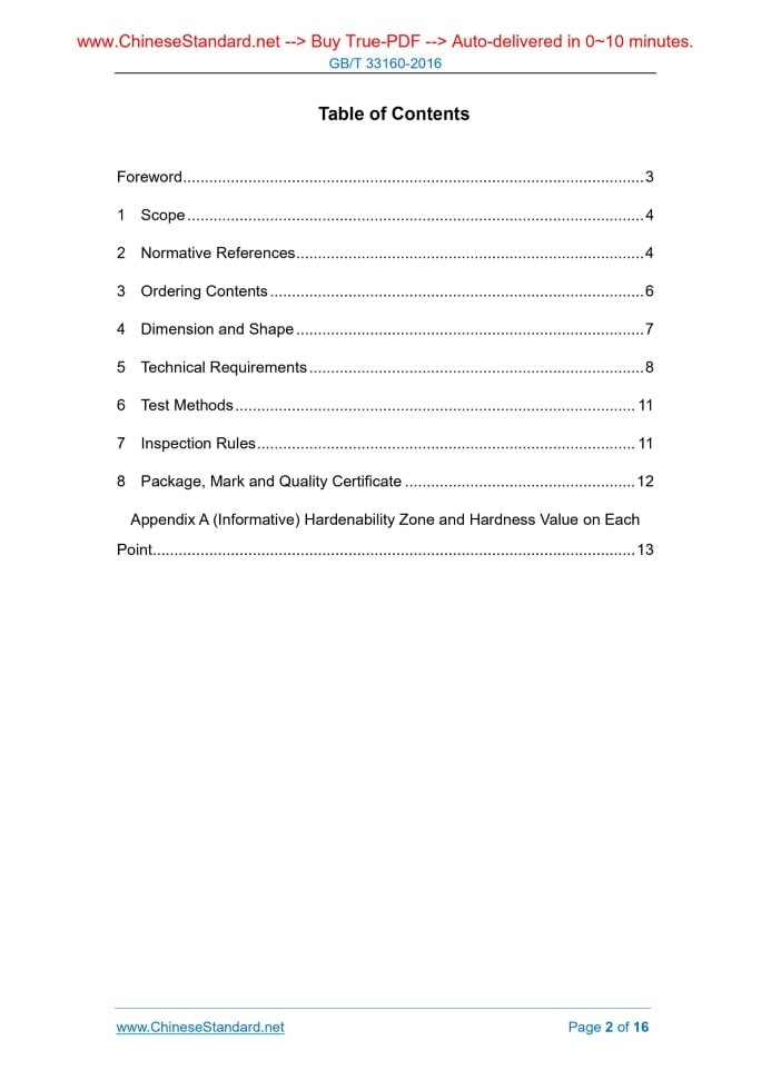 Similar standardsGB/T 33160-2016: Gear Steel for Wind Power Generation---This is an excerpt. Full copy of true-PDF in English version (including equations, symbols, images, flow-chart, tables, and figures etc.), auto-downloaded/delivered in 9 seconds, can be purchased online: https://www.ChineseStandard.net/PDF.aspx/GBT33160-2016GB NATIONAL STANDARD OF THE PEOPLE’S REPUBLIC OF CHINA ICS 77.140.10 H 40 Gear Steel for Wind Power Generation Issued on: OCTOBER 13, 2016 Implemented on: SEPTEMBER 1, 2017 Issued by. General Administration of Quality Supervision, Inspection and Quarantine; Standardization Administration of PRC. Table of ContentsForeword ... 3 1 Scope ... 4 2 Normative References ... 4 3 Ordering Contents ... 6 4 Dimension and Shape ... 7 5 Technical Requirements ... 8 6 Test Methods ... 11 7 Inspection Rules ... 11 8 Package, Mark and Quality Certificate ... 12 Appendix A (Informative) Hardenability Zone and Hardness Value on Each Point... 13ForewordThis Standard was drafted as per the rules specified in GB/T 1.1-2009. This Standard was proposed by China Iron and Steel Industry Association. This Standard shall be under the jurisdiction of National Technical Committee for Standardization of Steel (SAC/TC 183). Drafting organizations of this Standard. Zhejiang Weicheng Holding Co., Ltd., Xining Special Steel Co., Ltd., and Fushun Special Steel Co., Ltd. Chief drafting staffs of this Standard. Miao Zhigang, Xin Donghui, Gao Sheng, Wang Hailong, Chen Qingxin, Yu Gaoxing, Li Hailong, Liang Guangshu, and Ji Xiao. Gear Steel for Wind Power Generation1 ScopeThis Standard specifies the ordering contents, dimension, shape, technical requirements, test methods, inspection rules, package, mark, and quality certificate, etc. of the gear steel for wind power generation. This Standard is applicable to the hot-forging bar (hereinafter referred to as bar), which is used for making the gear steel for wind power generation.2 Normative ReferencesThe following documents are essential to the application of this document. For the dated documents, only the versions with the dates indicated are applicable to this document; for the undated documents, only the latest version (including all the amendments) are applicable to this document. GB/T 222 Permissible Tolerances for Chemical Composition of Steel Products GB/T 223.9 Iron Steel and Alloy - Determination of Aluminium Content - Chrom Azurol S Photometric Method GB/T 223.11 Iron, Steel and Alloy - Determination of Chromium Content - Visual Titration or Potentiometric Titration Method GB/T 223.14 Methods for Chemical Analysis of Iron, Steel and Alloy - The N- Benzoy-N-Phenylhydroxylamine Extraction Photometric Method for the Determination of Vanadium Content GB/T 223.19 Methods for Chemical Analysis of Iron, Steel and Alloy -The Neocuproine-Chloroform Extraction Photometric Method for the Determination of Copper Content GB/T 223.23 Iron, Steel and Alloy - Determination of Nickel Content - The Dimethylglyoxime Spectrophotometric Method GB/T 223.26 Iron, Steel and Alloy - Determination of Molybdenum Content - The Thiocyanate Spectrophotometric Method GB/T 223.59 Iron, Steel and Alloy - Determination of Phosphorus Content - Bismuth Phosphomolybdate Blue Spectrophotometric Method and Antimony Phosphomolybdate Blue Spectrophotometric Method GB/T 223.60 Methods for Chemical Analysis of Iron, Steel and Alloy - The Perchloric Acid Dehydration Gravimetric Method for The Determination of Silicon Content GB/T 223.63 Methods for Chemical Analysis of Iron, Steel and Alloy - The Sodium (Potassium) Periodate Photometric Method for the Determination of Manganese Content GB/T 223.68 Methods for Chemical Analysis of Iron Steel and Alloy -The Combustion Potassium Iodate Volumetric Method for the Determination of Sulfur Content GB/T 223.71 Methods for Chemical Analysis of Iron, Steel and Alloy the Gravimetric Method after Combustion in the Pipe Furnace for the Determination of Carbon Content GB/T 223.84 Steel and Iron – Determination pf Titanium Content - Diantipyrylmethane Spectrophotometric Method GB/T 225 Steel - Hardenability Test by End Quenching (Jominy Test) GB/T 226 Test Method for Macrostructure and Defect of Steel by Etching GB/T 228.1 Metallic Materials - Tensile Testing - Part 1. Method of Test at Room Temperature GB/T 229 Metallic Materials – Charpy Pendulum Impact Test Method GB/T 231.1 Metallic Materials - Brinell Hardness Test - Part 1. Test Method GB/T 908-2008 Forged Bars – Dimensions, Shape, Weight and Tolerances GB/T 1979 Standard Diagrams for Macrostructure and Defect of Structural Steels GB/T 2101 General Provisions on Acceptance, Package, Marking and Quality Certificate for Profile Steel GB/T 2975 Steel and Steel Products - Location and Preparation of Test Pieces for Mechanical Testing GB/T 4336 Carbon and Low-Alloy Steel - Determination of Multi-Element Contents -Spark Discharge Atomic Emission Spectrometric Method (Routine Method) GB/T 6394 Metal – Methods for Estimating the Average Grain Size GB/T 6402-2008 Steel Forgings - Method for Ultrasonic Testing GB/T 7736 Ultrasonic Inspecting Method for Macro-structure and Imperfection of Steel GB/T 8170-2008 Rules of Rounding off for Numerical Values & Expression and Judgement of Limiting Values GB/T 10561-2005 Steel - Determination of Content of Nonmetallic Inclusions - Micrographic Method Using Standards Diagrams GB/T 11261 Steel and Iron - Determination of Oxygen Content - the Pulse Heating Inert Gas Fusion-Infra-Red Absorption Method GB/T 13298 Inspection Methods of Microstructure for Metals GB/T 13299 Steel - Determination of Microstructure GB/T 17505 Steel and Steel Products - General Technical Delivery Requirements GB/T 20066 Steel and Iron - Sampling and Preparation of Samples for the Determination of Chemical Composition YB/T 4307 Iron, Steel and Alloy - Determination of Oxygen, Nitrogen and Hydrogen Contents - TOF-mass Spectroscopy Method after Fusion in a Current of Inert Gas3 Orderin